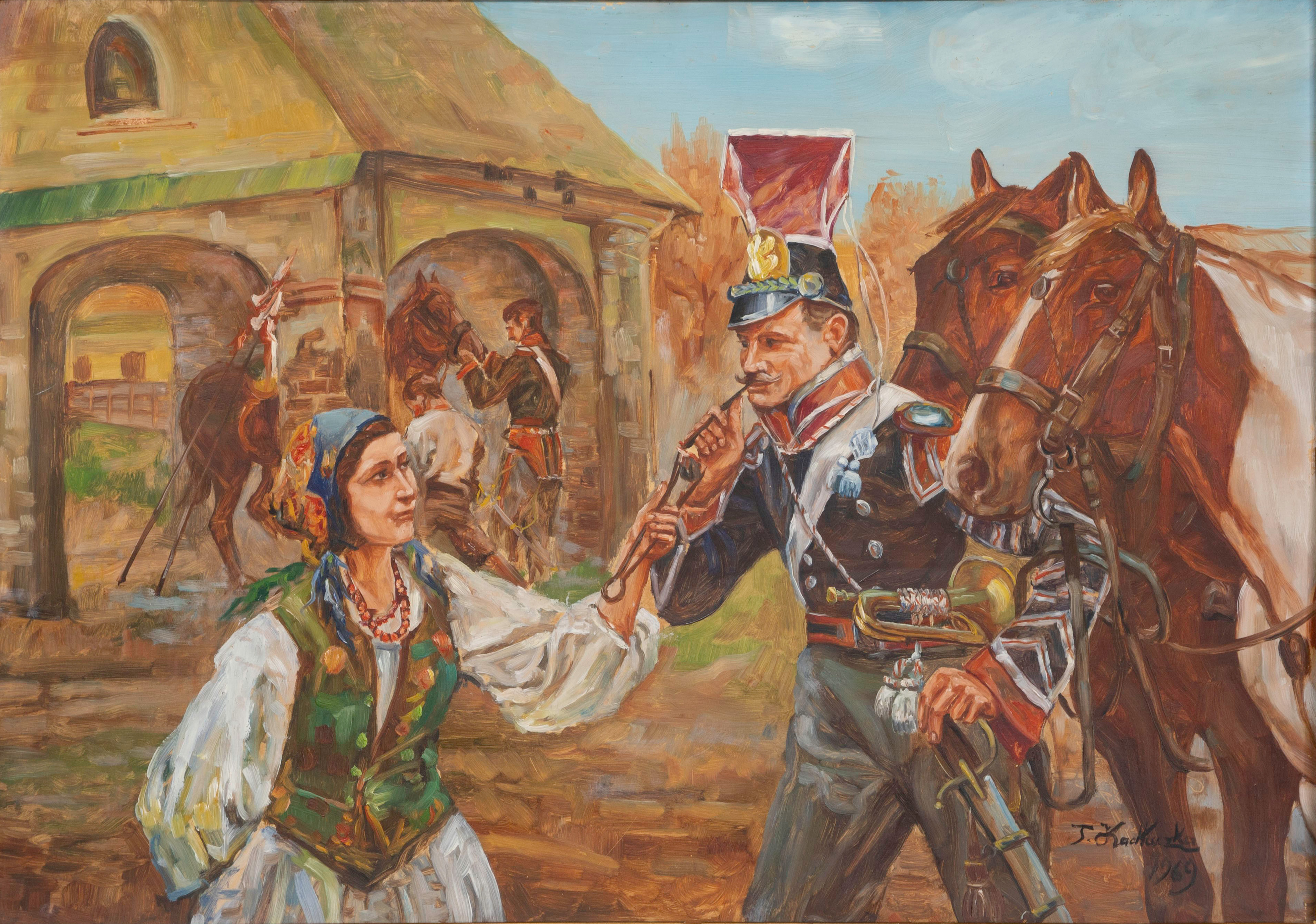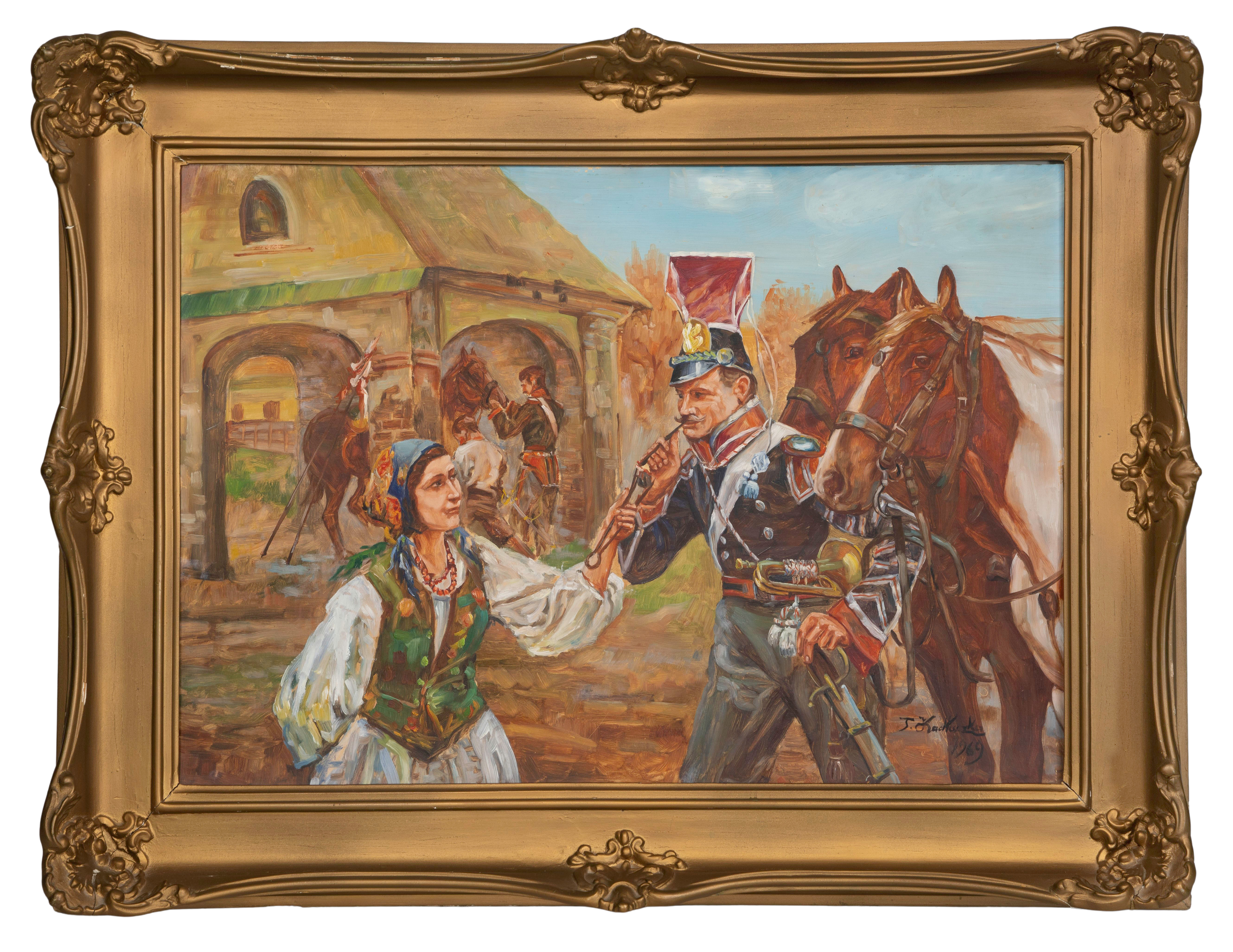 1970, signed lower right, dated below Polish language rubber stamp verso, depicting a woman lighting a military officer’s cheroot using a hot coal held in tongs, in a gold-tone composite on wood frame