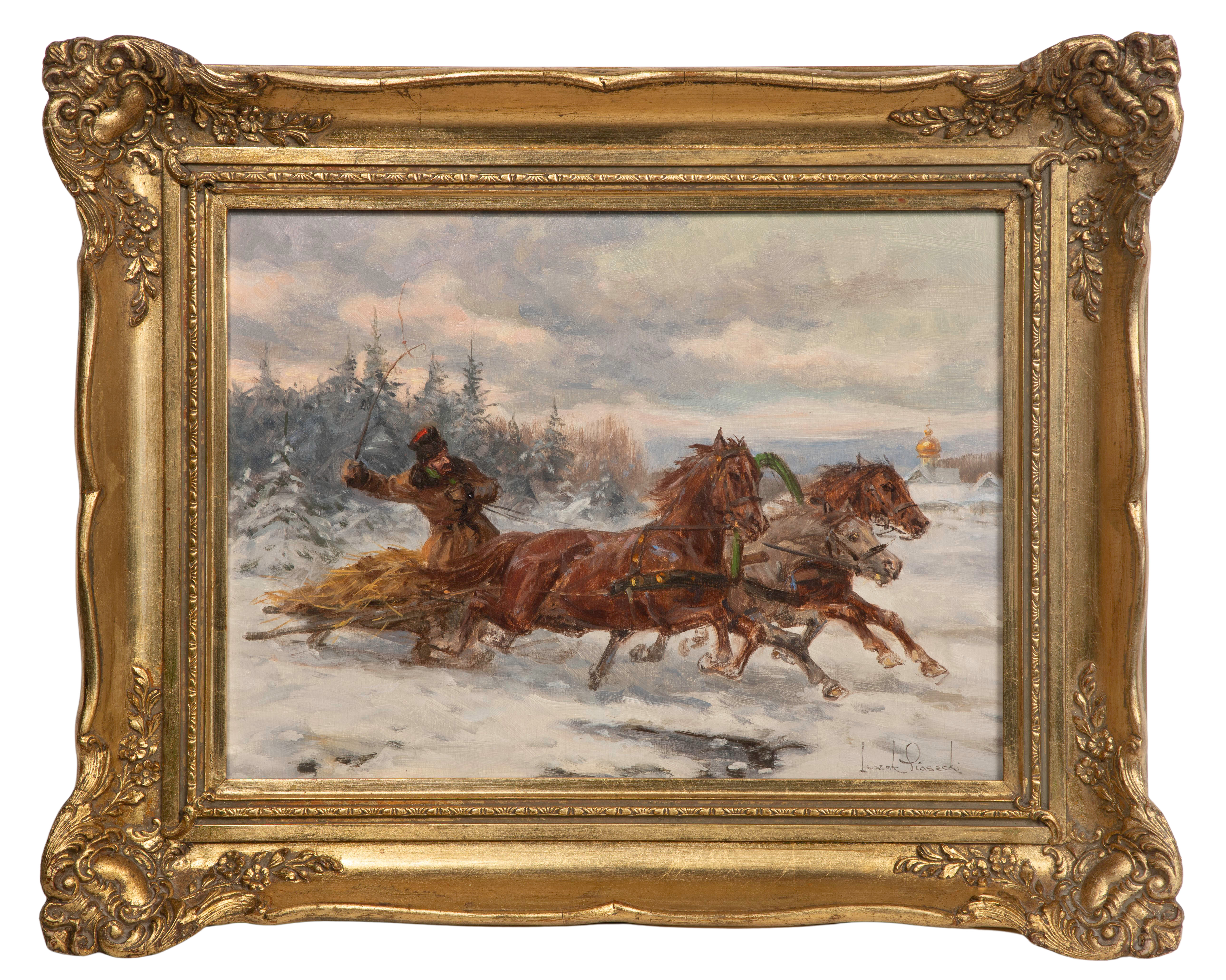 Undated, signed lower right, depicting a man on a horse-drawn sleigh, in a gold-tone composite on wood frame having Conrad’s Inc. European Antique Importers sticker verso