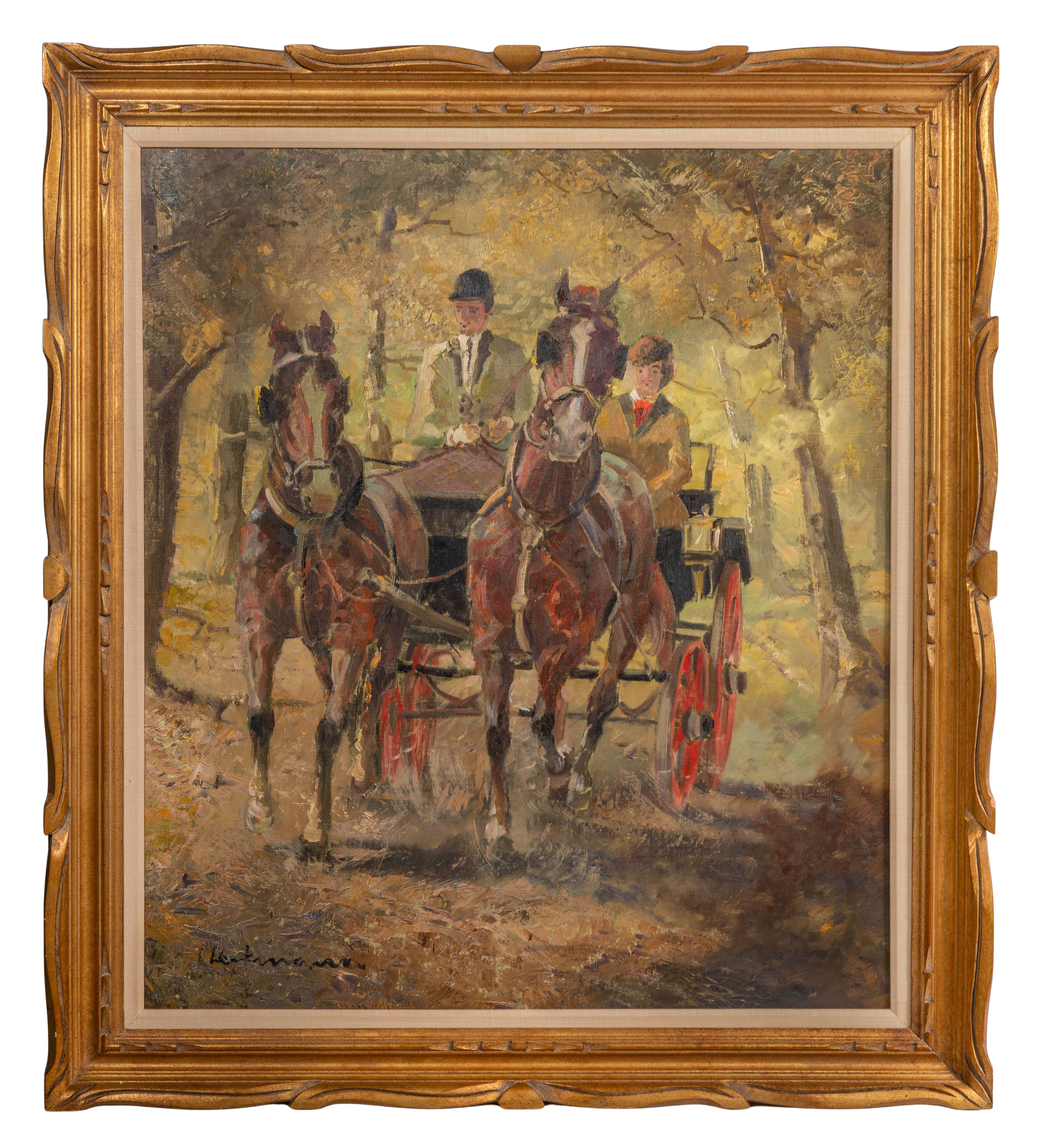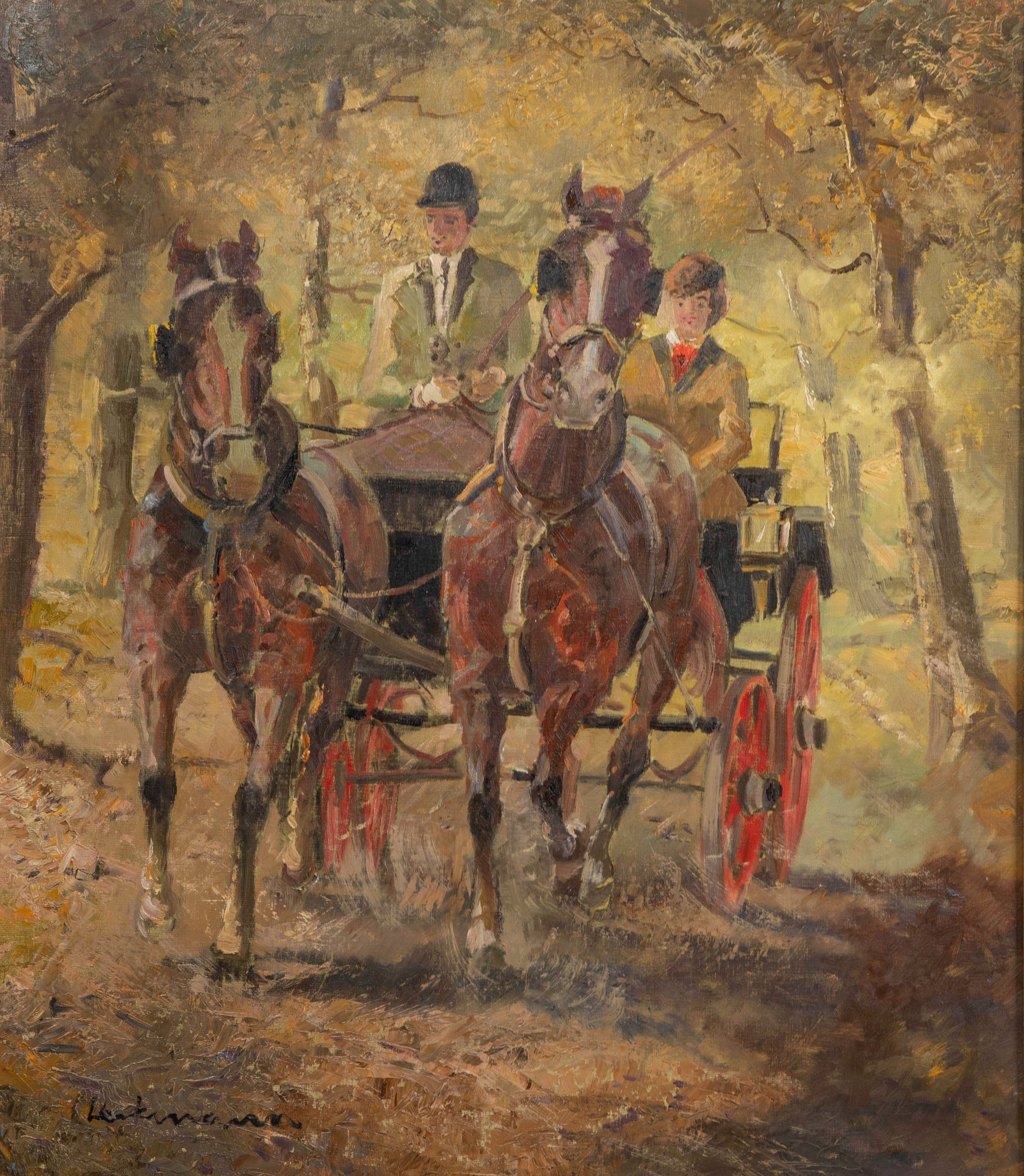 Undated, signed lower left, depicting a horse-drawn carriage, in a gold-tone wood frame having a linen liner, biographical note verso