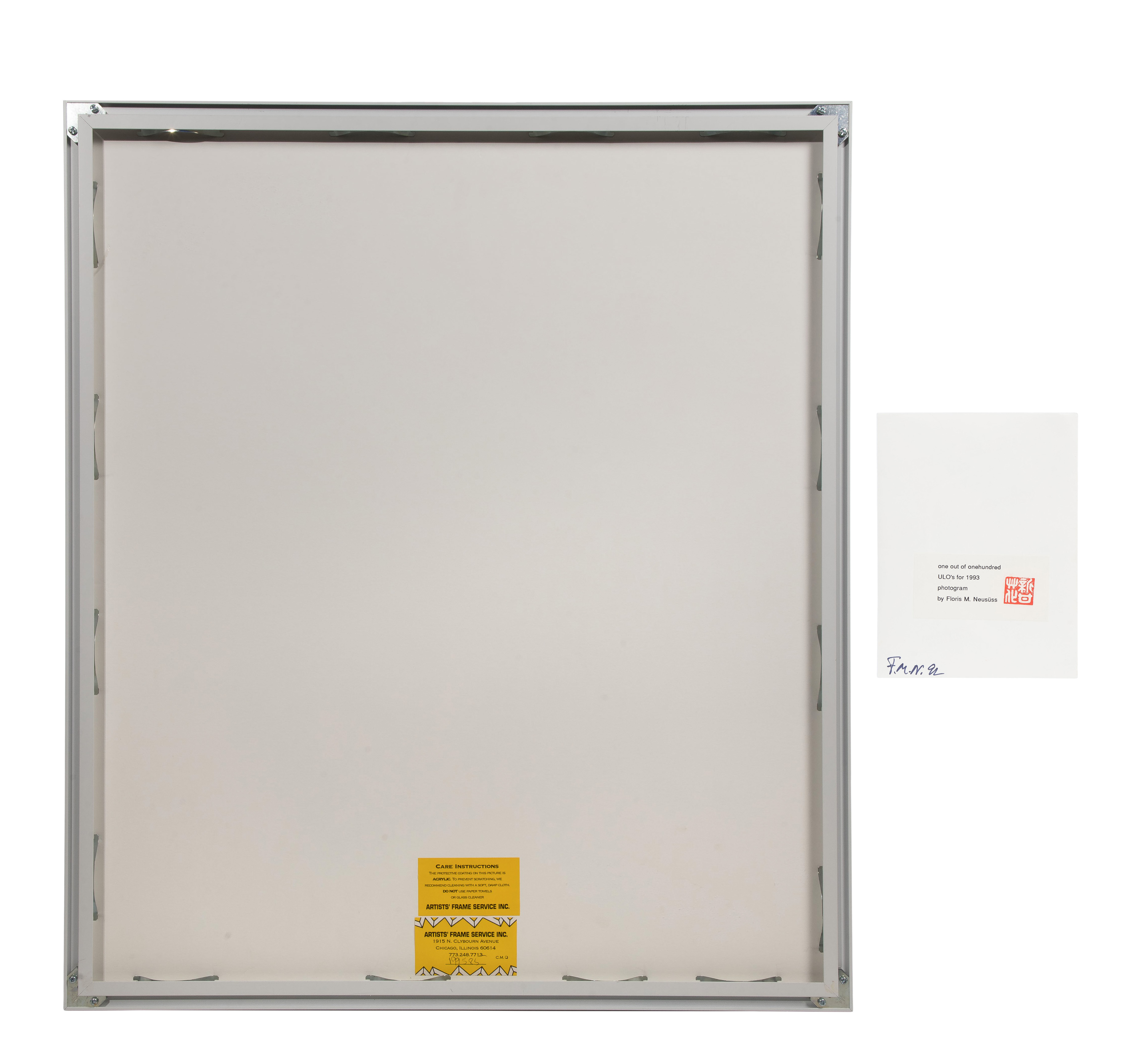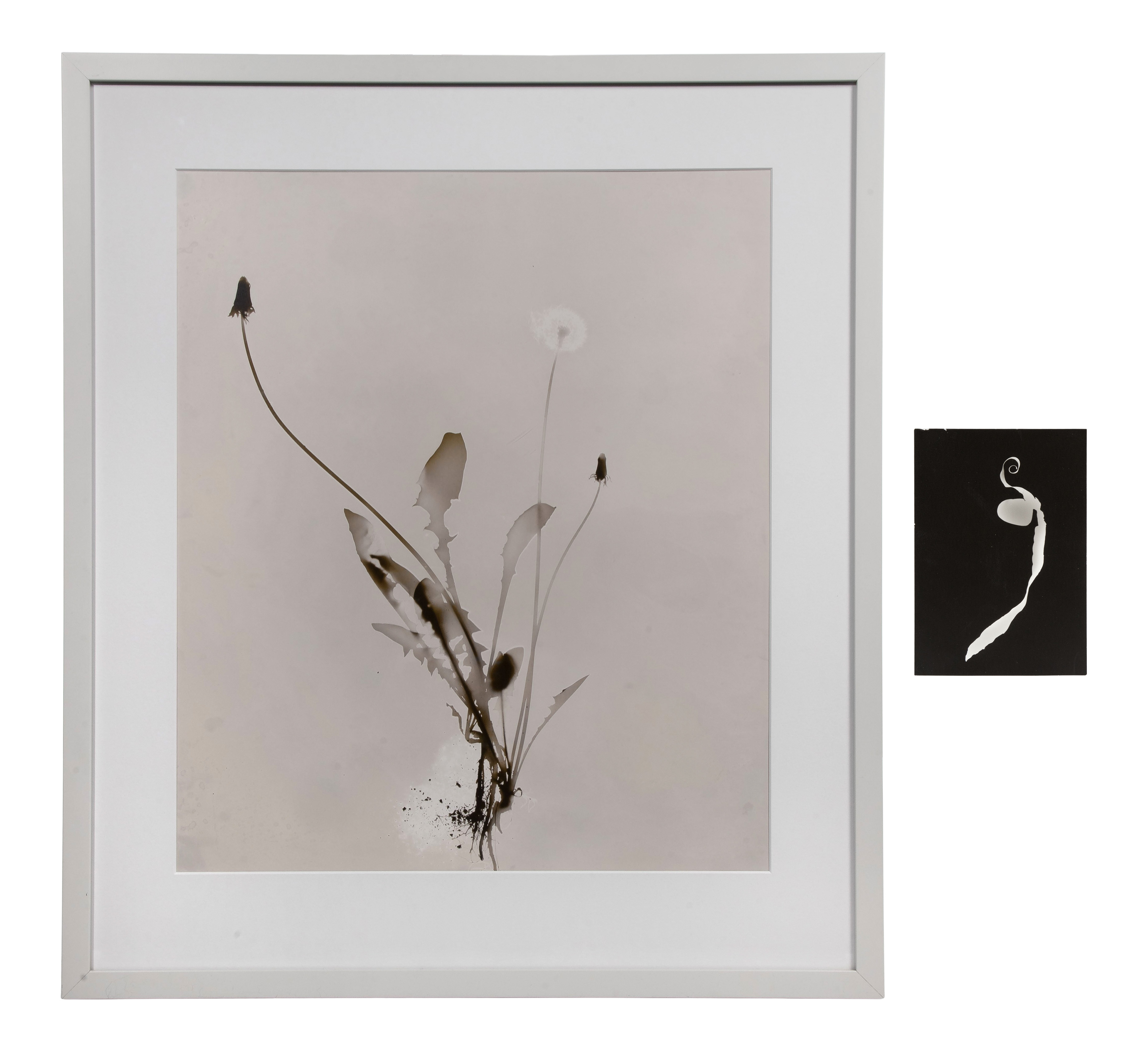 (2) items including an undated and unsigned photogram of a dandelion created without a camera by placing the object directly on a photosensitive sheet, matted behind acrylic in a painted metal frame, and a 5.75 x 4-inch photogram initialed in ink and having a printed label verso, reading ‘one out of one hundred / ULO’s for 1993 / photogram / by Floris M. Neususs’ alongside a red chopmark, in an envelope having the artist’s information
