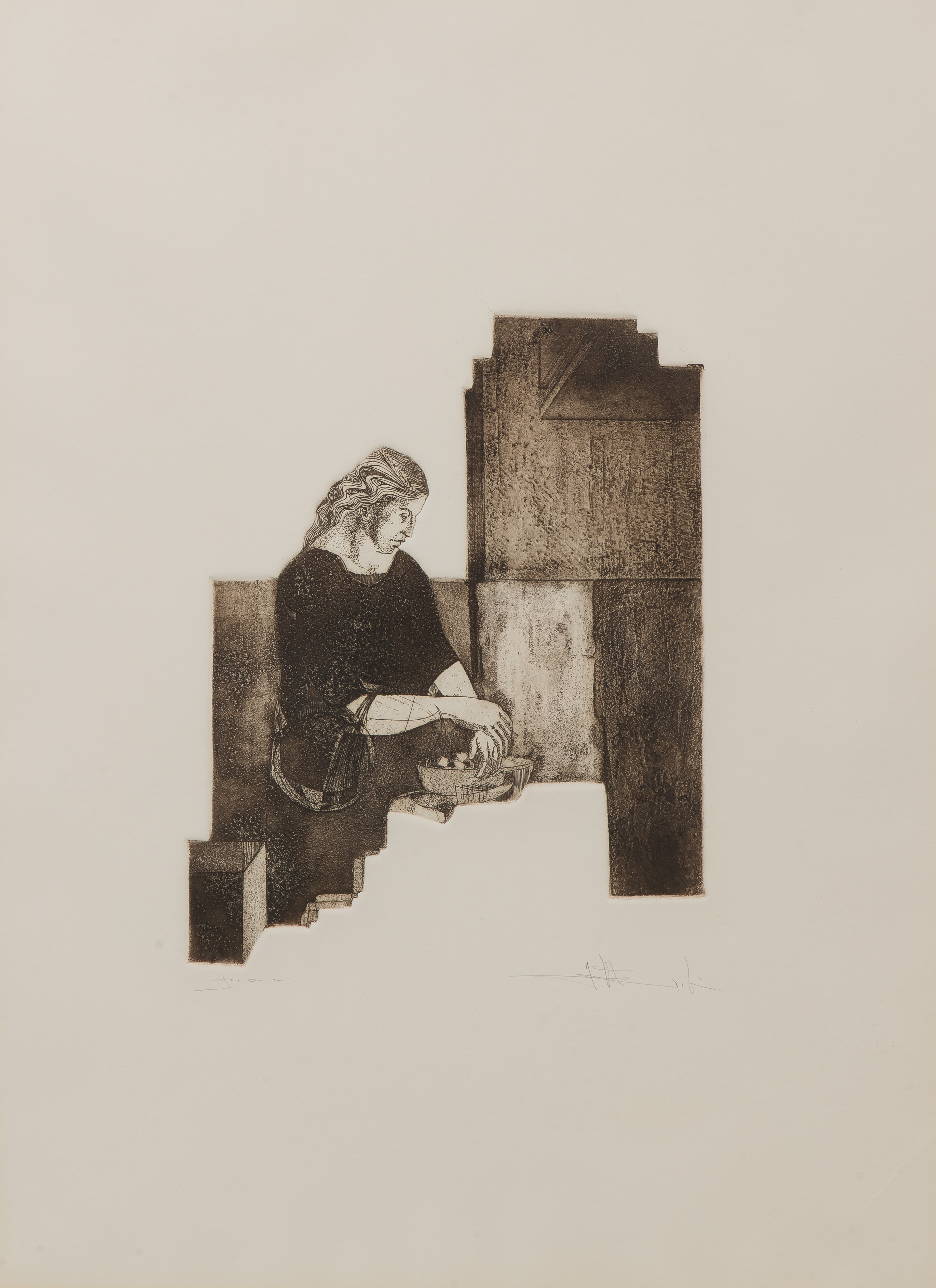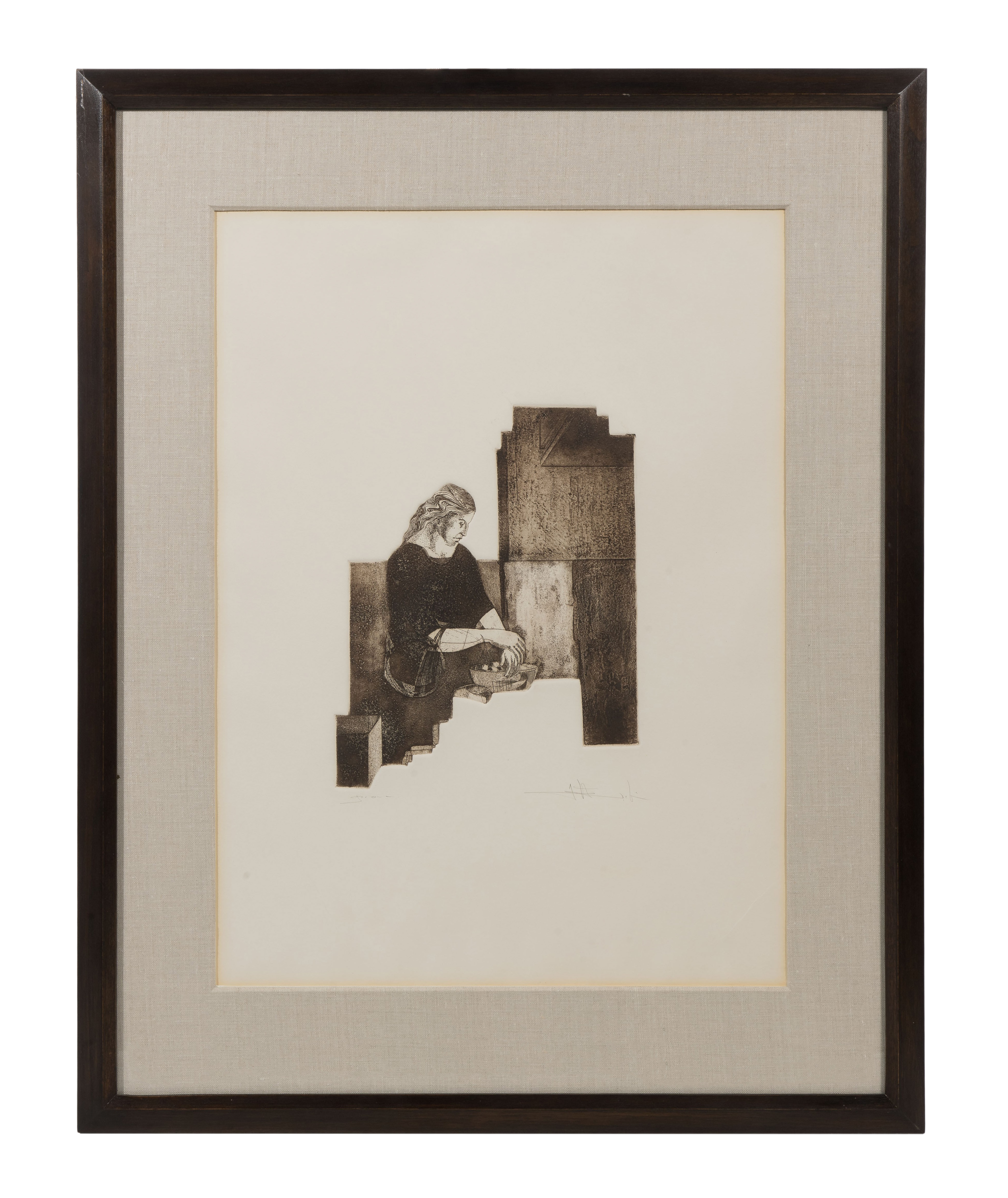 Undated, illegibly pencil signed and annotated depiction of a figure, on an irregularly shaped plate, leaving a plate mark of variable dimensions which runs along edges of image, linen matted behind acrylic in a wood frame