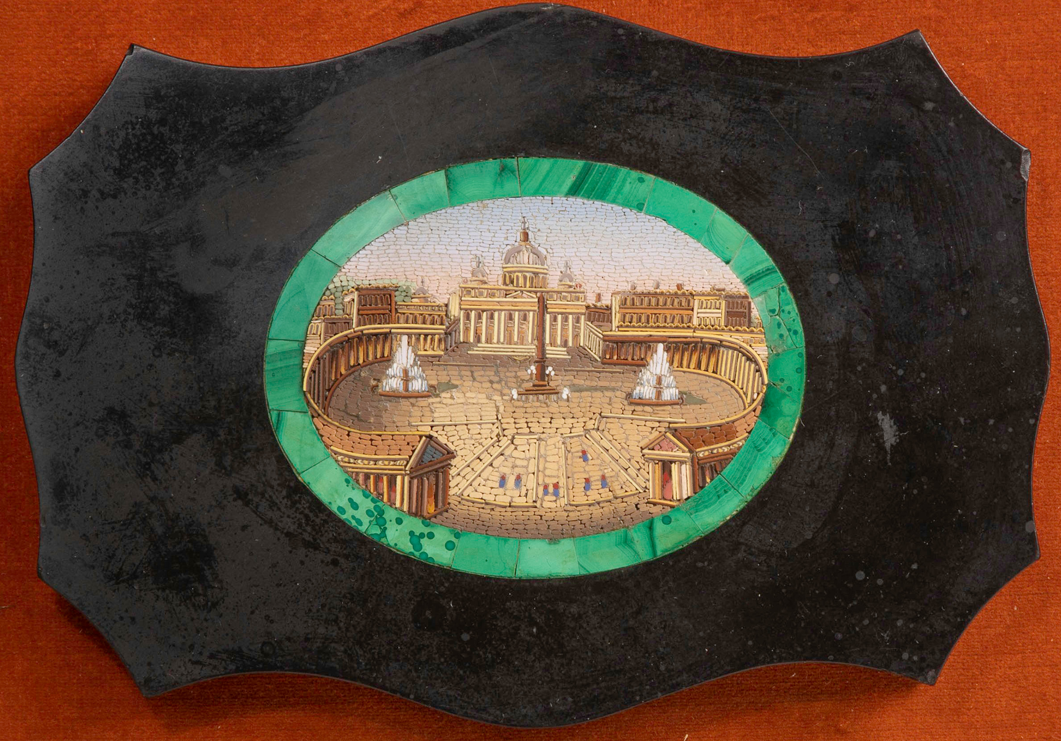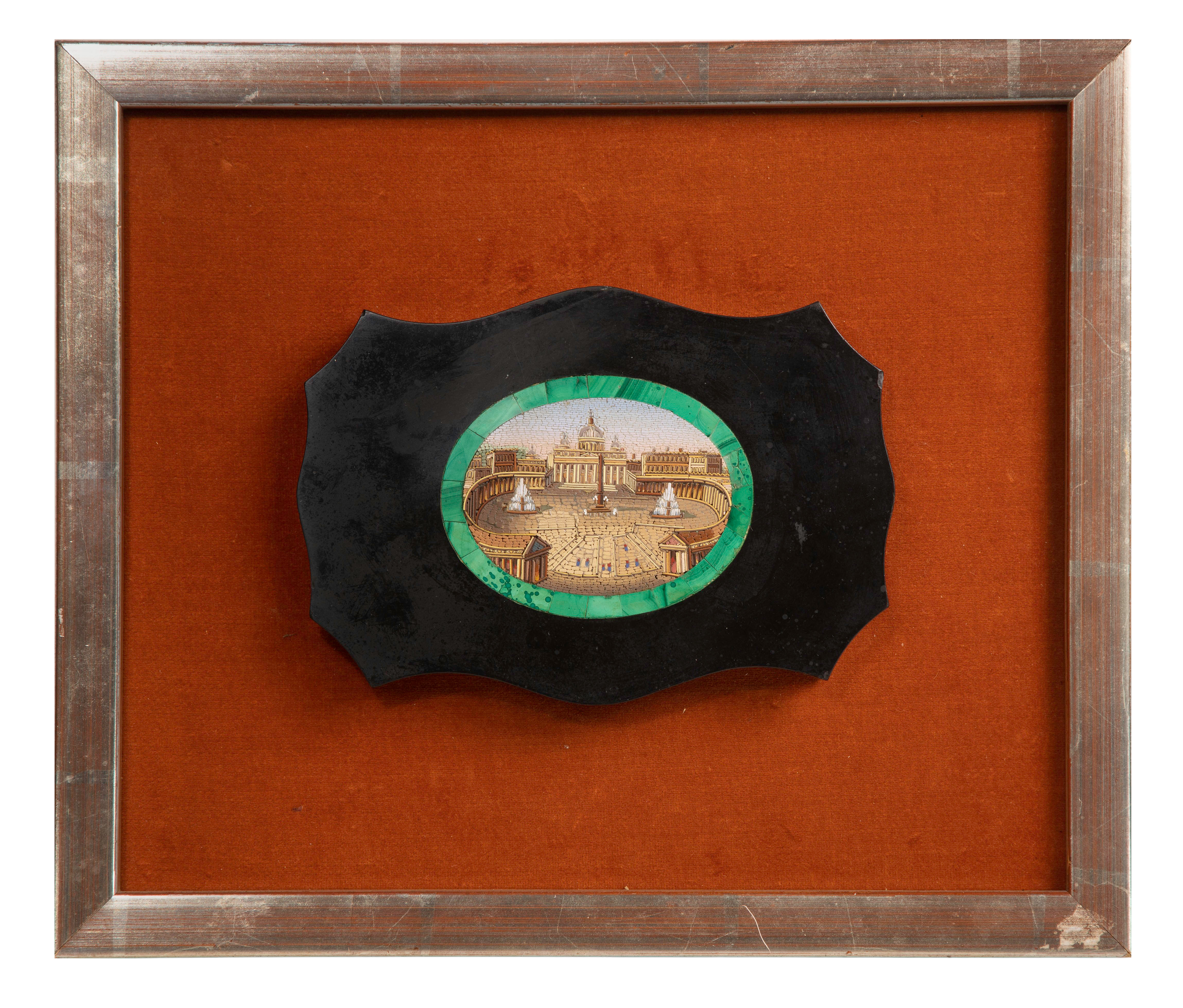 A view of Saint Peter’s Square within a malachite surround in a shaped slate mounted to velvet in a silver-tone wood frame