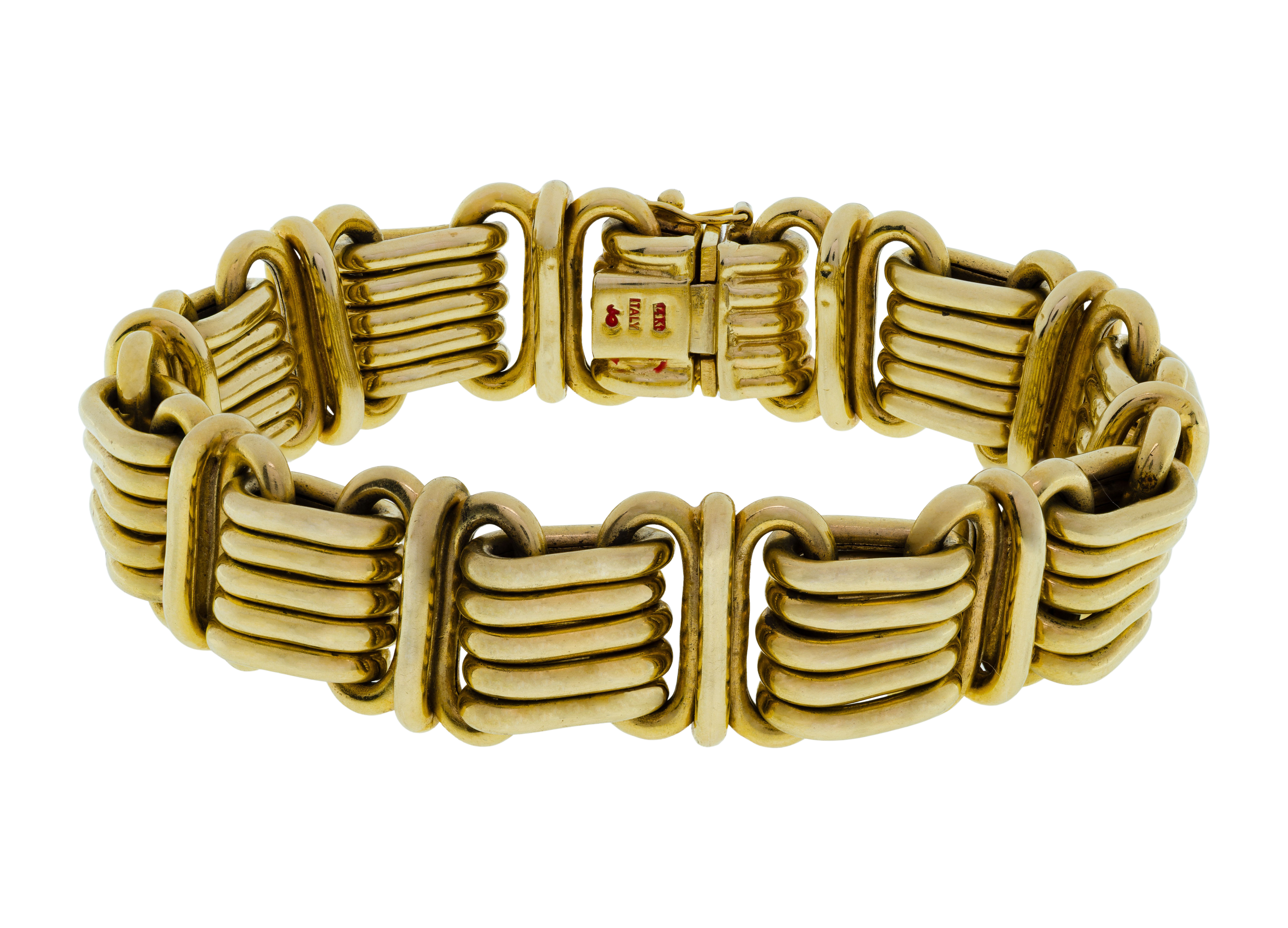 A woven oval link bracelet, 0.75-inch wide (marked ’14k’)