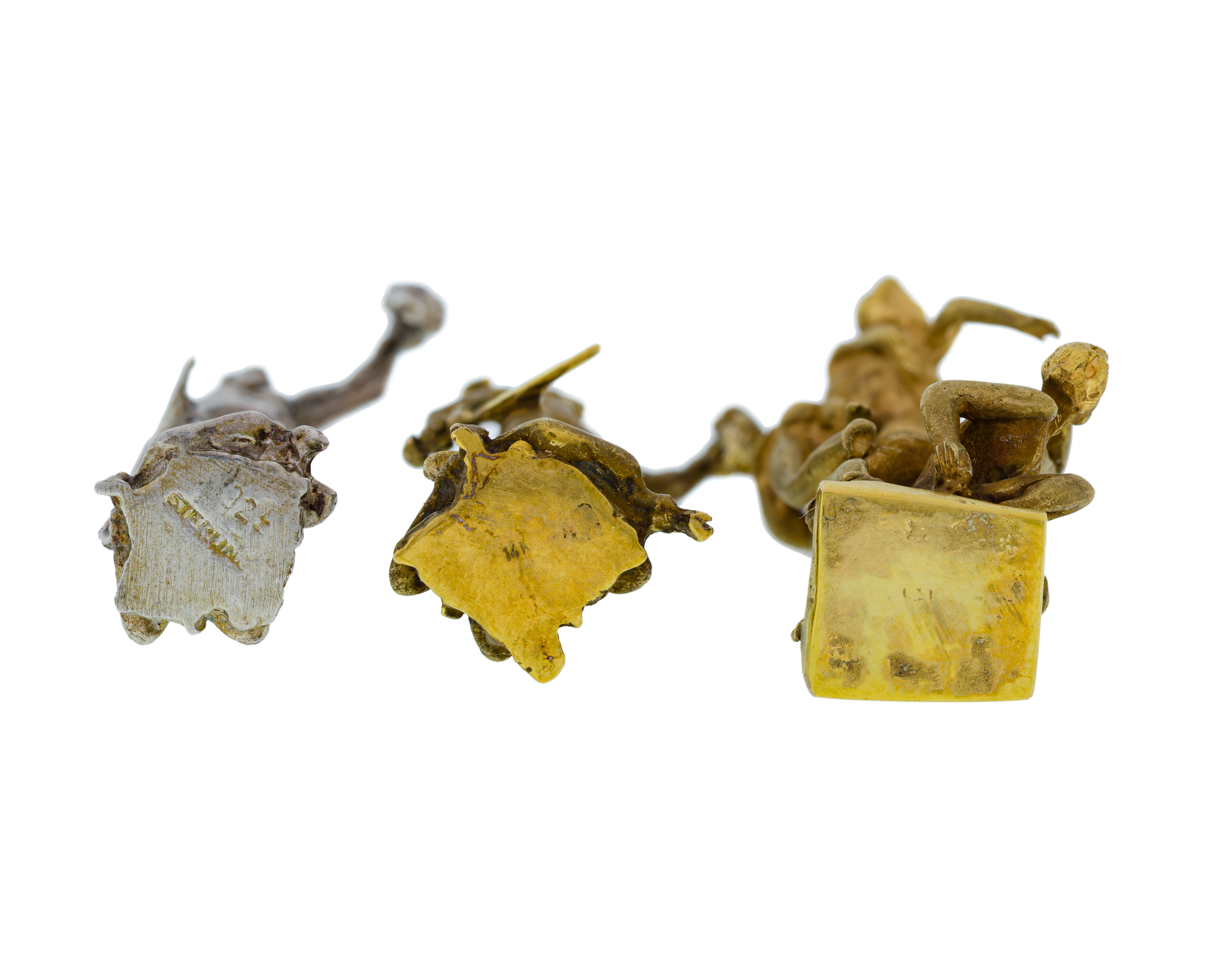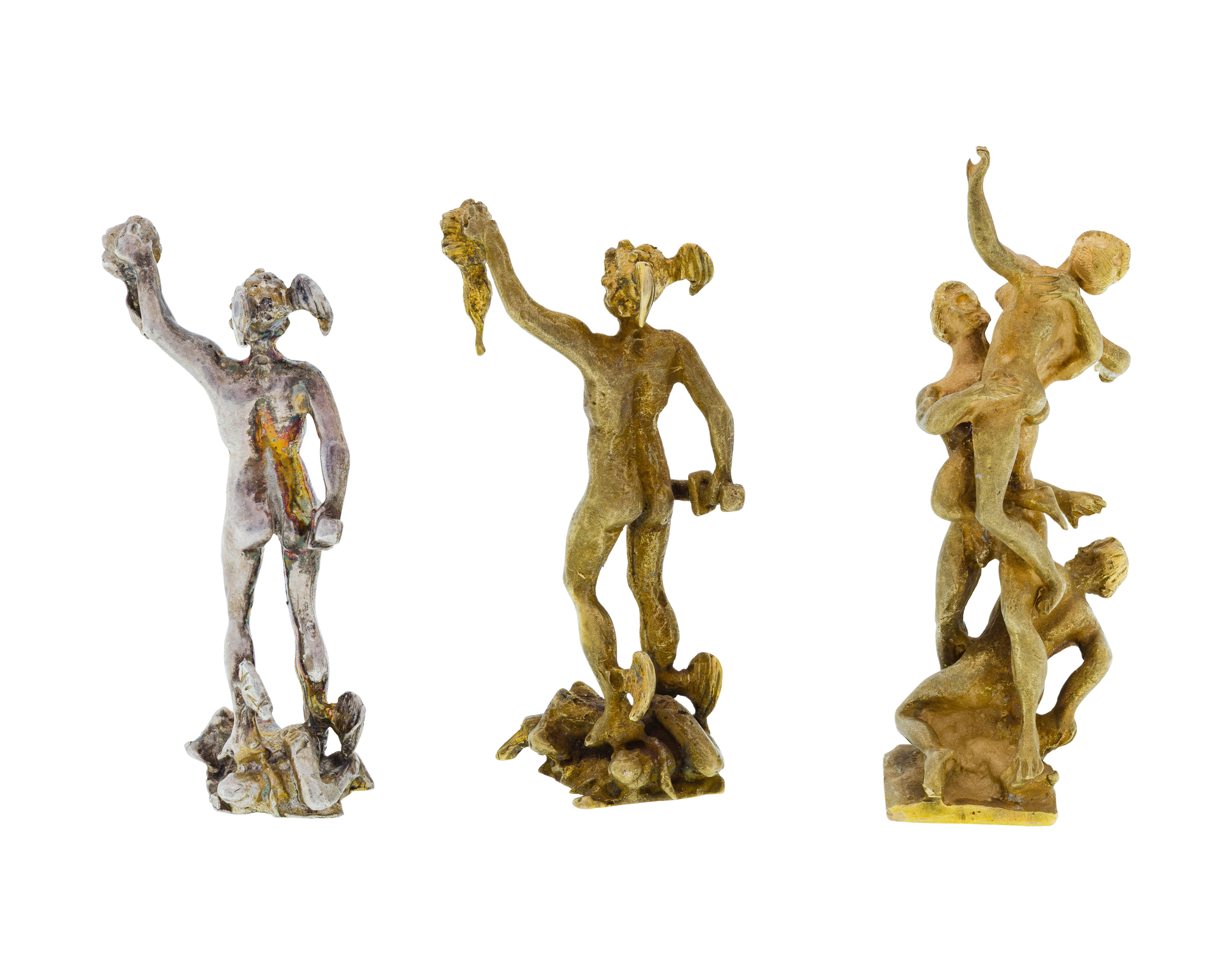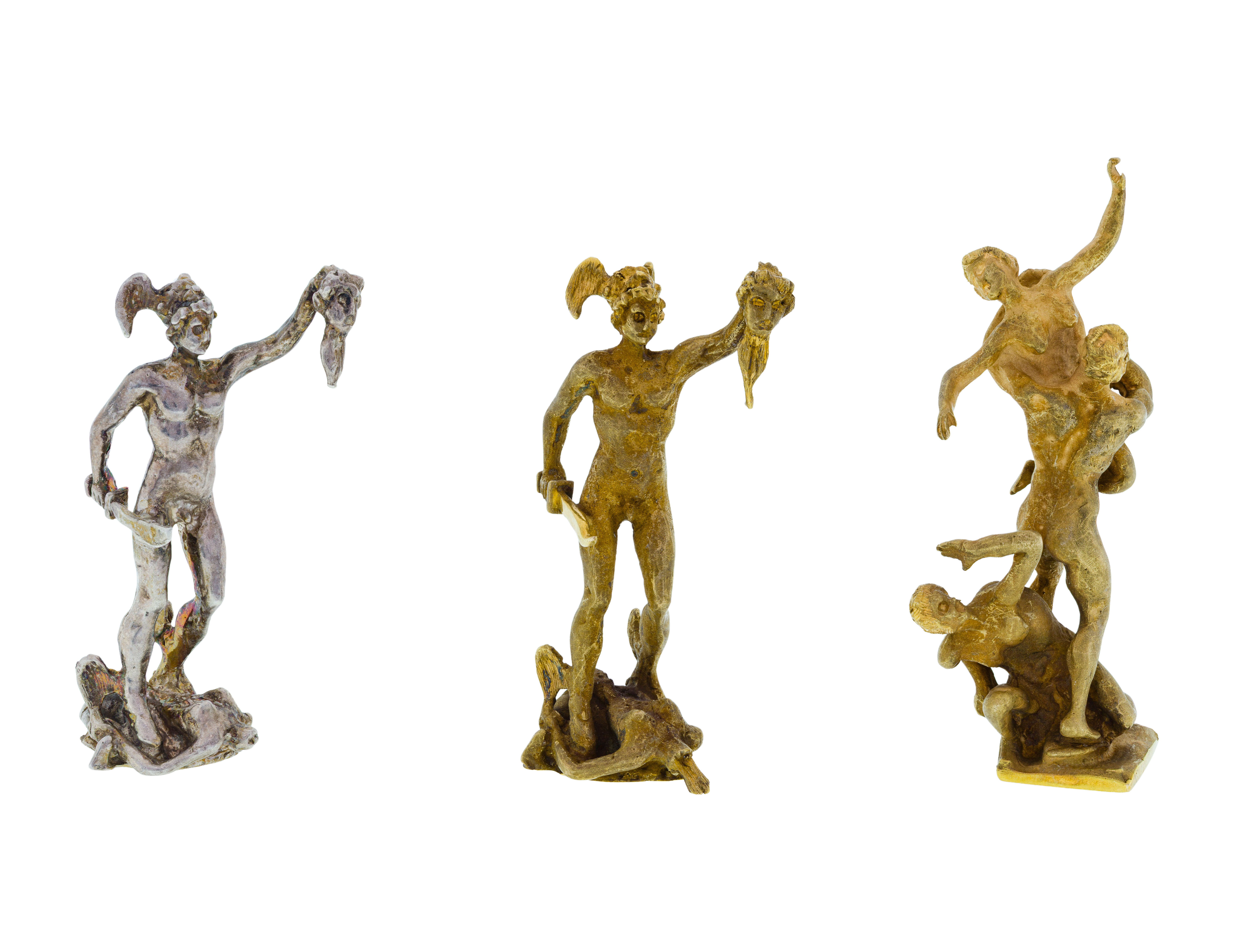 (3) items in miniature, all depicting Renaissance sculptures based on the works of Giambologna (two unmarked 14k gold, one unmarked 0.925 silver)