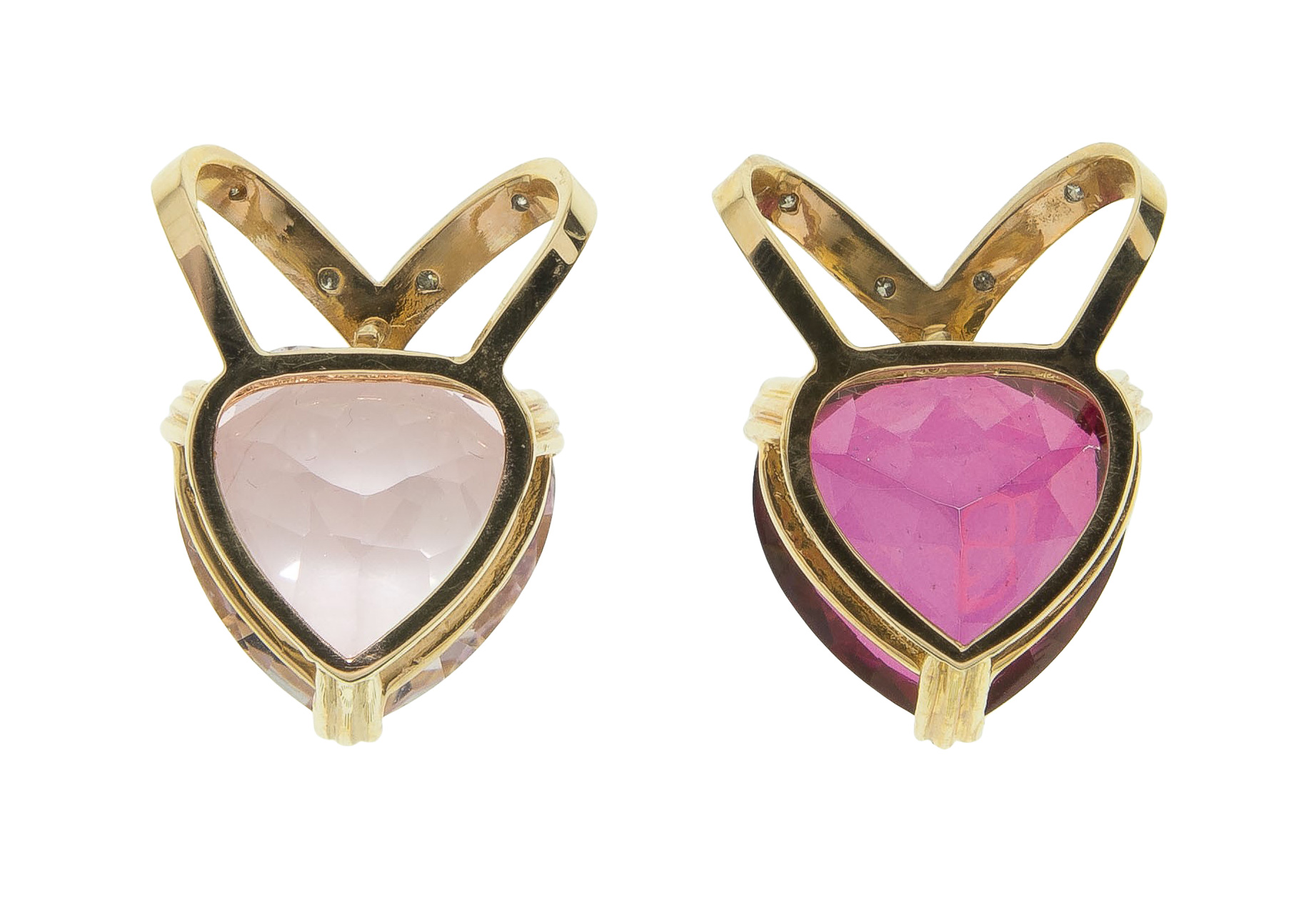 (4) total items including (2) slide style pendants having heart-shaped cut gemstones and diamond accents (marked ’14k’); together with (2) cord necklaces
