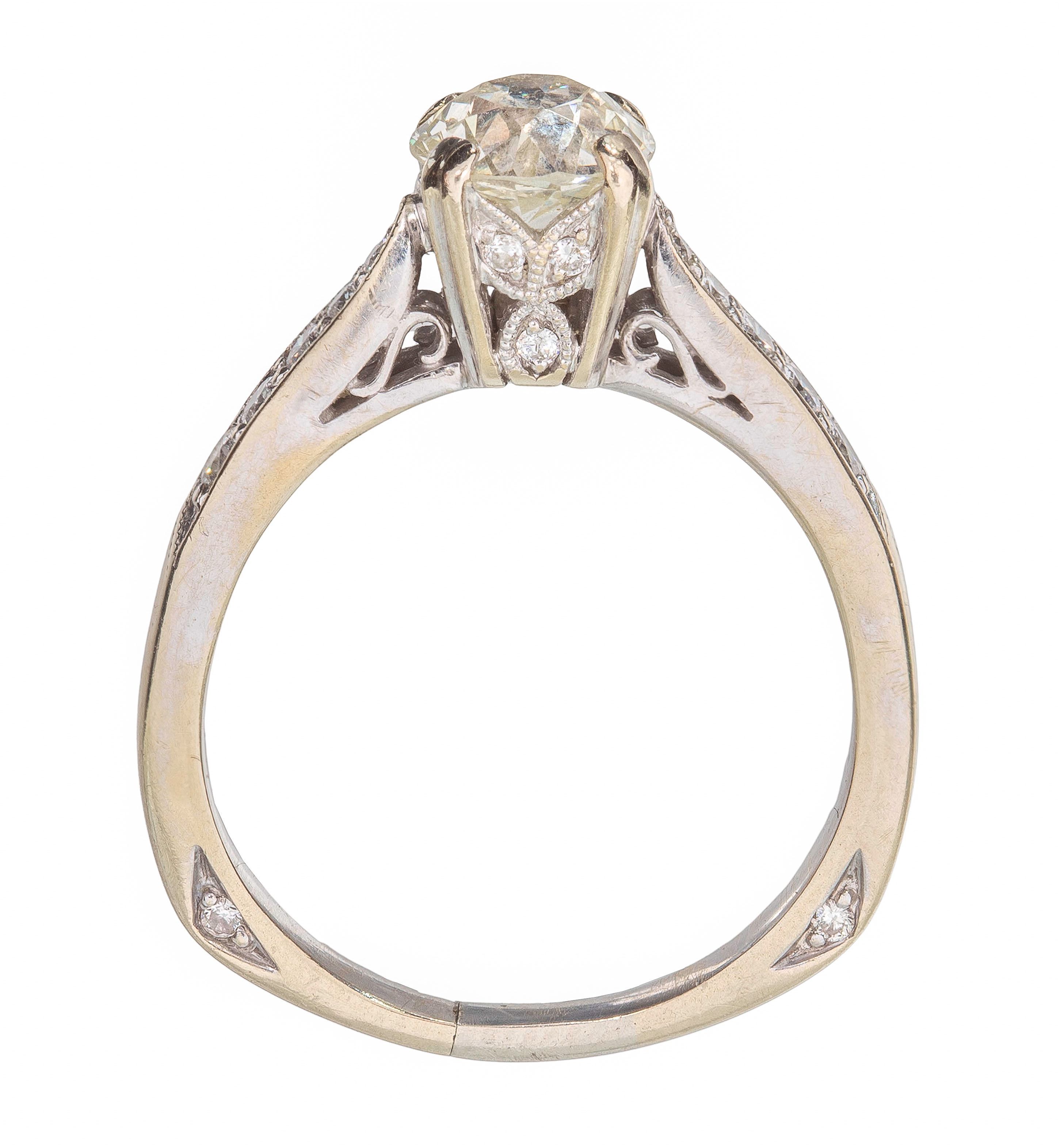 A center old European round cut diamond weighing approximately 1.15 carats, K/L color, SI-2 clarity, having (20) bead set round cut diamonds on shank, in between prongs and on lower portion of ring weighing approximately 0.27 carat total, VS-SI, F-G, in a filigree setting (marked ’18k’ / ‘750’) including presentation box from Bailey, Banks and Biddle and appraisal from Long & Co. Jewelers