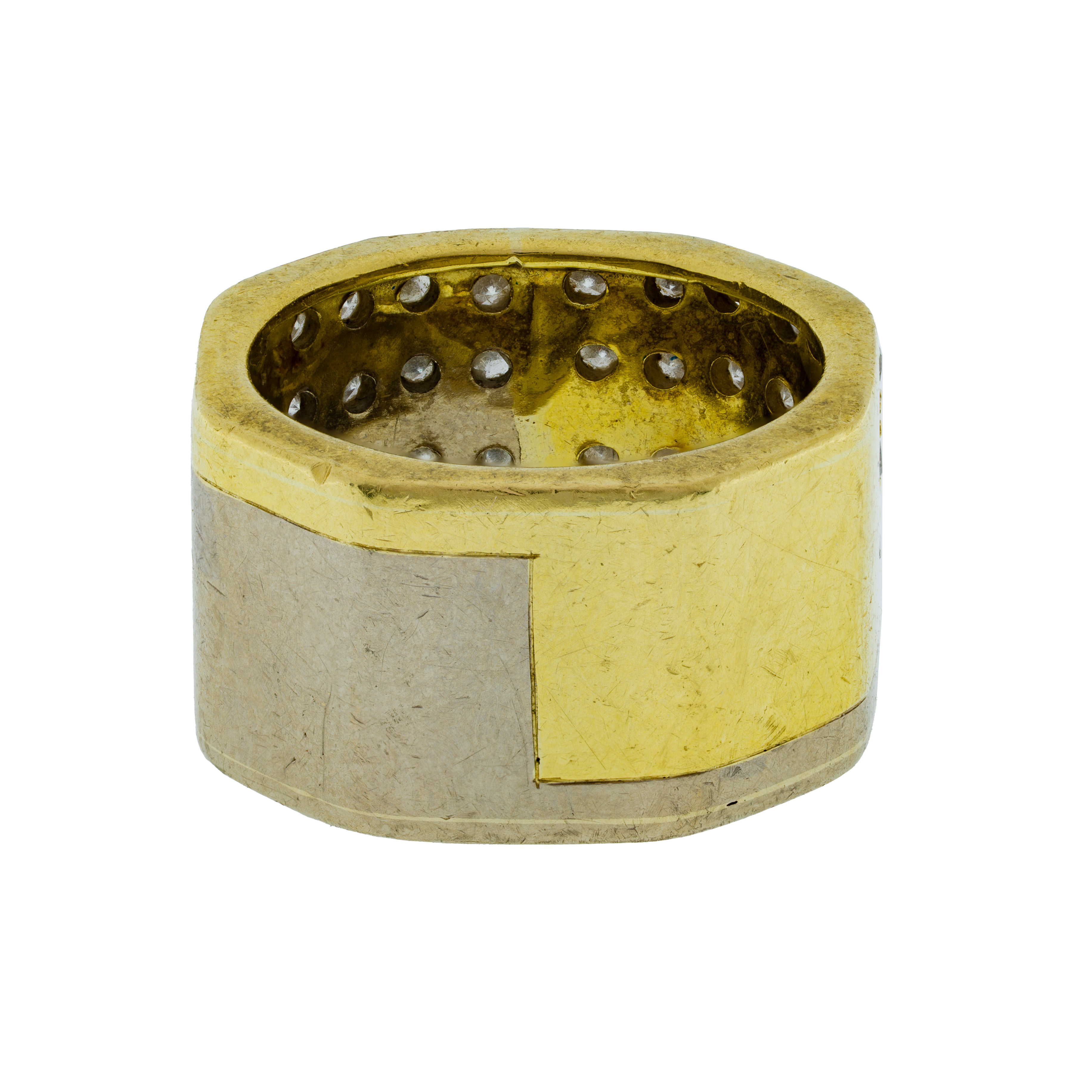 A two-tone band style ring accented by four rows of round cut diamonds (unmarked 18k / 14k)
