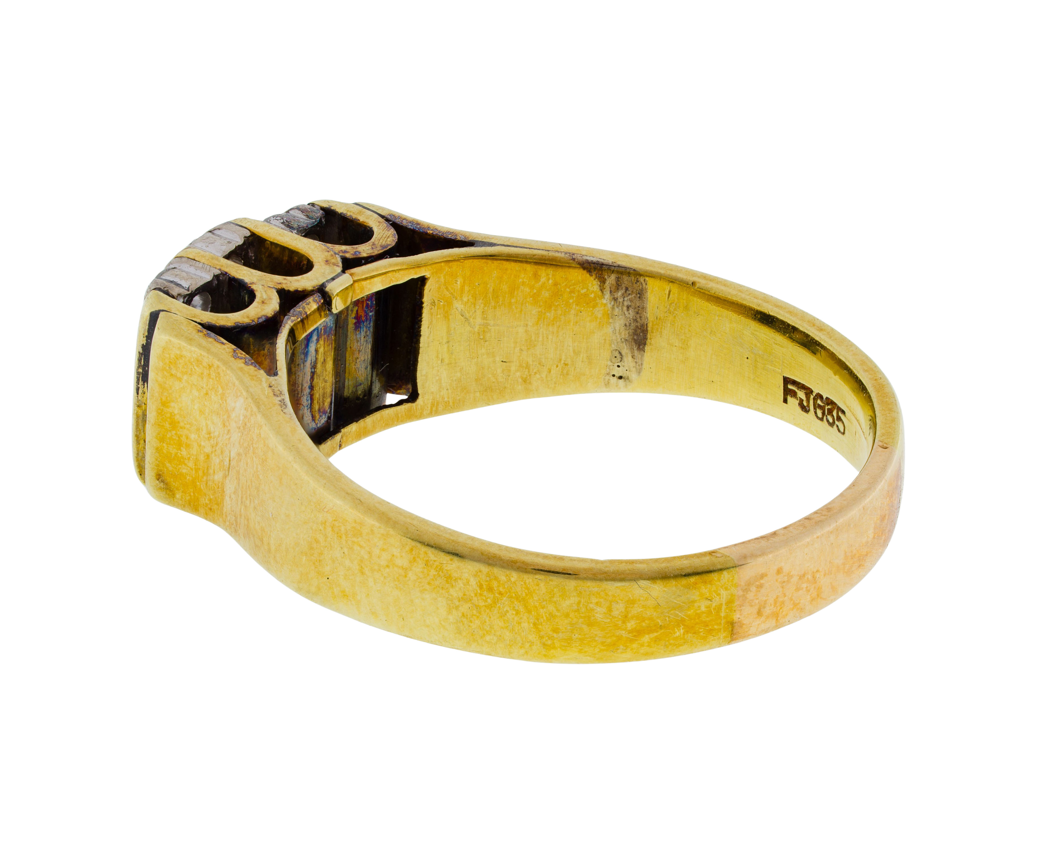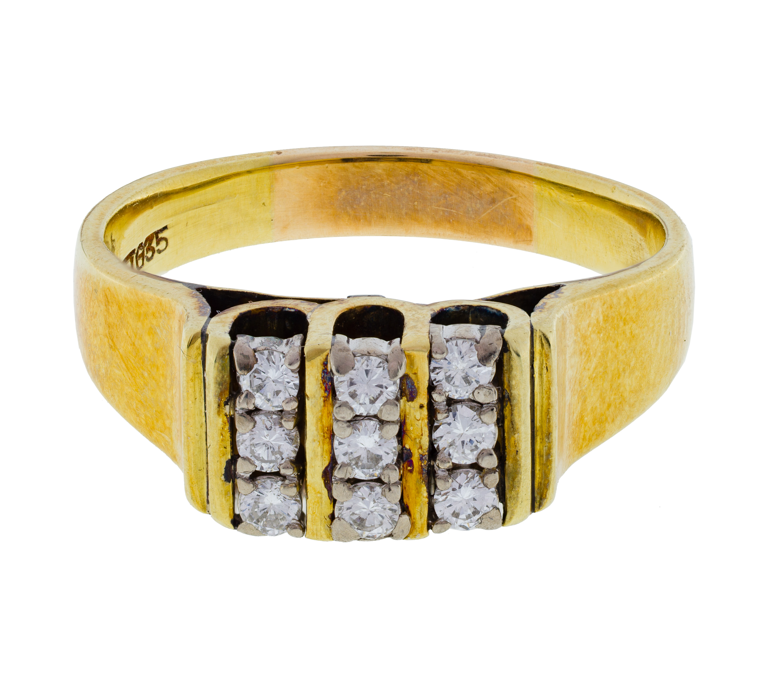 A raised bead setting having three rows of three round cut diamond (marked ’18k’)
