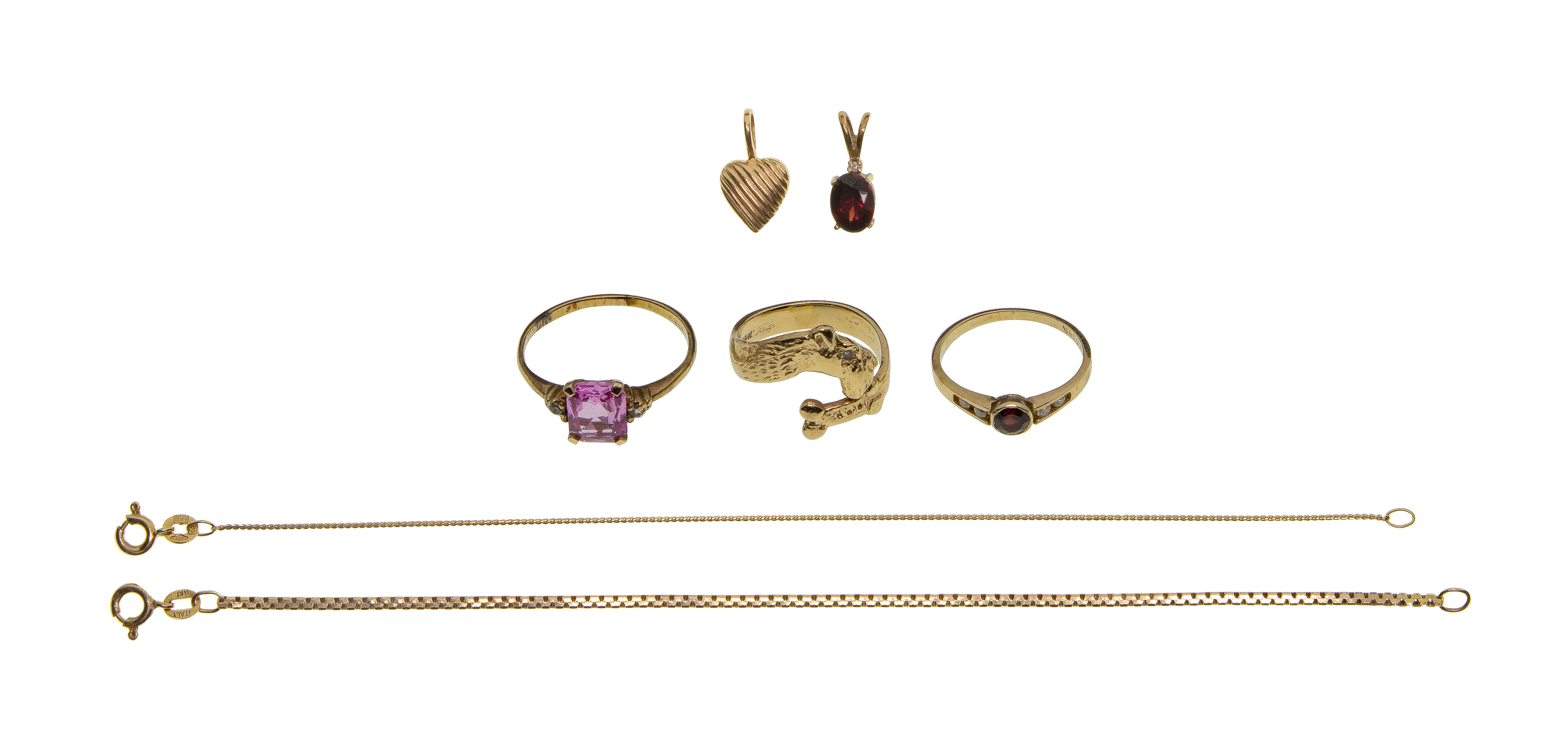 Including (2) rings, (2) bracelets and a heart pendant (all marked ’14k’ / ‘585’) and a pink stone ring and a red stone pendant (marked ’10k’)