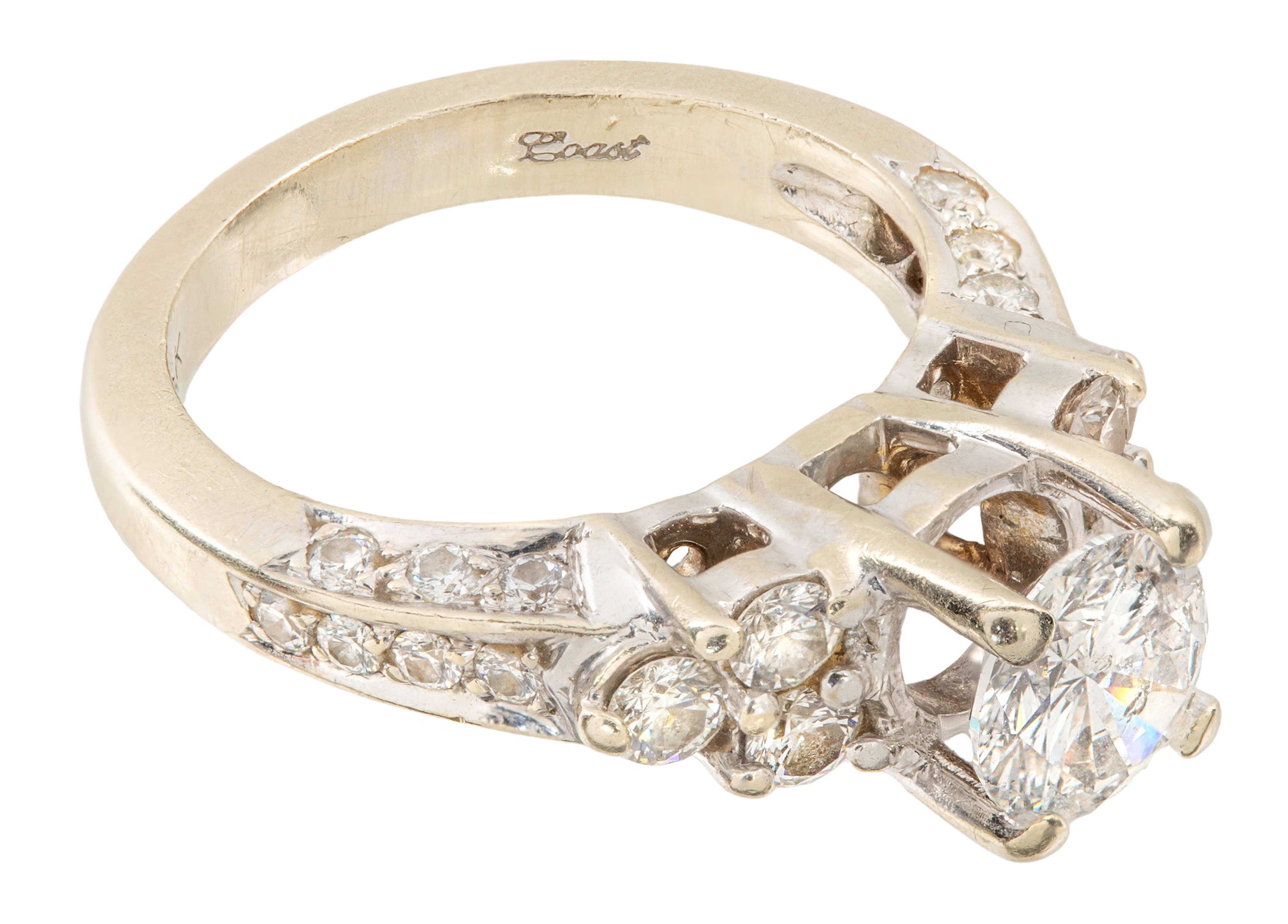 Having a high mount round cut center diamond weighing approximately 1.08 carats, G/H color, I-2 clarity, flanked on each side by three round cut diamonds and a diamond accented shank, side diamonds weighing approximately 0.76 carat total (marked ’14k’)