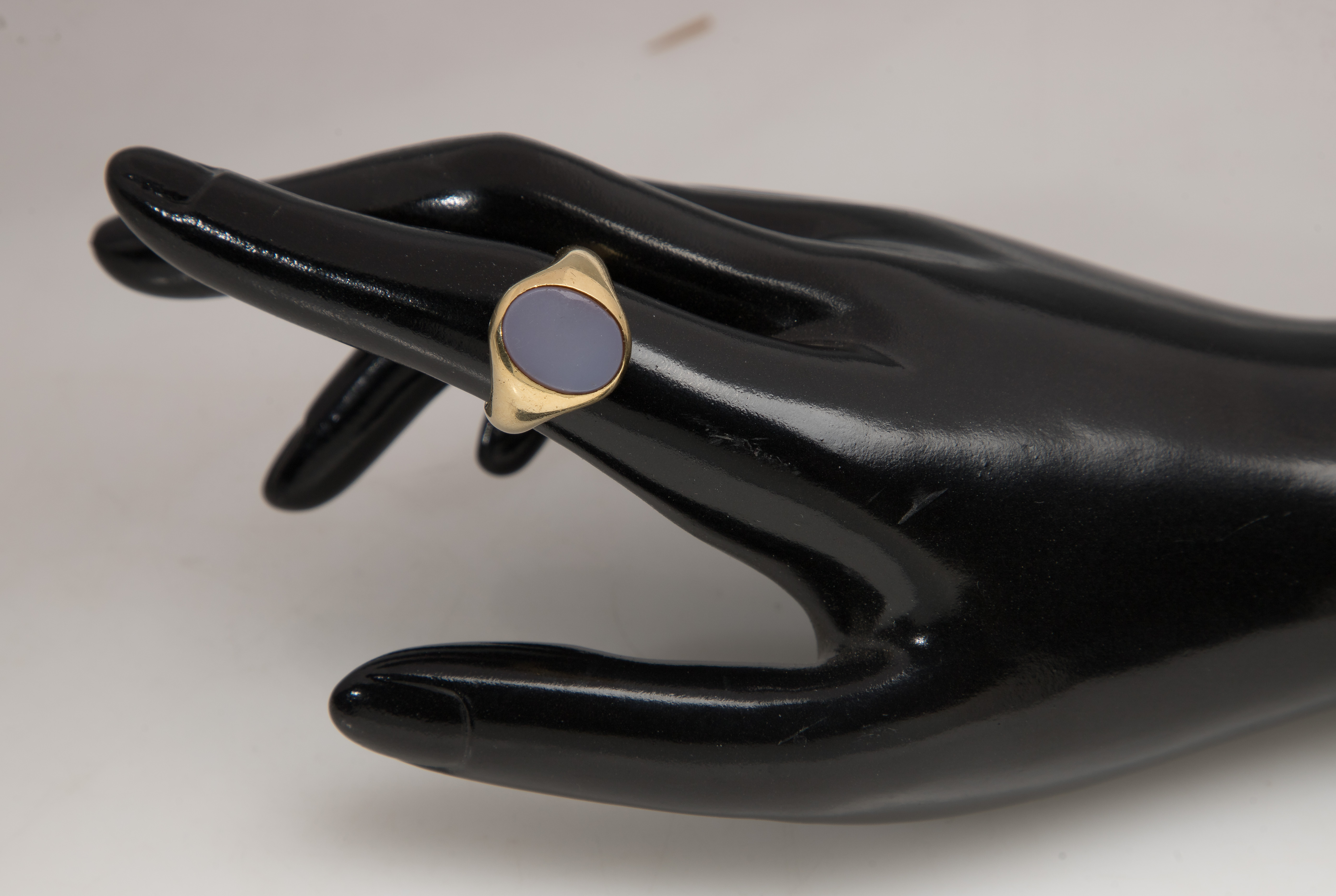 Ring having an oval cut cabochon agate (French mark on outside of shank), storage box from Paris jeweler