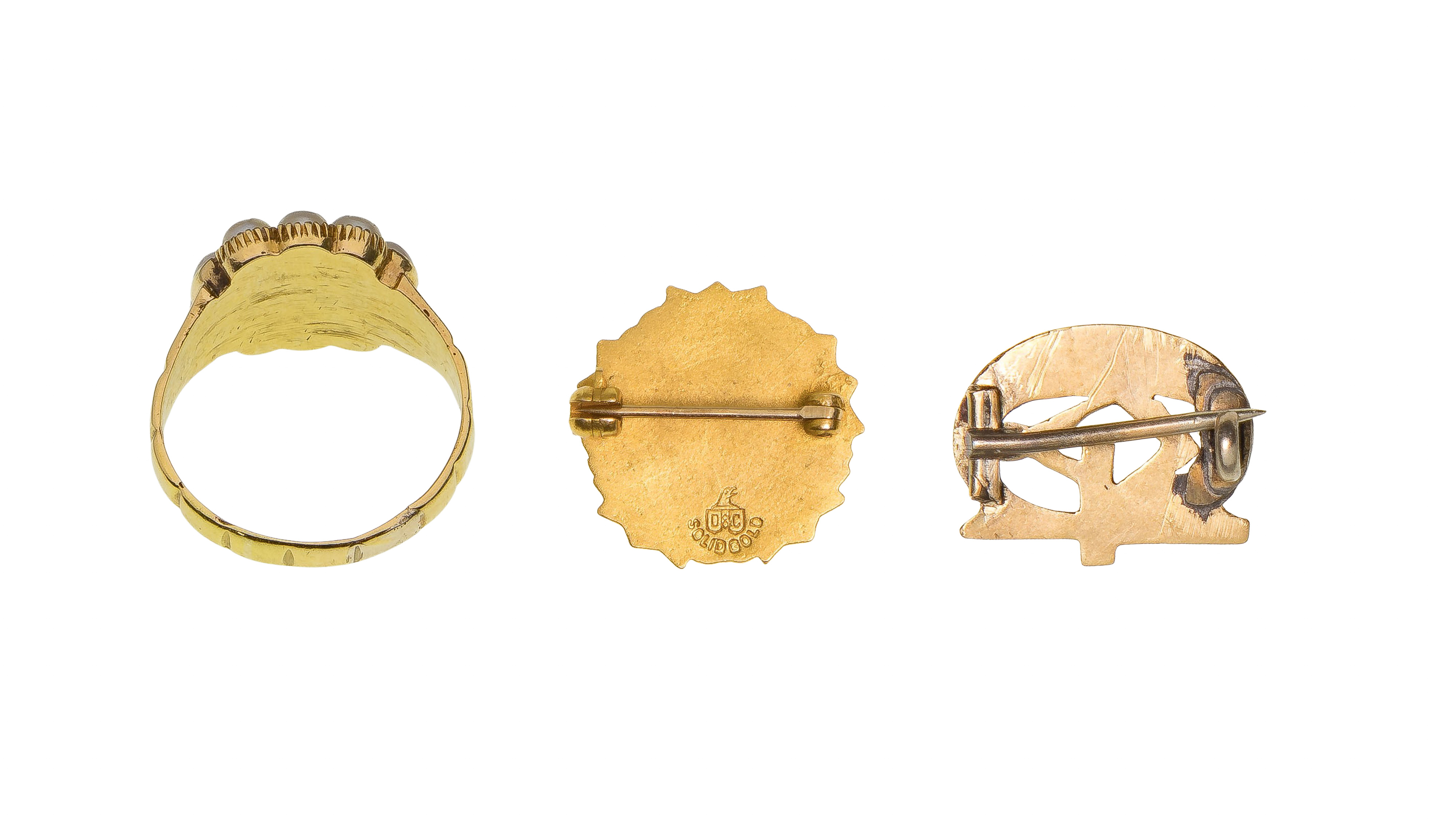 Having an oval cut cabochon center stone encircled by pearls (marked ’18k’); together with service pins including a Masonic and a Remington Typewriter (unmarked 18k)