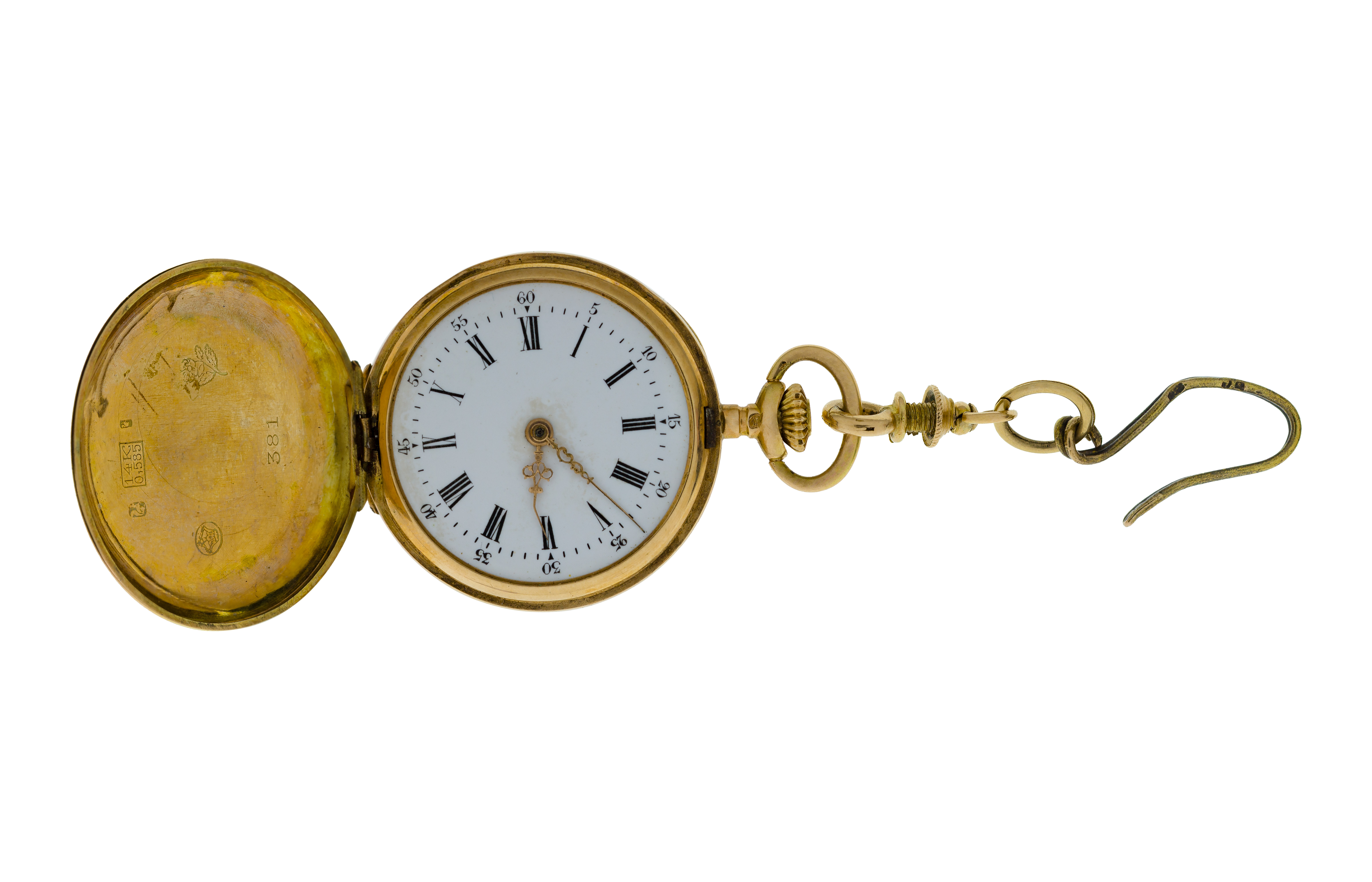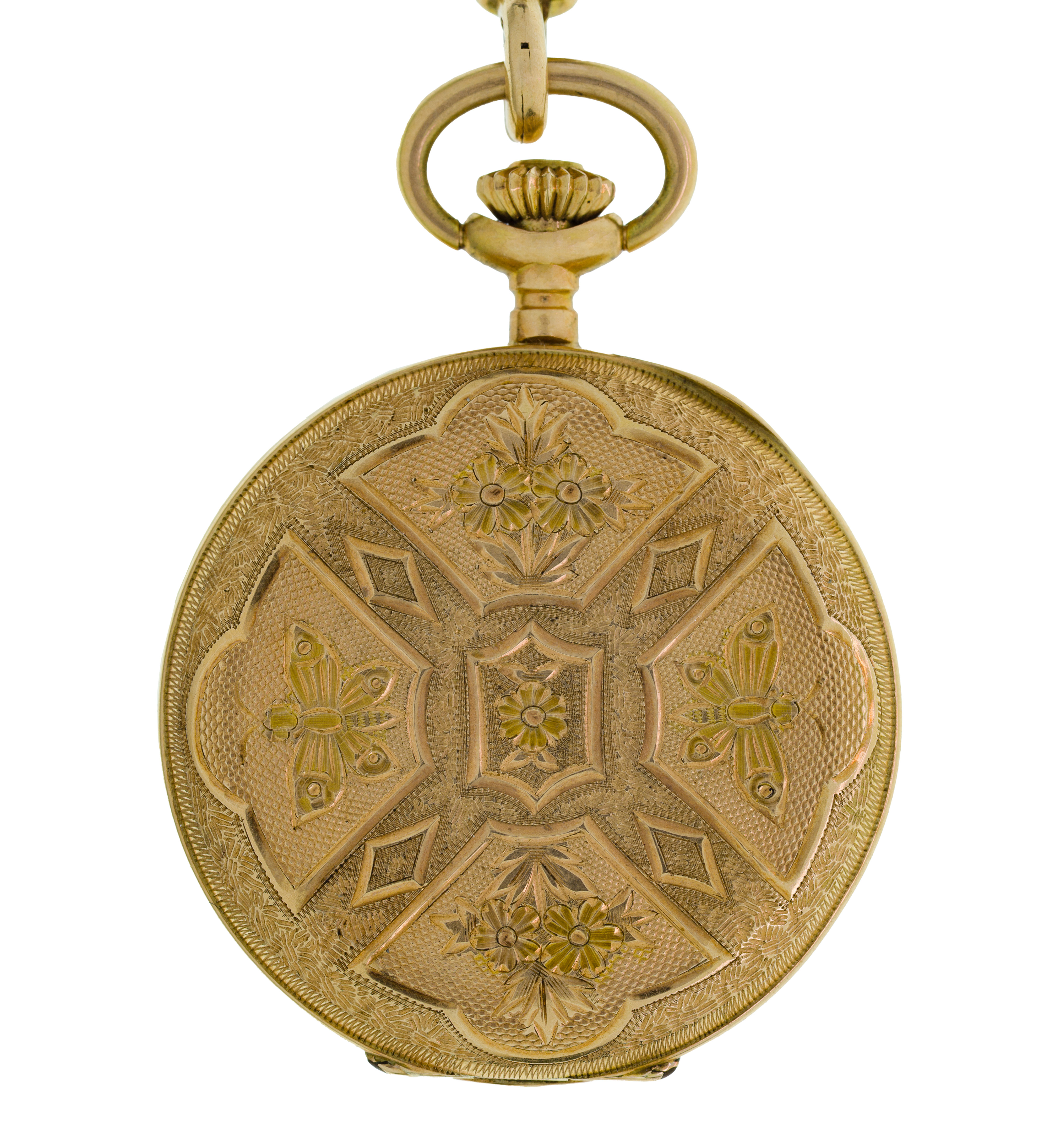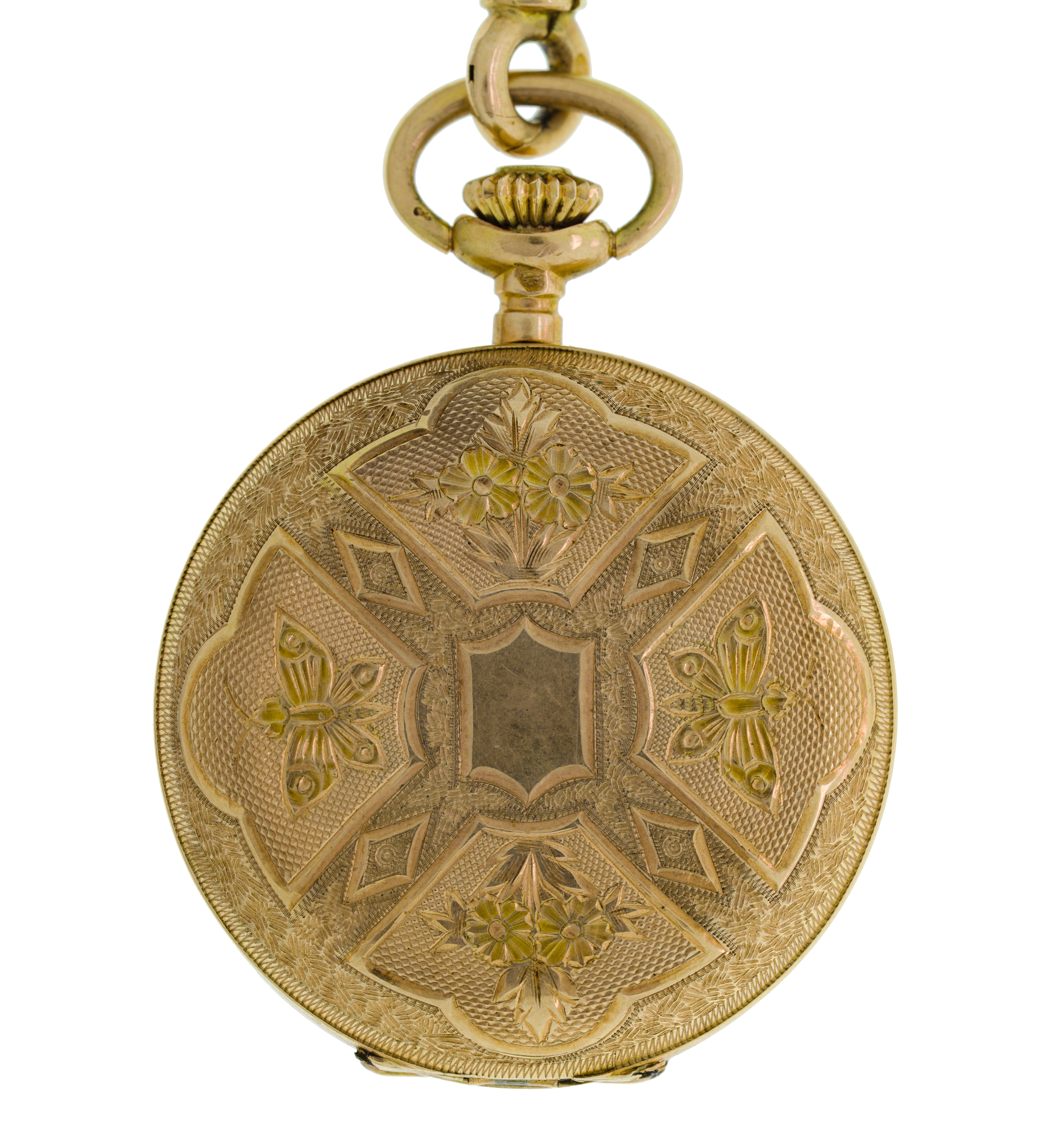 Hand engraved floral pattern, enamel dial, 10-jewel movement, short chain (marked ’14k’ / ‘585’)