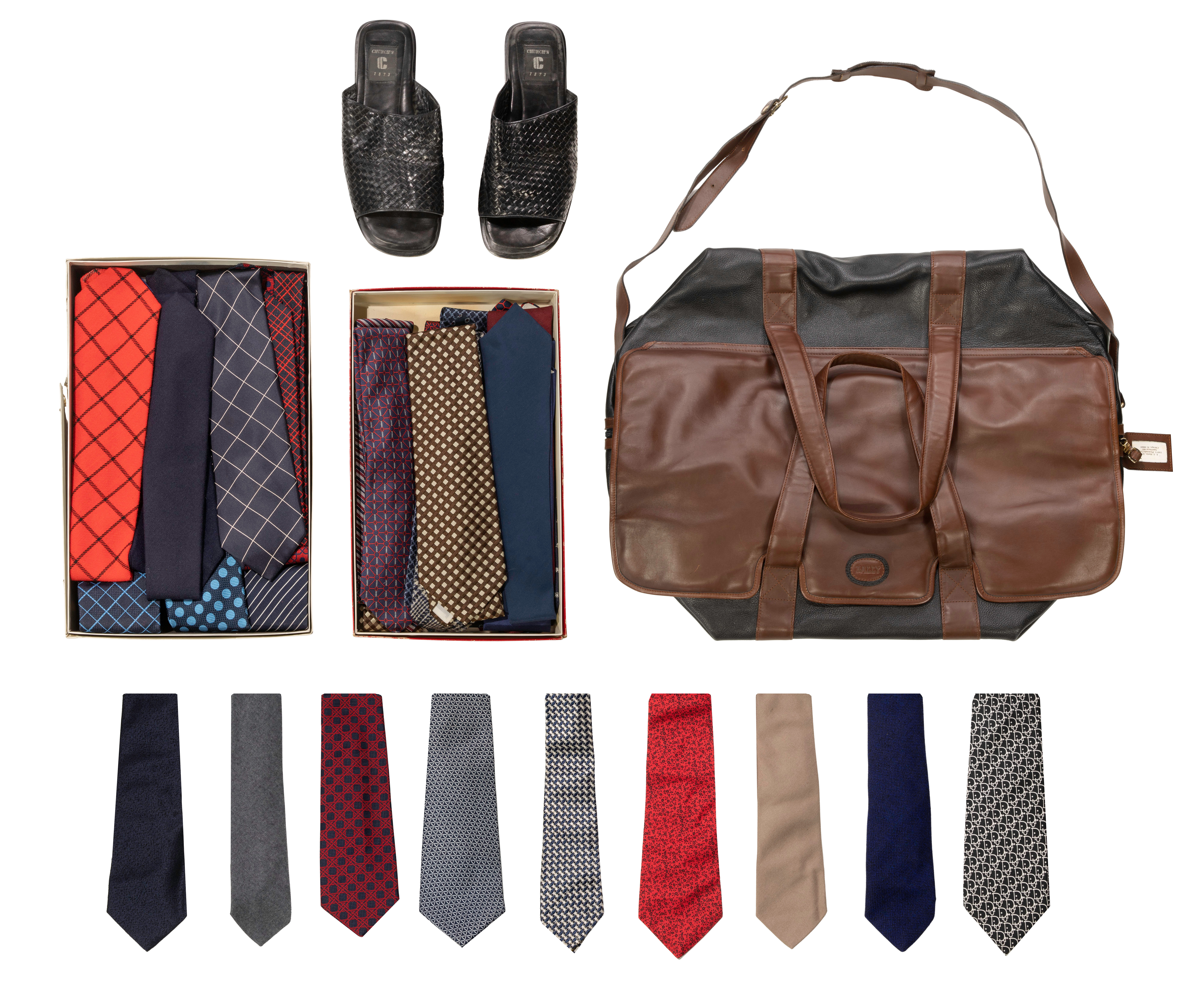 Including a Bally two-tone leather duffel / weekender bag in brown and black as well as various ties from makers such as Dior, Cardin in silk, wool and a pair of leather slide style shoes