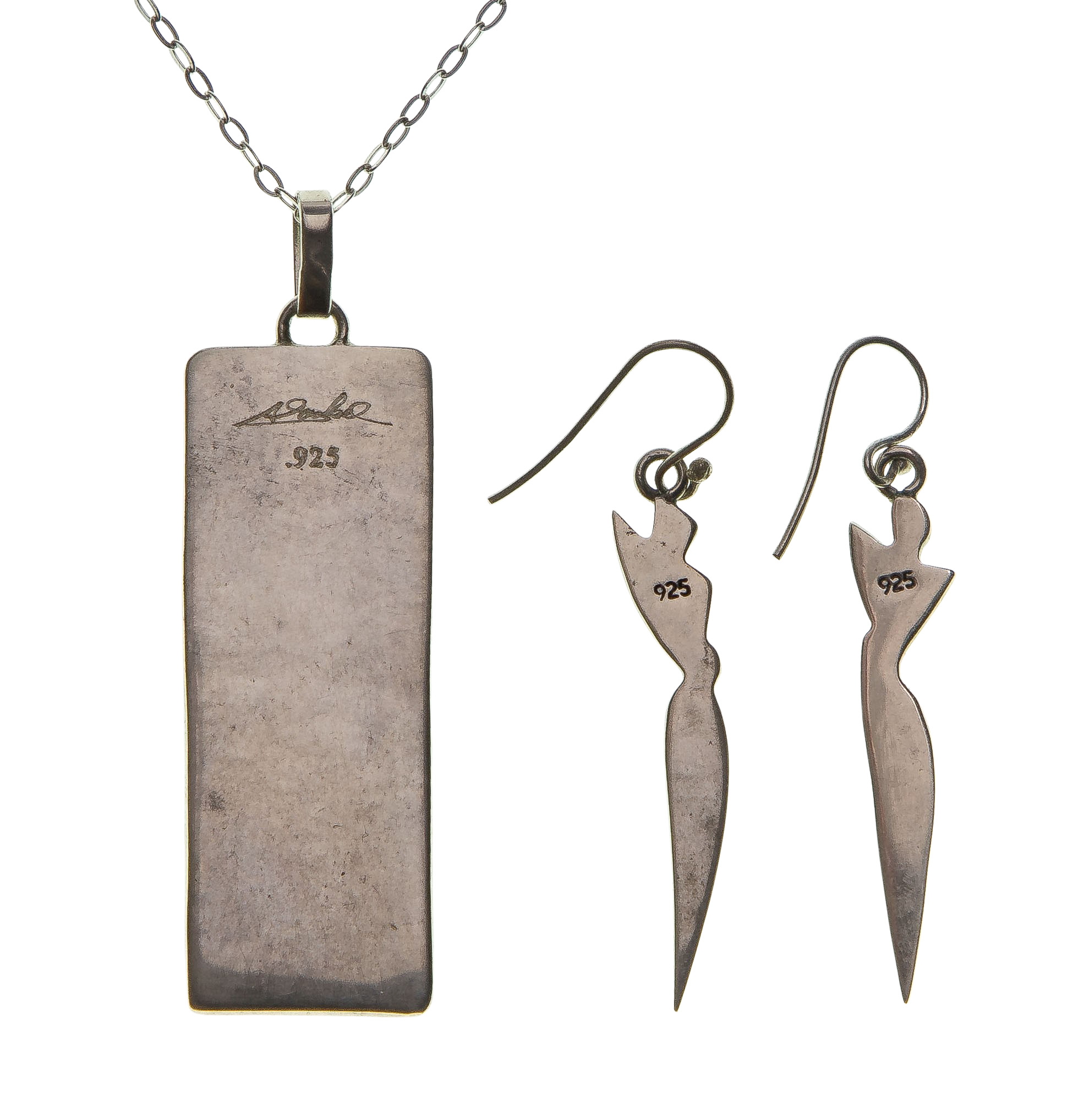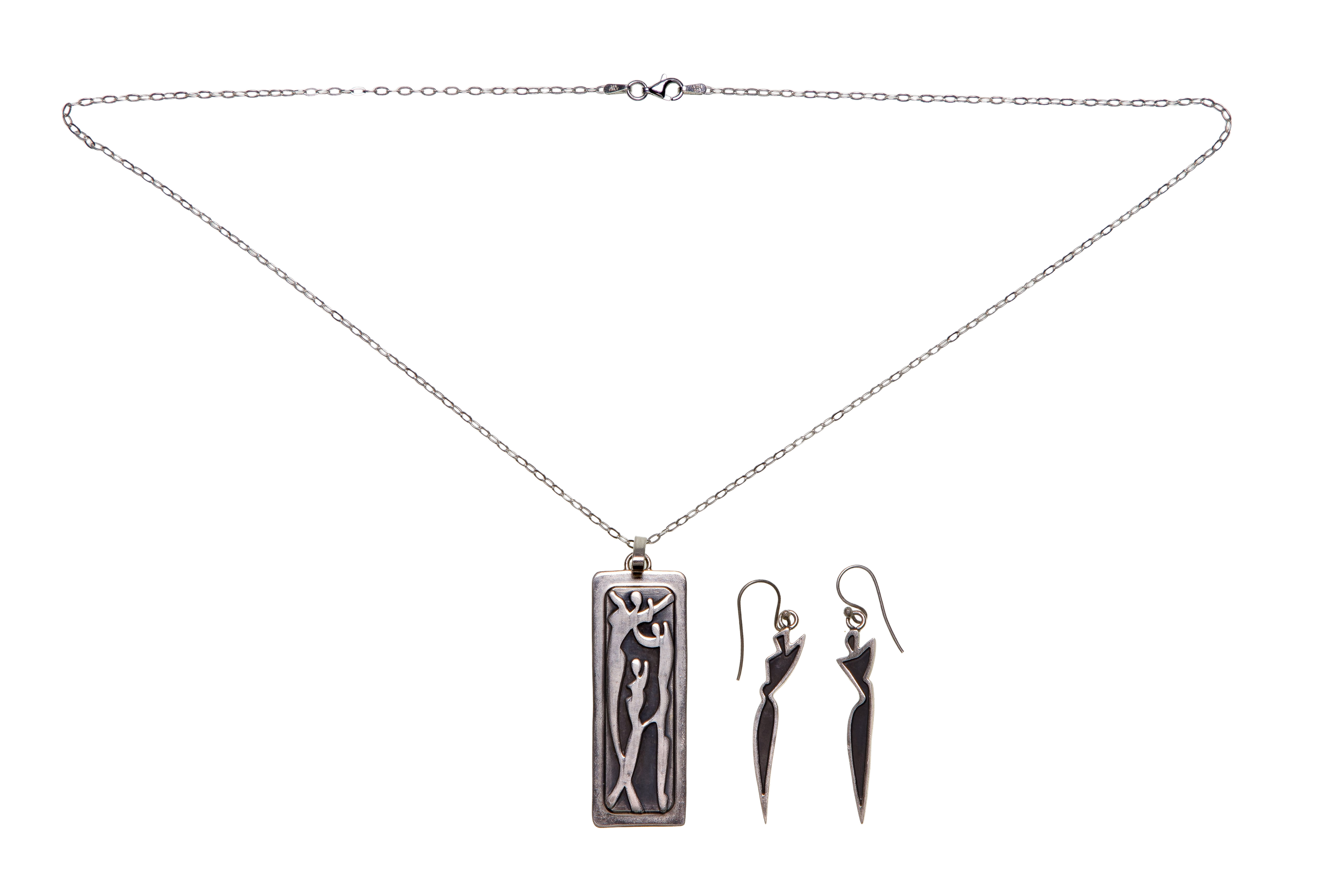 Including a necklace, pendant and a pair of pierced earrings, depicting abstract figural forms (all marked ‘sterling’ / ‘925’)