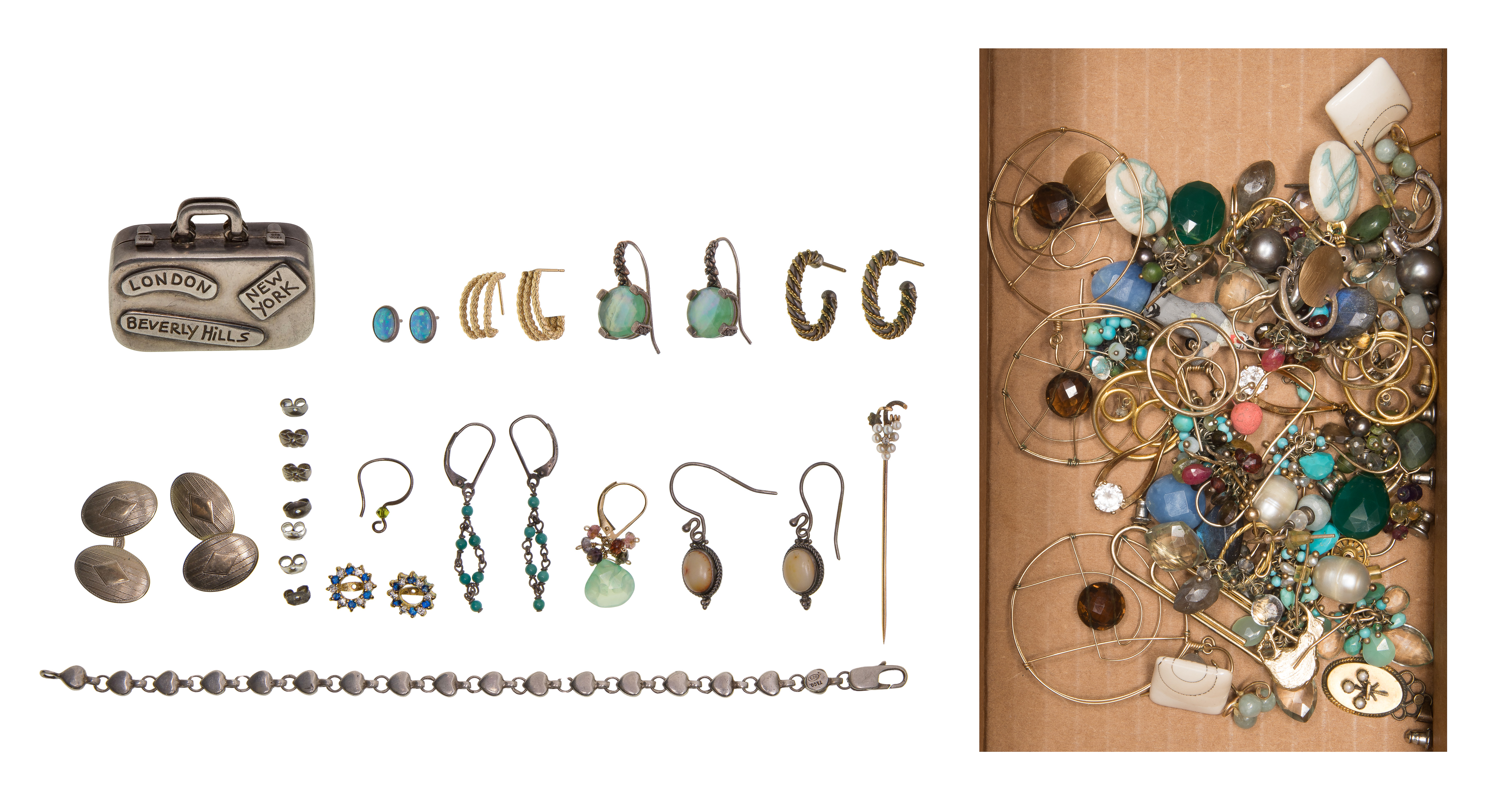 Including a grape form diamond and pearl stick pin, a white gold cufflink set and a pair of earrings (all marked ’14k’), Tiffany & Co. items including a suitcase form pill box, a heart link bracelet, gold accented earrings and a presentation box and pouch (all signed ‘Tiffany’ and marked ‘sterling’ / ‘925’, earrings marked ‘750’ / ‘925’), silver jewelry including earrings and findings (all marked ‘sterling’ / ‘925’) and assorted costume jewelry earrings, parts and findings
