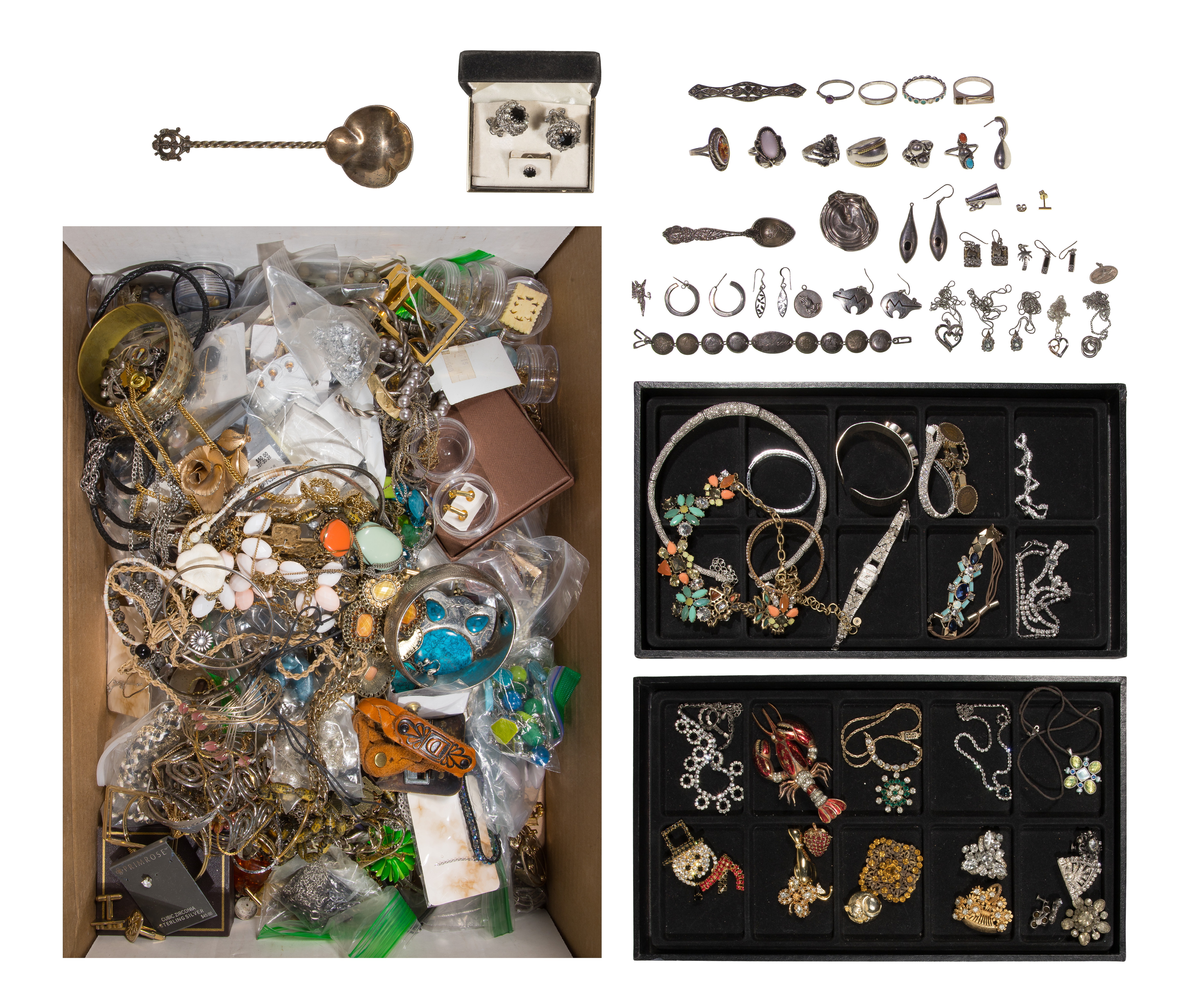 Approximately (15) pounds of jewelry including rings, bracelets, charms, earrings, pendants, spoons (some marked ‘925’) and fashion jewelry including rhinestones, bracelets, necklaces, pendants and earrings