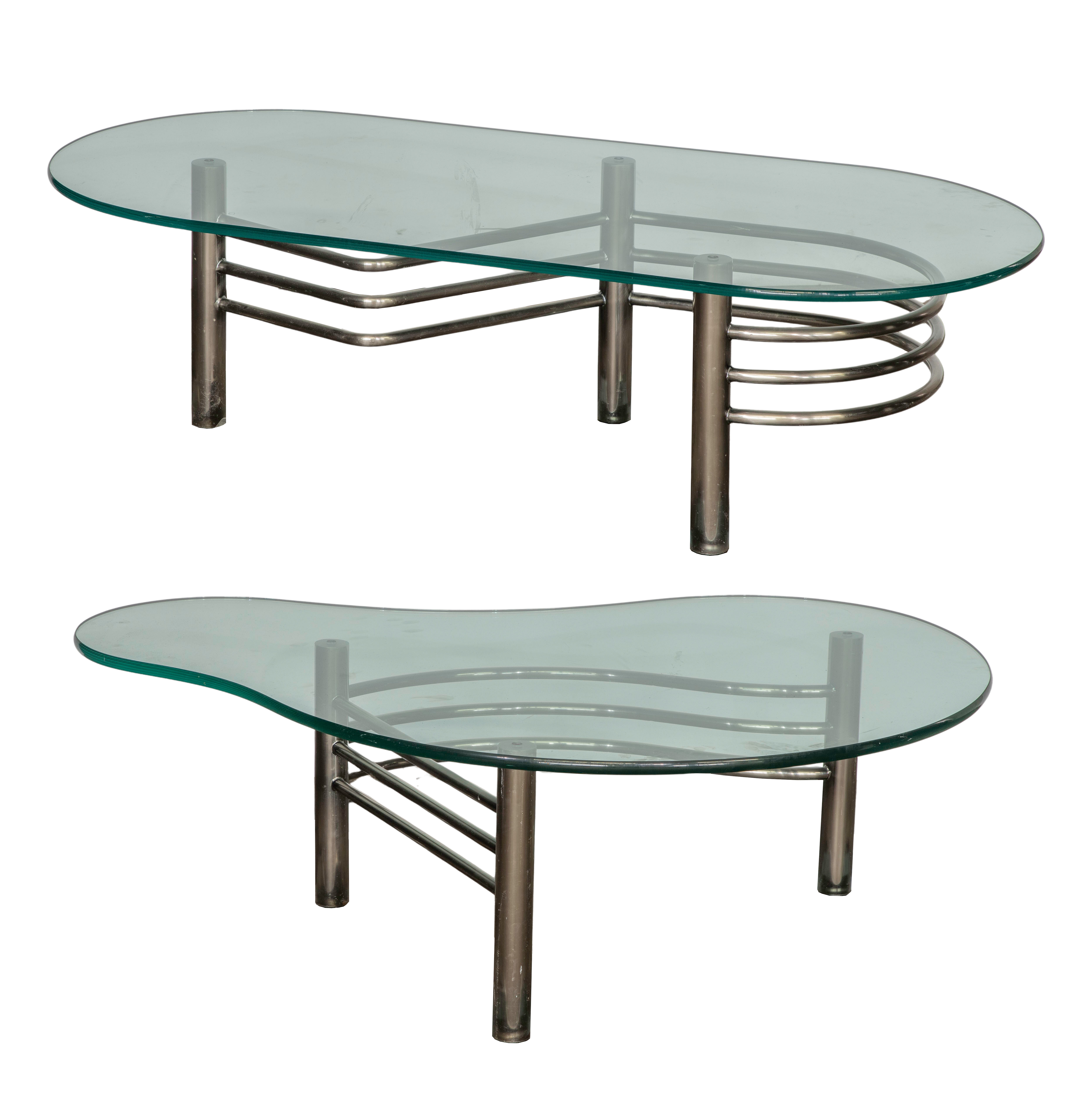 (2) items including an oval cocktail table and a kidney shaped side table, each having tubular bases and 0.50-inch glass tops