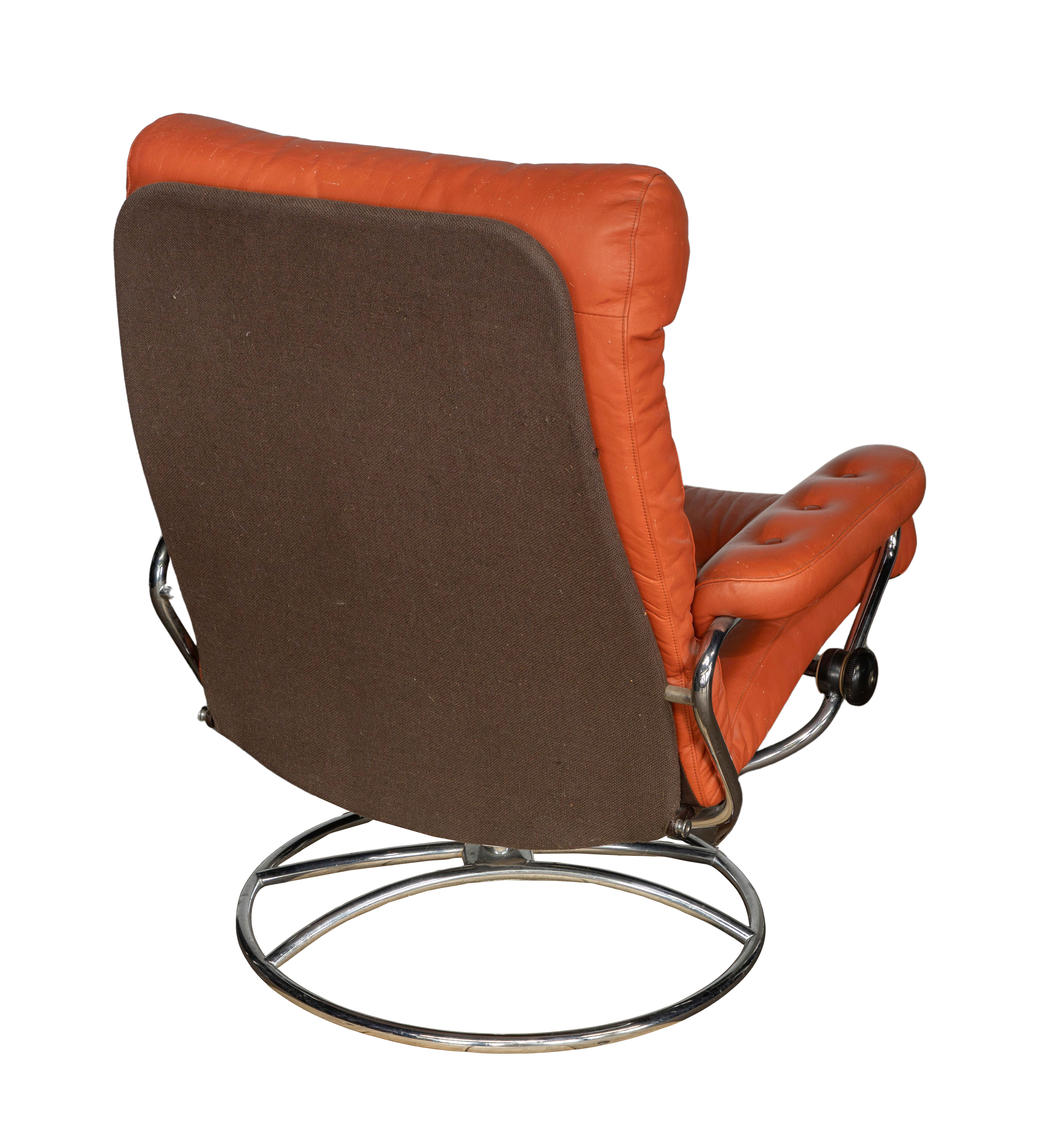 A reclining swivel armchair having a tufted sienna color leather upholstery on chromed steel frame, retaining a ‘Made in Norway’ label on underside
