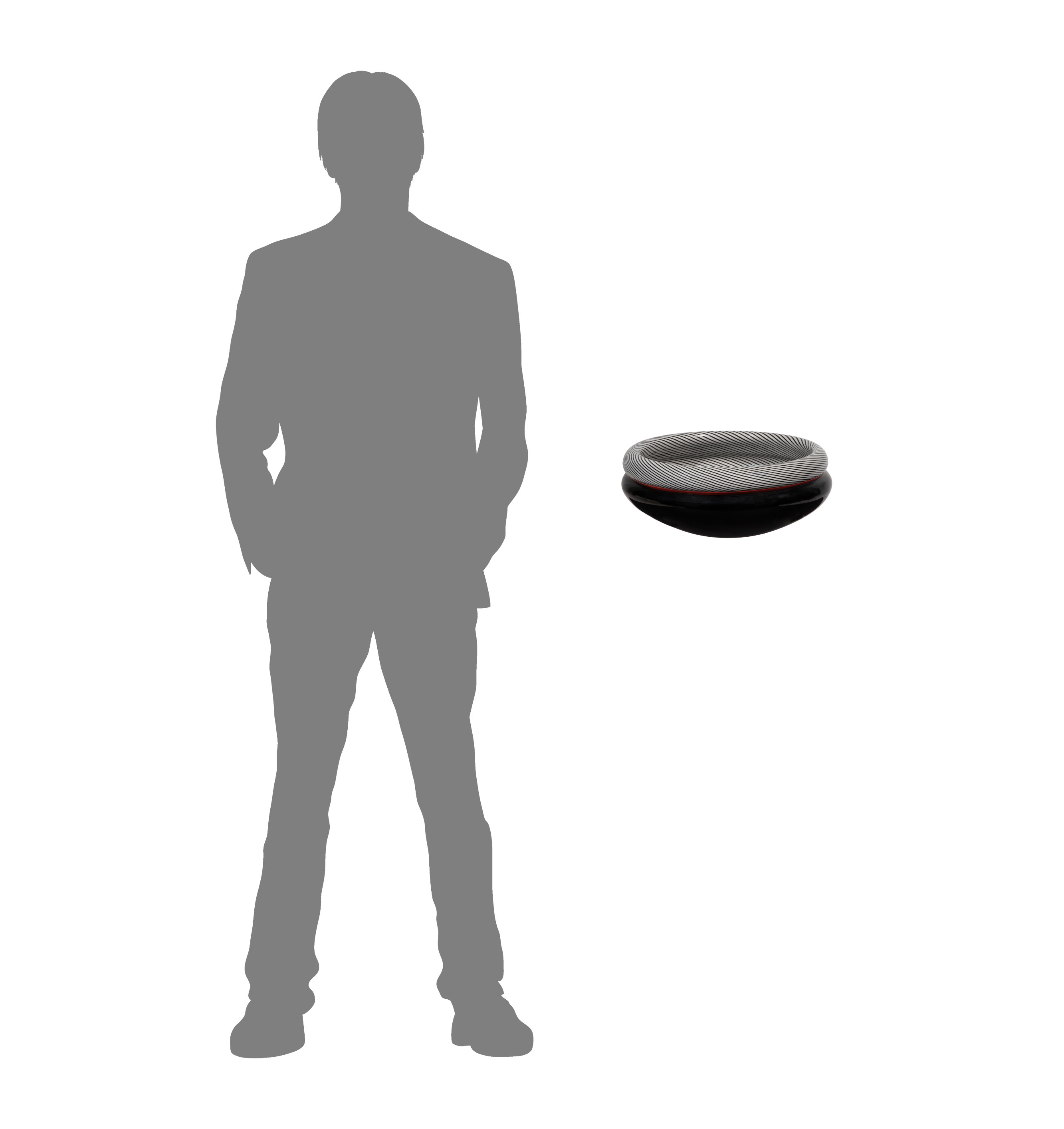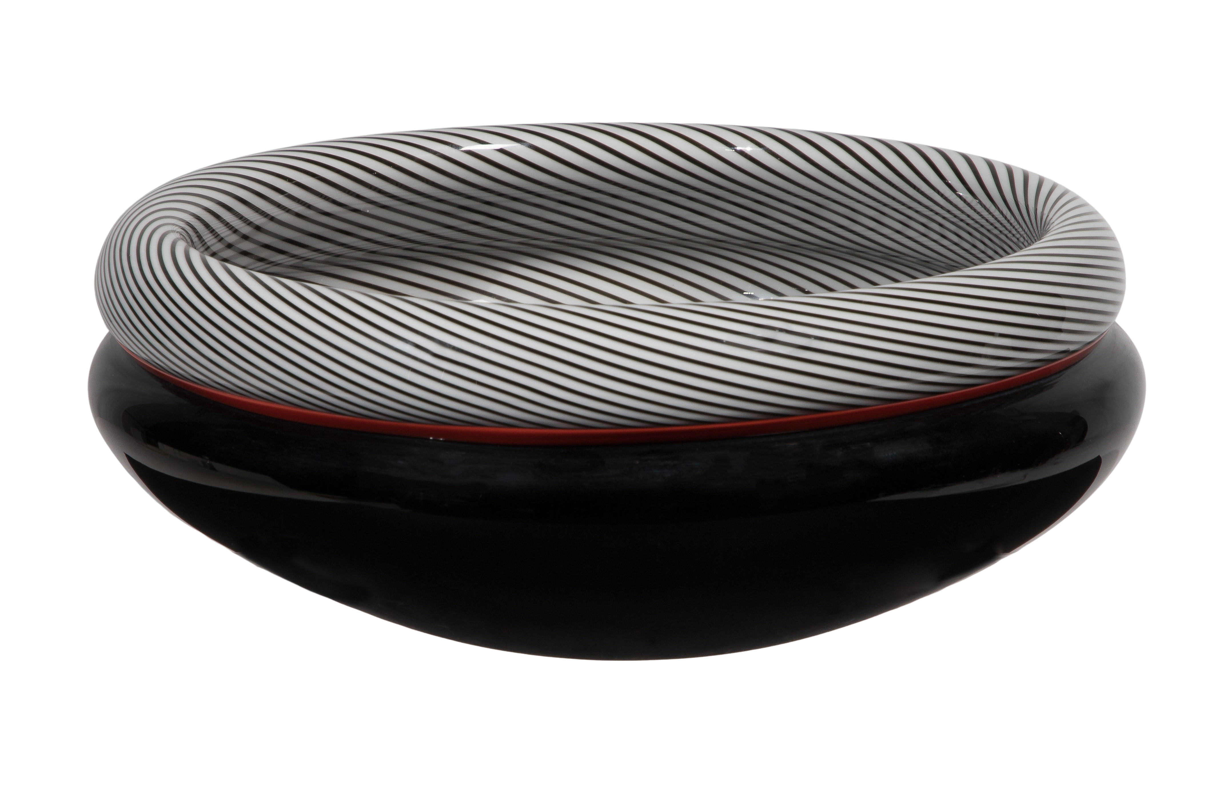 1985, signed, dated, #12/100 to underside, black glass bowl having black and white spiral design and red accent band at shoulder