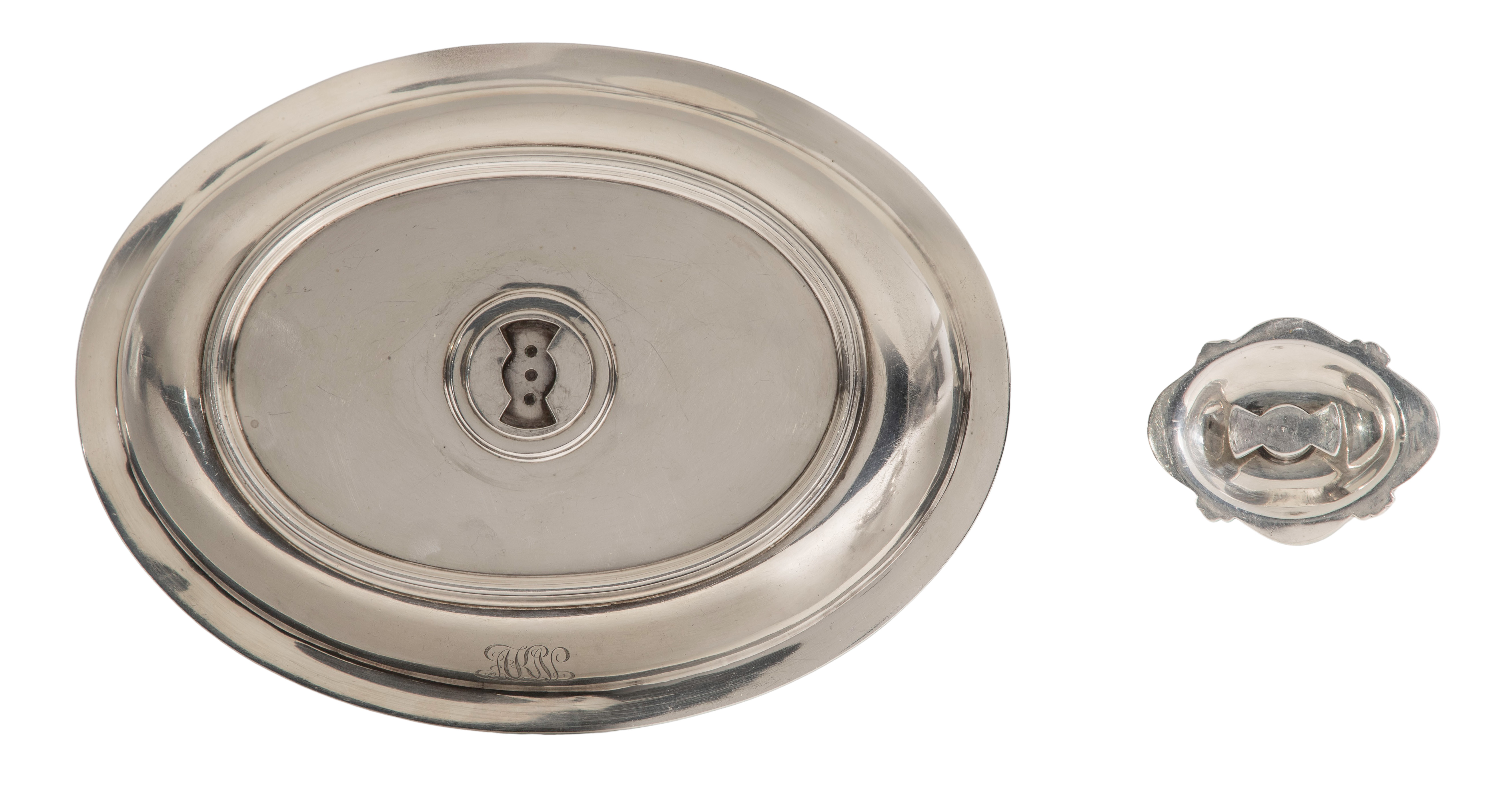 An oval lidded serving dish having twist and lock handle for using lid as a separate dish (marked ‘Tiffany & Co. Makers, 14468 5448, sterling silver, 925-1000’)