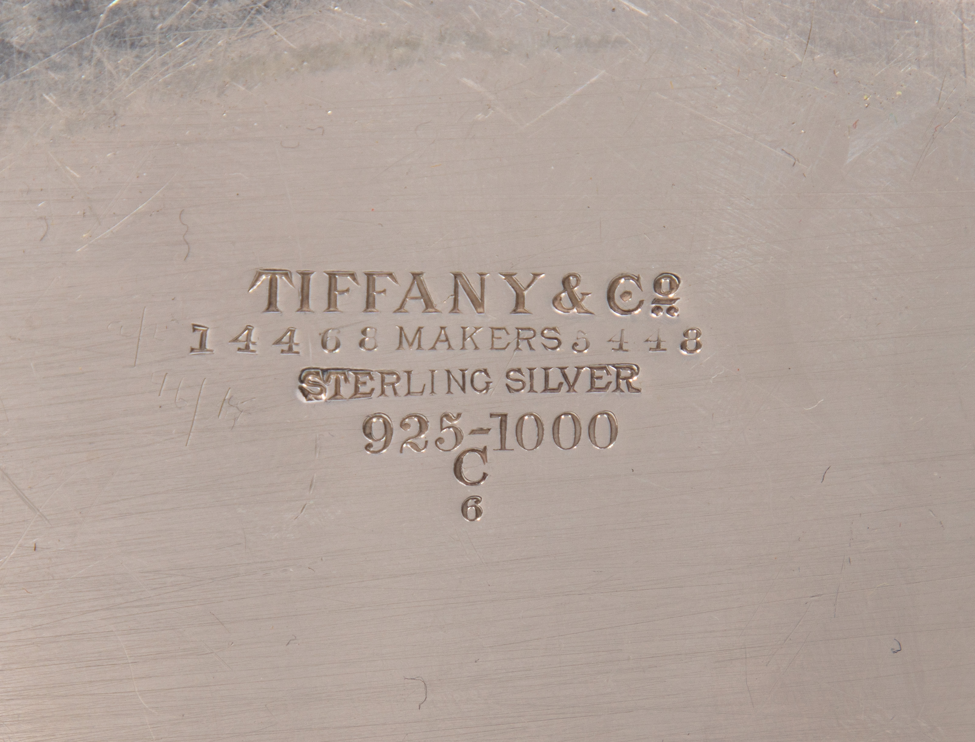 An oval lidded serving dish having twist off handle for using lid as a separate dish (marked ‘Tiffany & Co. Makers, 14468 5448, sterling silver, 925-1000’)