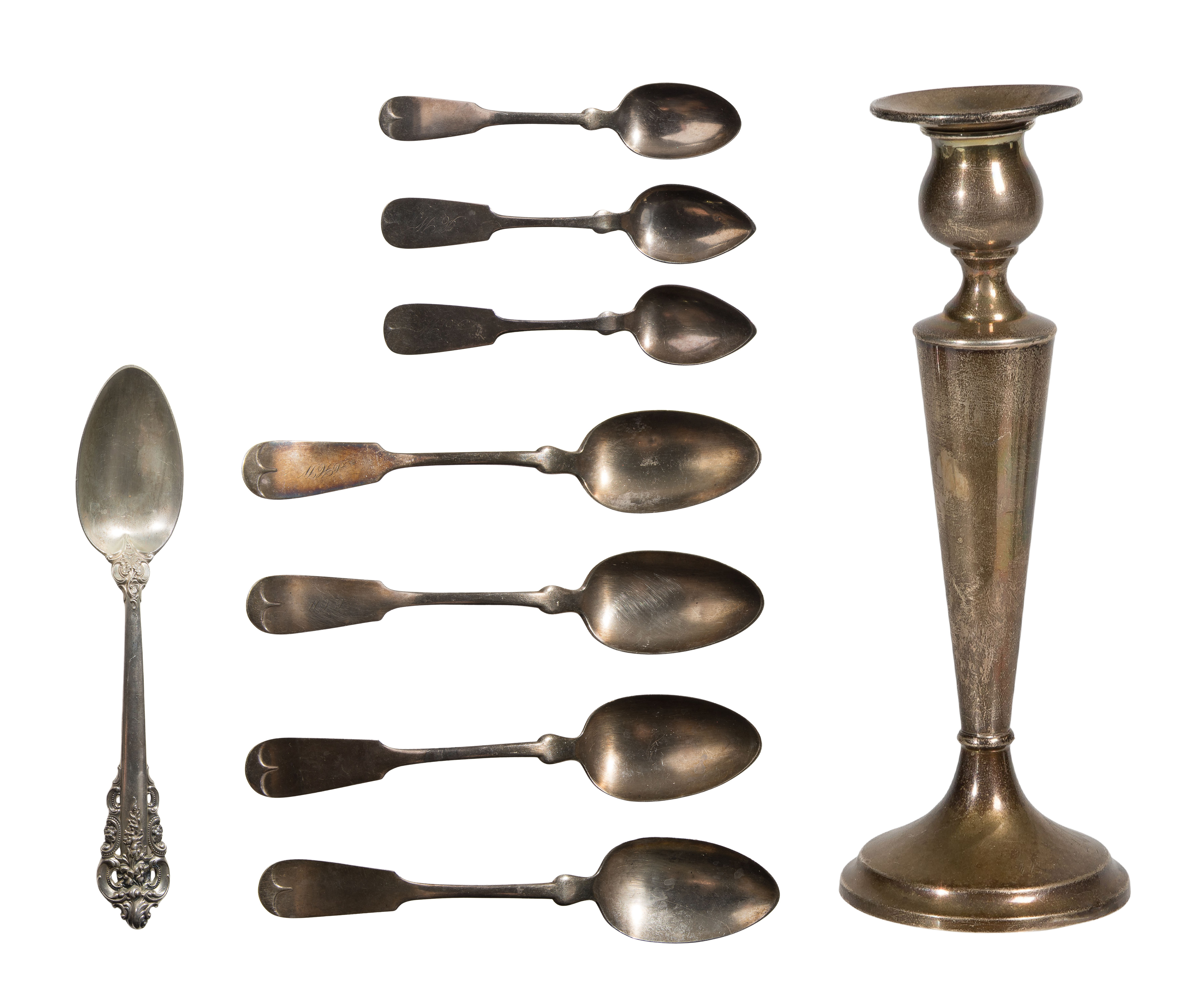 (9) items including a set of (3) teaspoons, a set of (4) tablespoons, a Wallace Grand Baroque table spoon and a weighted candlestick (all marked ‘sterling’)