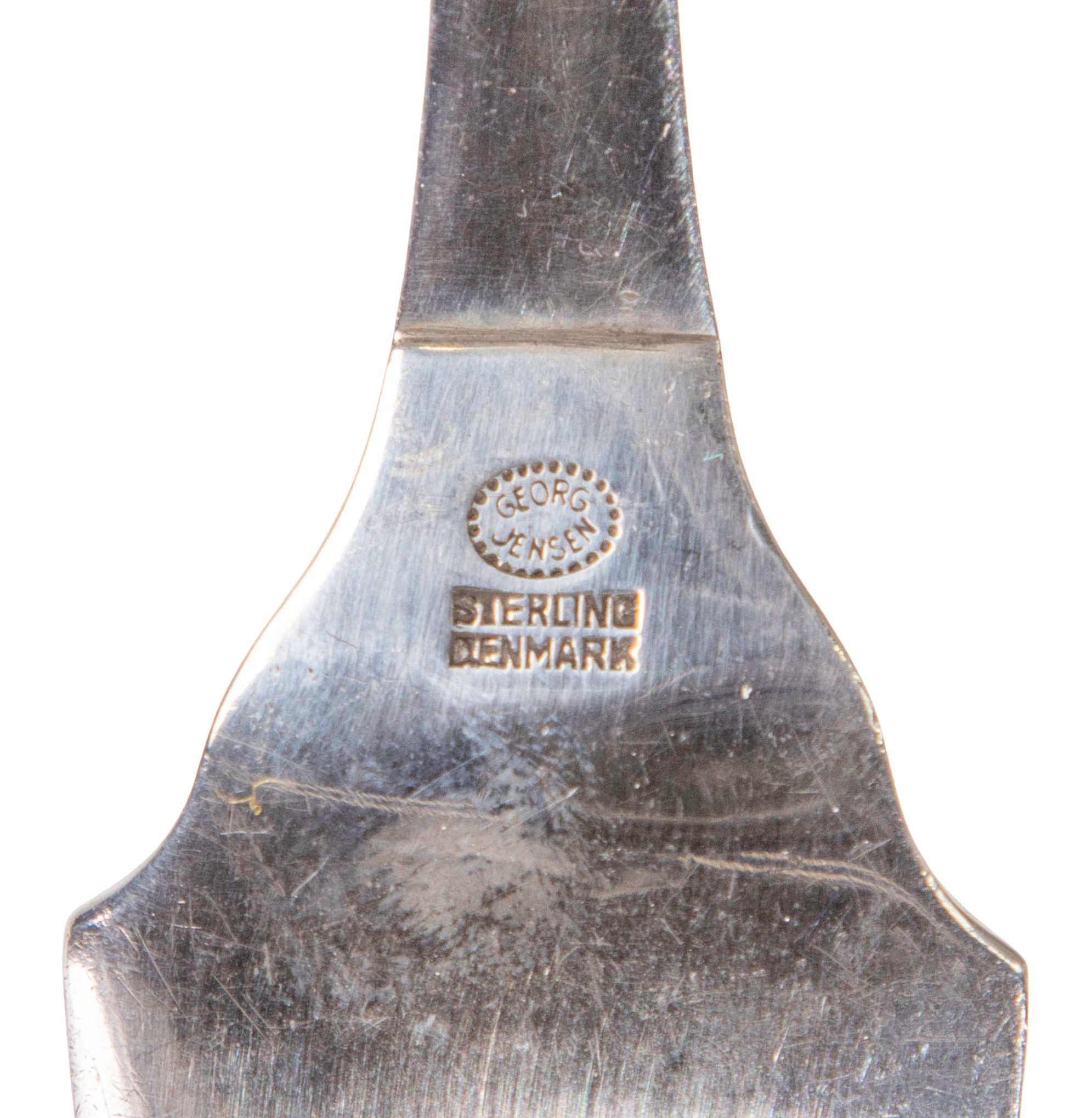 (36) items including (3) 8 3/4-inch dinner knives, (8) 6 3/4-inch weighted butter knives, (8) 7 3/4-inch dinner forks (marked ‘830’), (4) 7 7/8-inch desert forks, (6) 6 3/4-inch round soup spoons (one marked ‘830’), (1) large cream ladle, (1) pair of scissor shape sugar tongs, (1) individual grapefruit spoon, (1) fruit / orange spoon, (1) small compote serving spoon, (1) salad serving spoon and (1) pierced ladle, all marked on underside with various marks from different years, including Georg Jensen anti-tarnish bags (all marked ‘sterling’ unless noted)