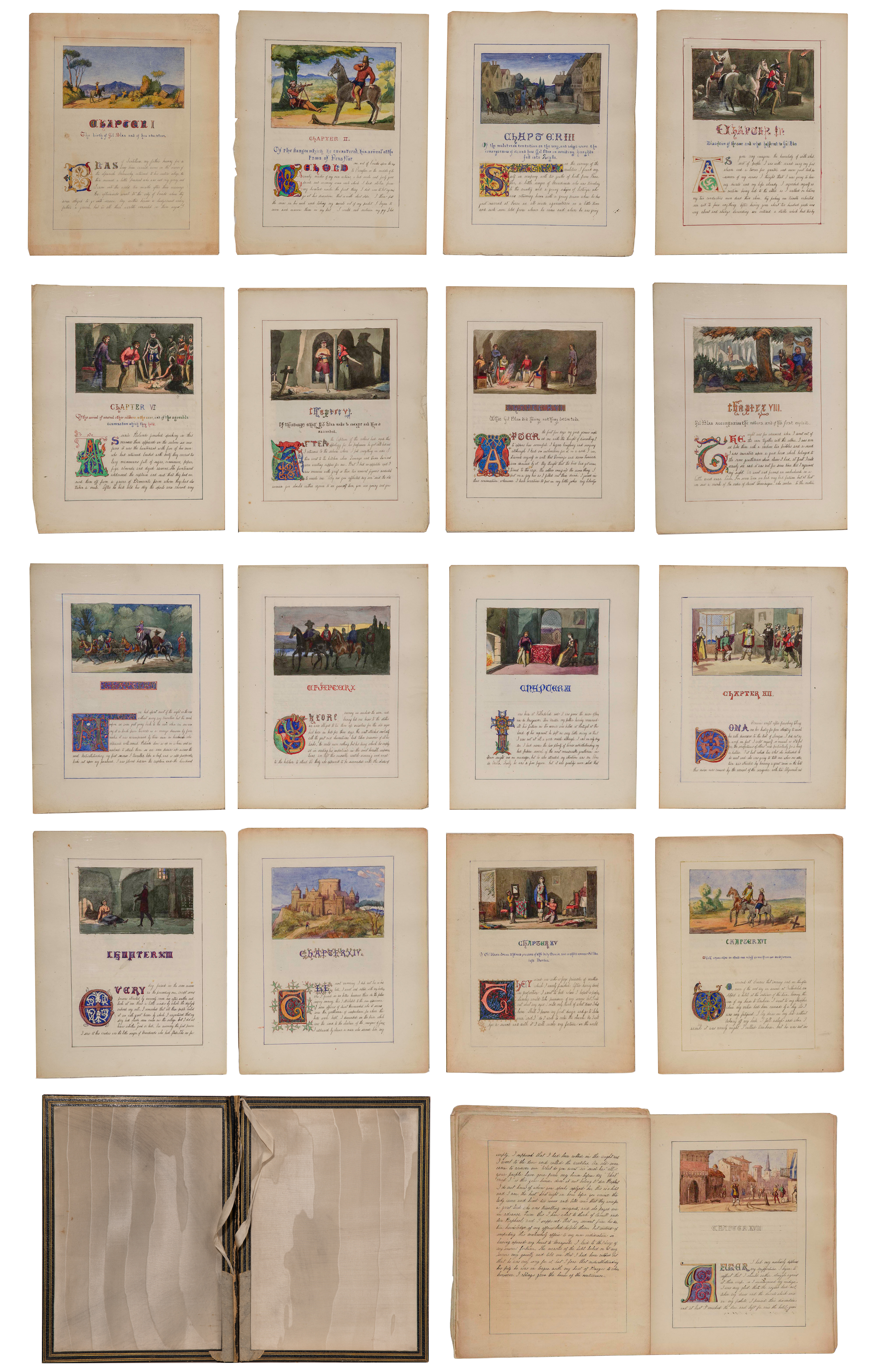 (5) total items including a copy of Gil Blas, written by Alain-René Lesage (French, 1668-1747) in 1715, this anonymous English translation manuscript copy appears to be a 19th century Arts and Crafts movement production, thirty-six sheets having twenty-nine hand painted watercolor illustrations, illuminated chapter heads and initials, the text rendered in a neat cursive hand, unpaginated, disbound from the untitled full morocco covers; together with (3) Japanese ukiyo-e woodblock print books and a British woven silk panel illustrating ‘The Lady Godiva Procession’ on printed card by Thomas Stevens Stevengraph Works, Coventry
