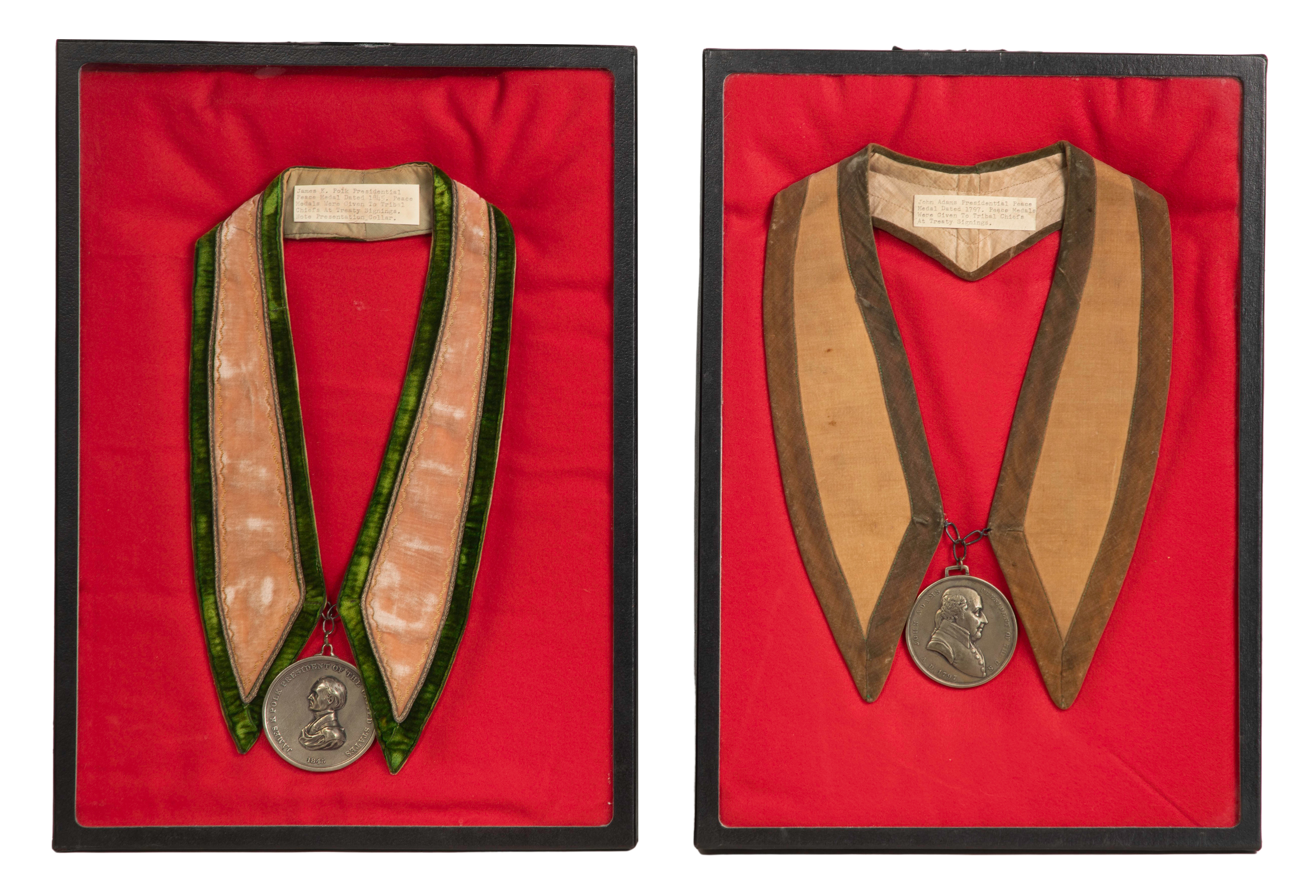 (2) reproduction bronze medallions of the Presidential Peace Medal presented to tribal chiefs to honor brokered peace treaties, including President James Polk and President John Adams, both having presentation collars, typewritten notations and presented in specimen box frames