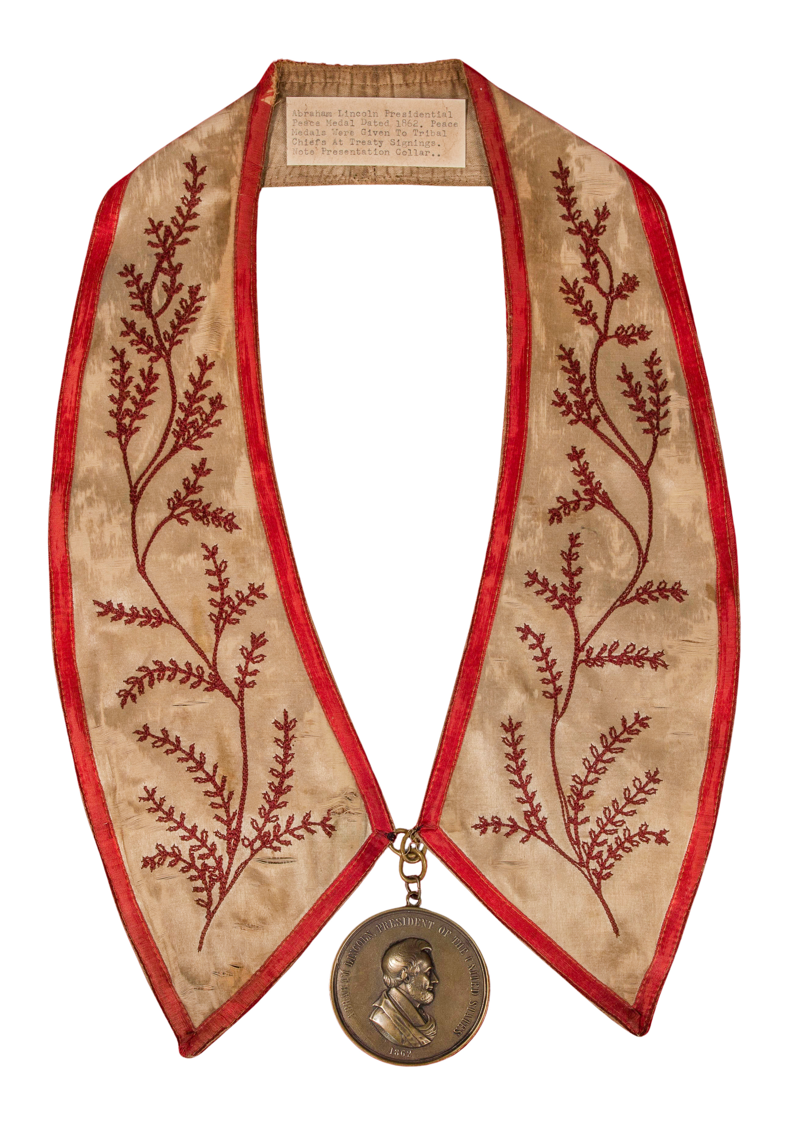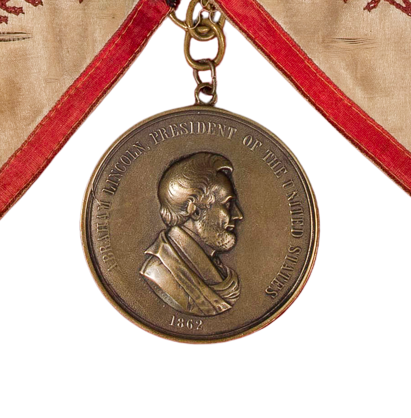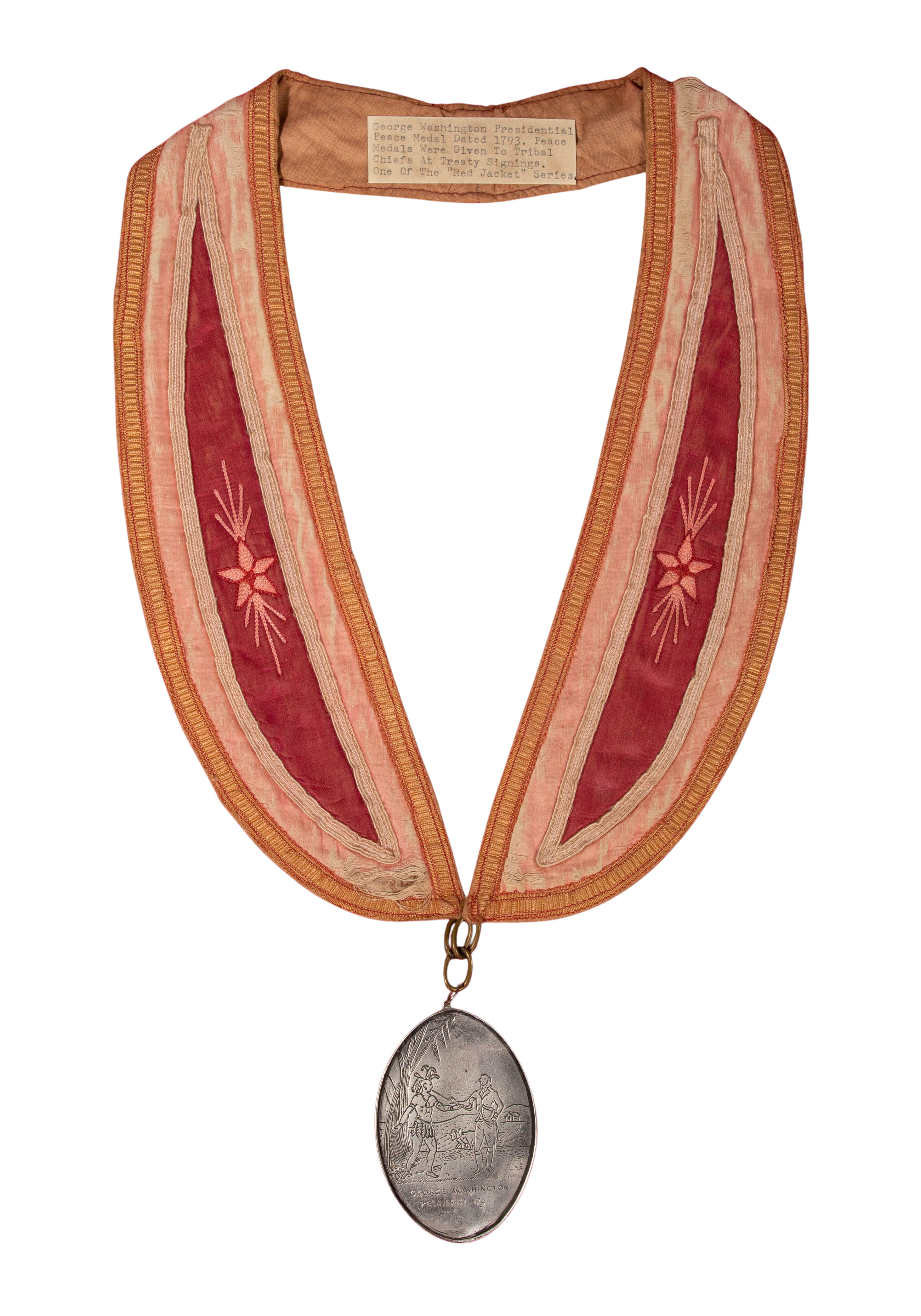(2) reproduction bronze medallions of the Presidential Peace Medal presented to tribal chiefs to honor brokered peace treaties, including President George Washington and President Abraham Lincoln, both having presentation collars, typewritten notations and presented in specimen box frames