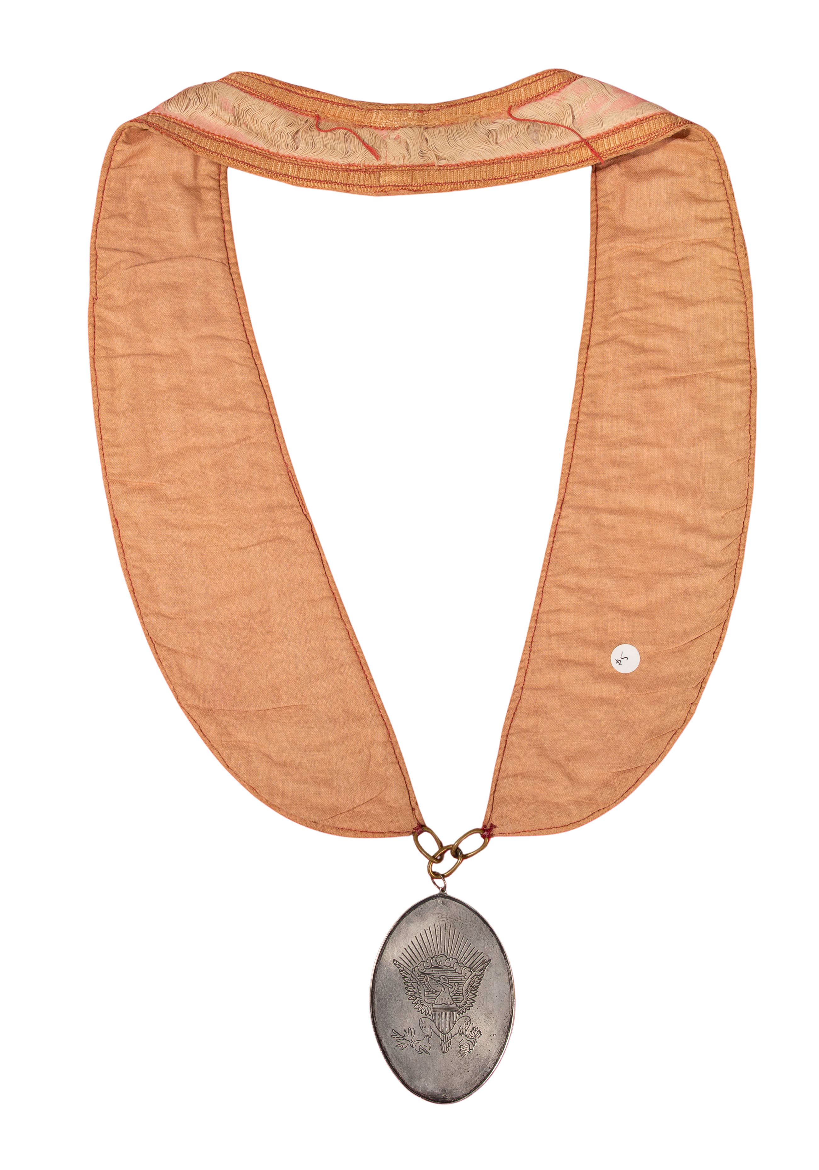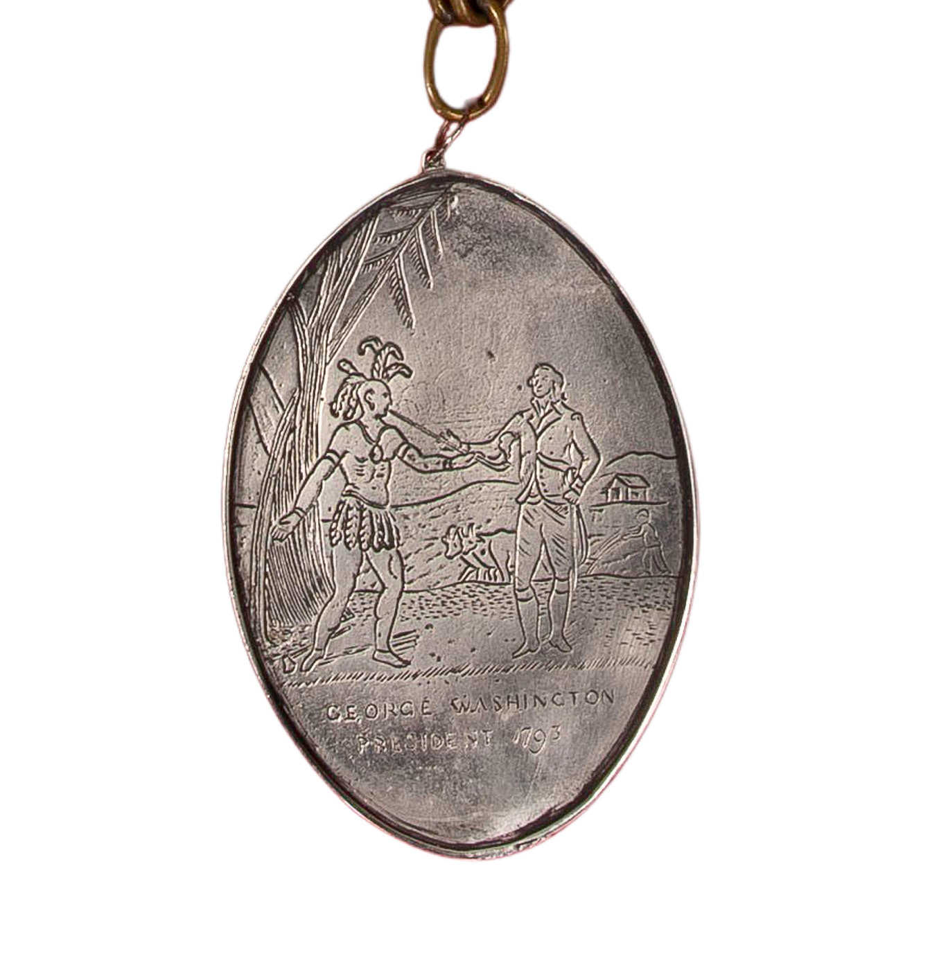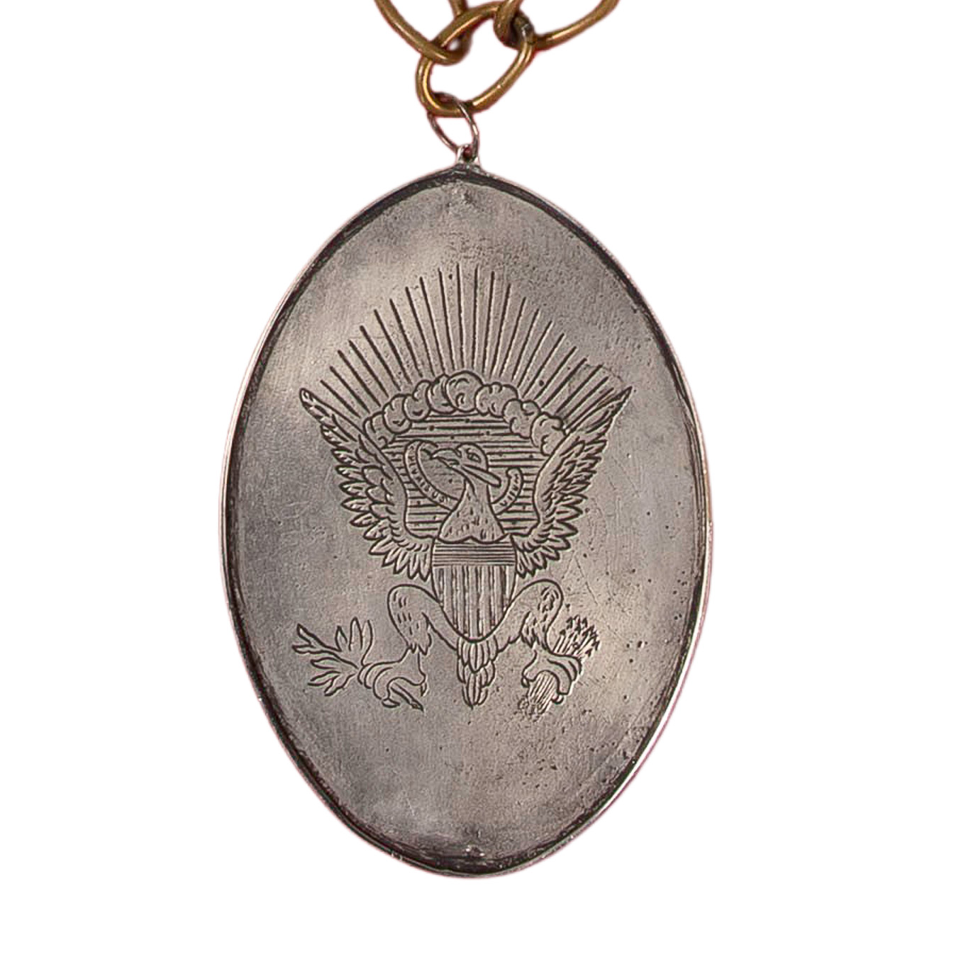 (2) reproduction bronze medallions of the Presidential Peace Medal presented to tribal chiefs to honor brokered peace treaties, including President George Washington and President Abraham Lincoln, both having presentation collars, typewritten notations and presented in specimen box frames