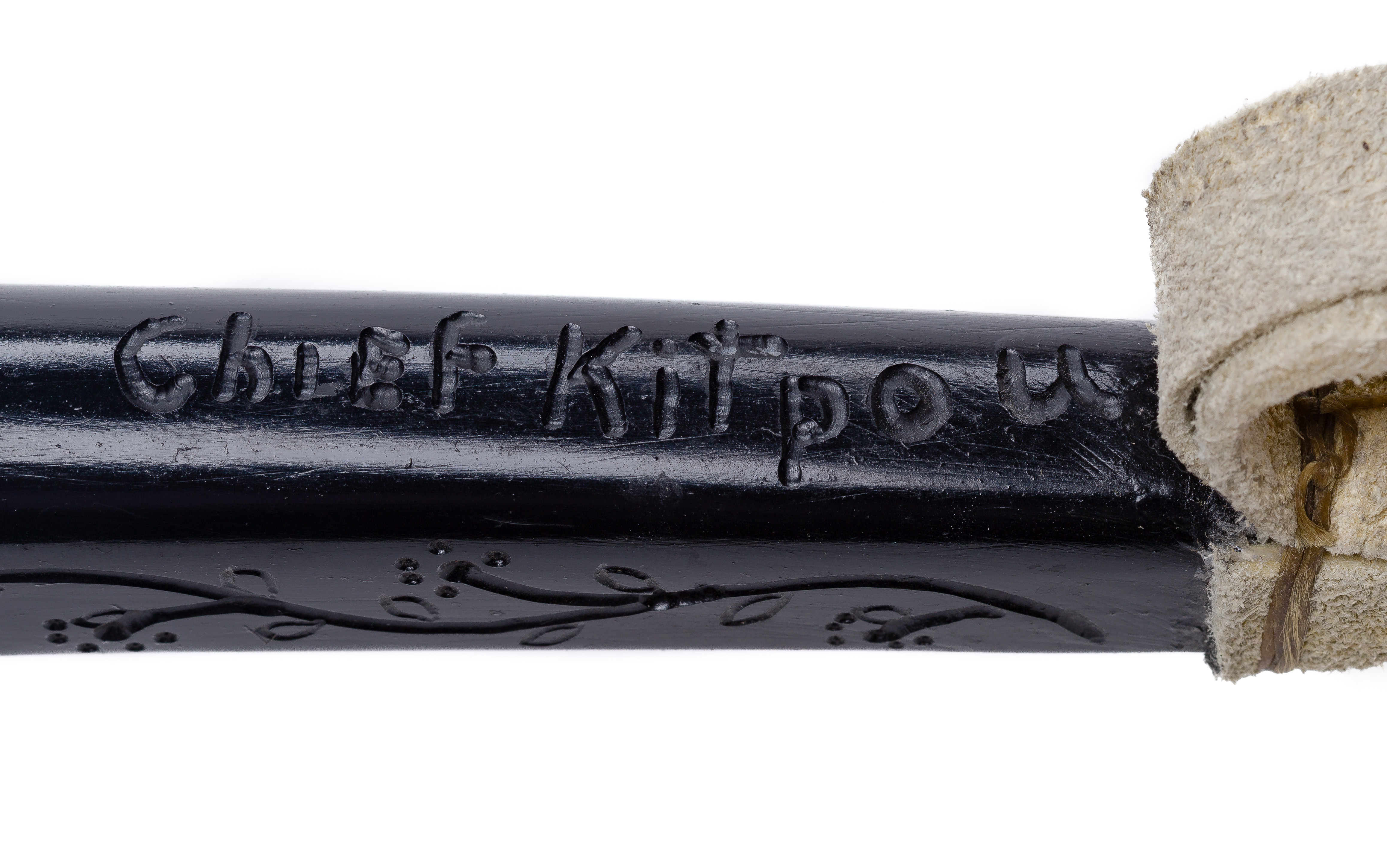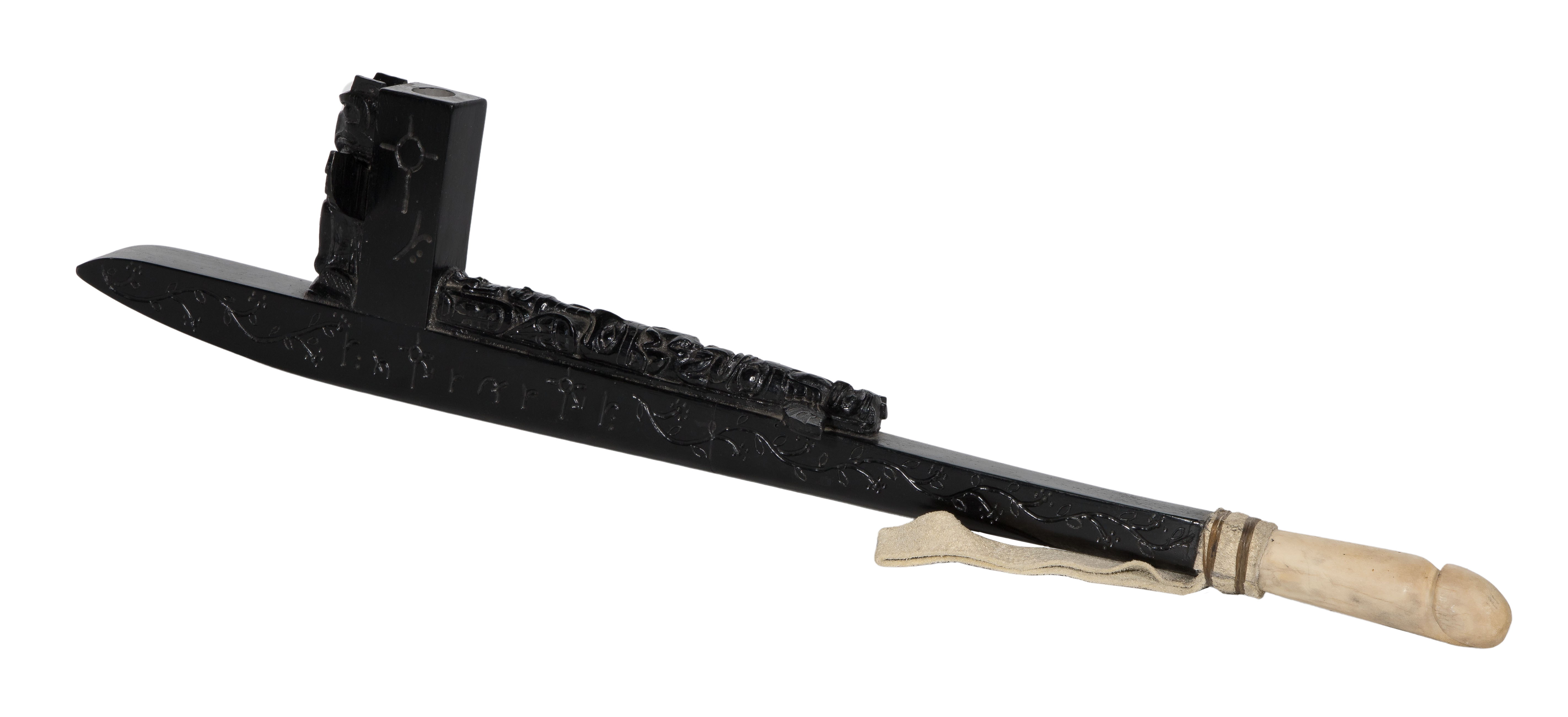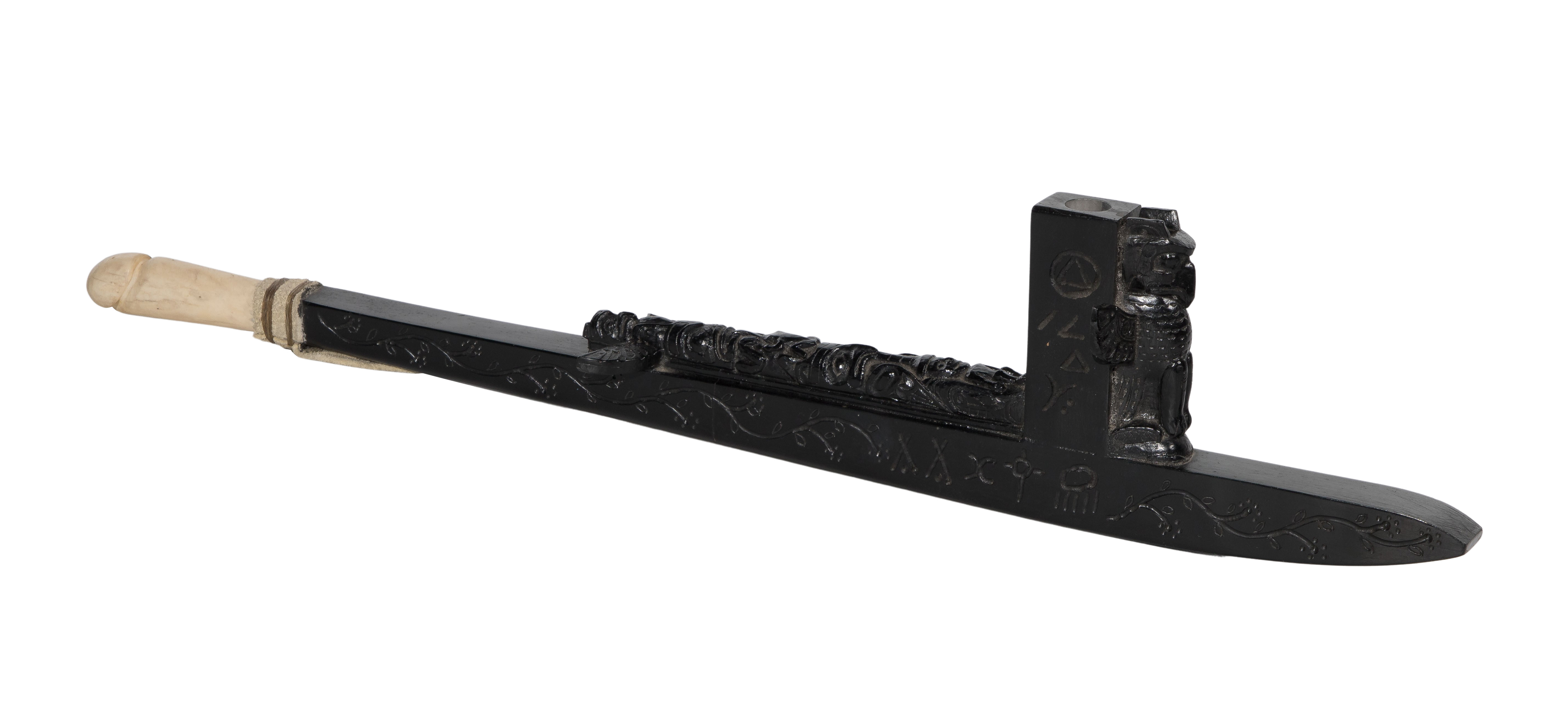 Signed James Albert Munster (Algonquin, 1923-88), painted and carved wood pipe having applied carved totems and leather wrapped phallus form carved bone handle, marked ‘Chief Kitpou’ near handle