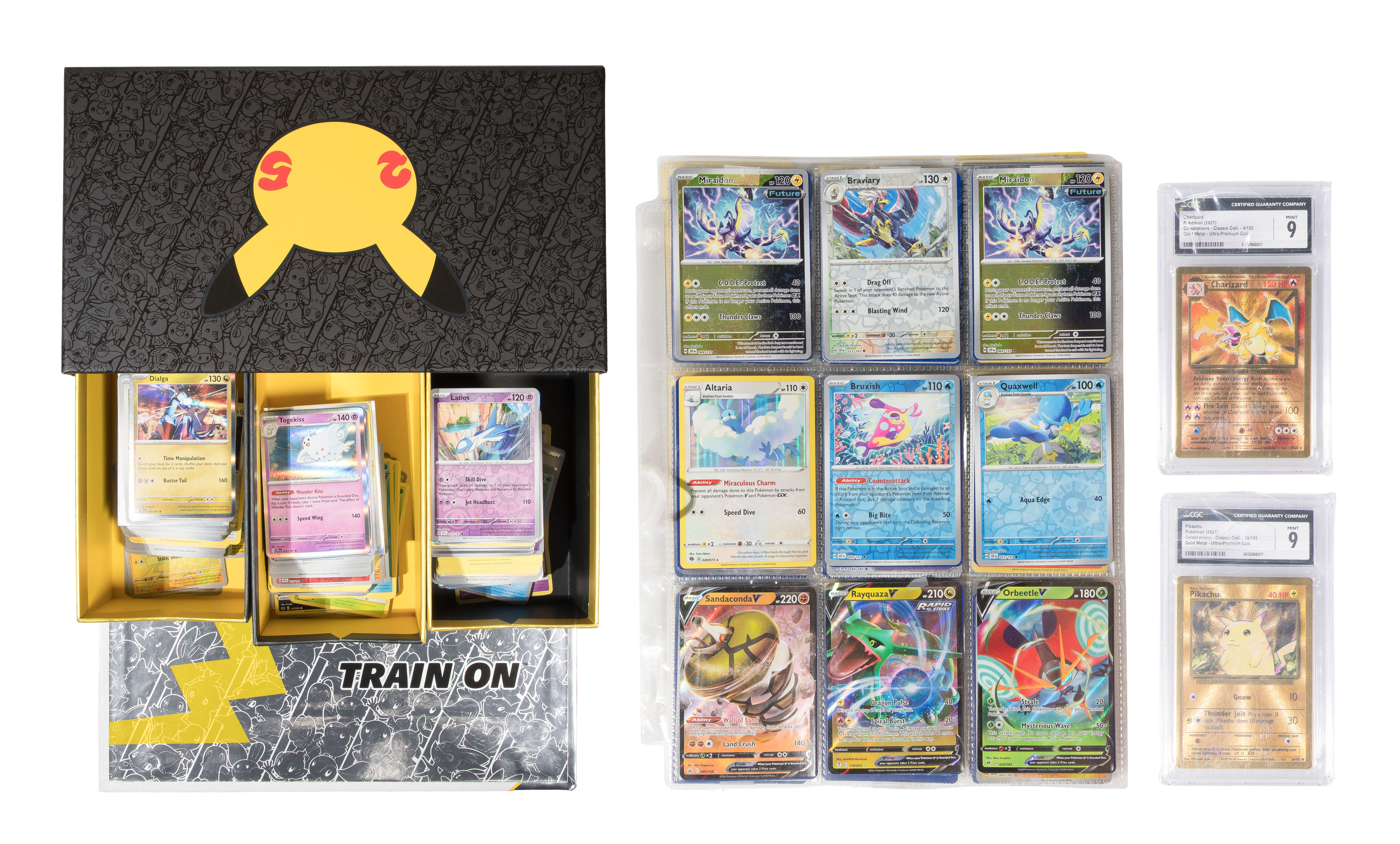 Approximately (360) items, graded 9 Mint CGC sealed having holograms including a gold metal Charizard and a gold metal Pikachu, both having a CGC hologram, as well as a mix of loose cards, flat sheets and a decorative collector’s box
