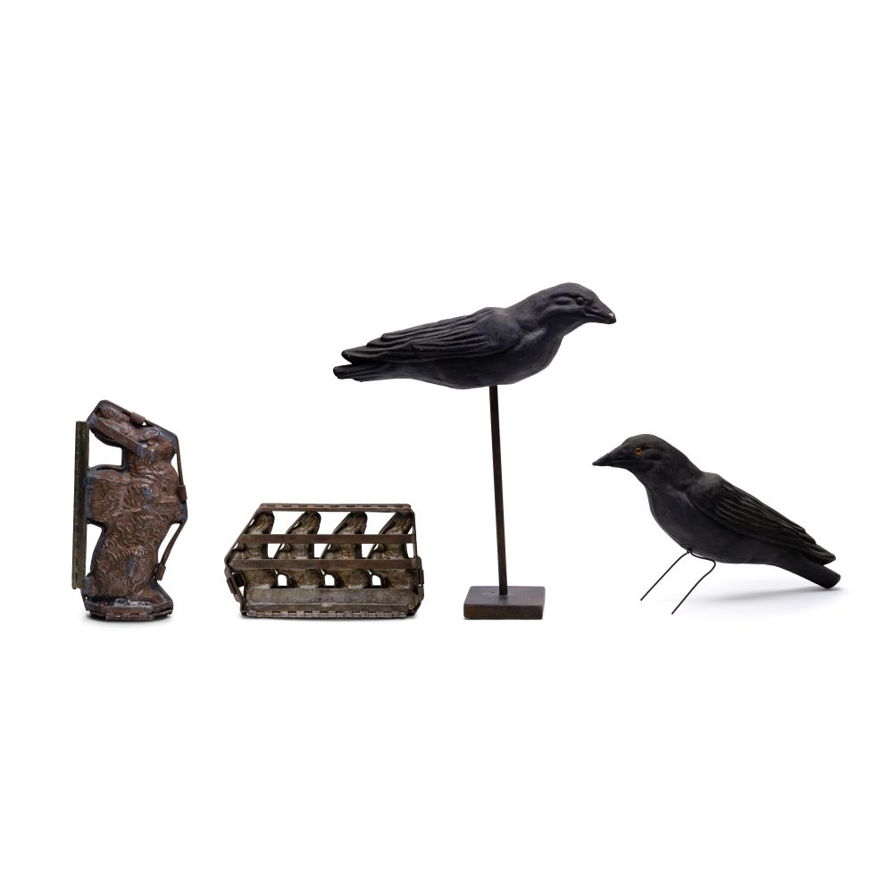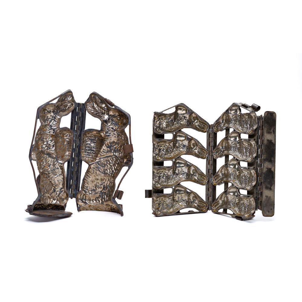 (4) items including (2) hinged metal Easter Bunny molds and (2) mold-formed composition ravens