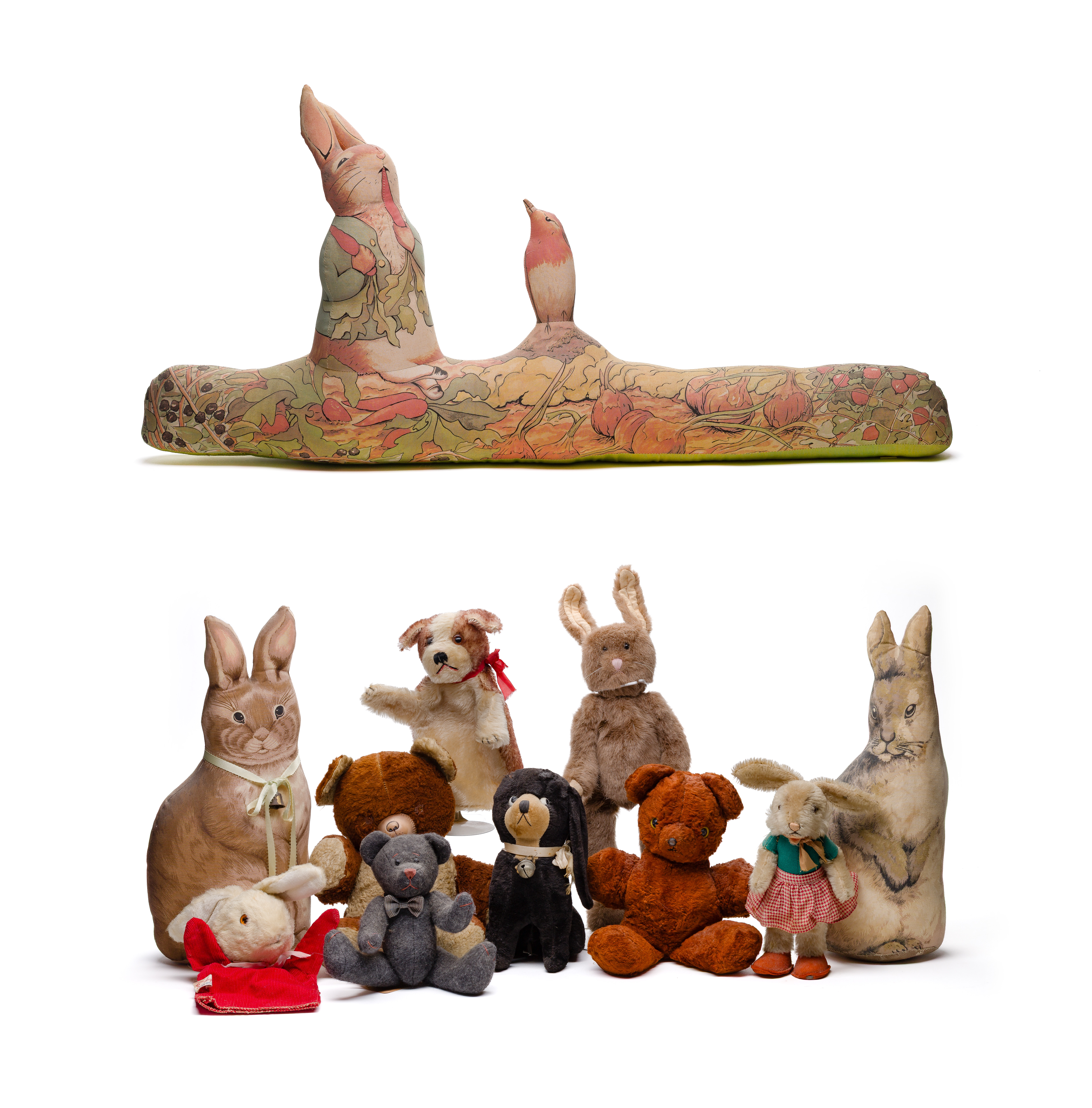 (11) items including a Peter Rabbit draft stopper, (2) folk art rabbit door stoppers as well as (8) various stuffed bears, rabbits, puppets from makers such as Stieff, Boyd’s Bears, Ideal