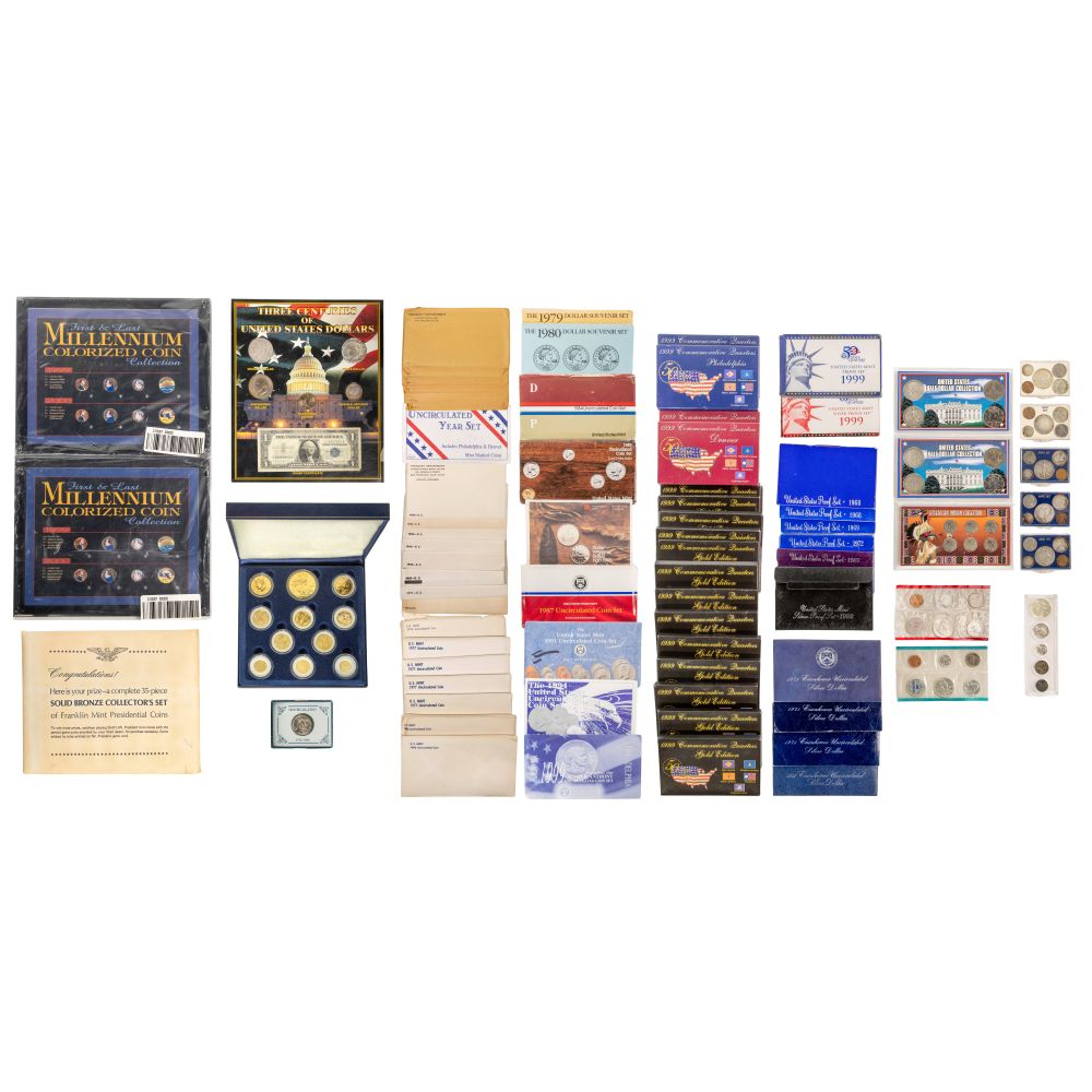 Including uncirculated silver proof sets, Eisenhower $1 from (3) 1971 and a 1972, 1992 proof set, 1999 state quarters proof and a George Washington commemorative, uncirculated proof sets from 1963, (2) 1964, (3) 1968, 1969, 1971, 1972, 1974, (4) 1977, (2) 1980, 1984, 1985, 1987, 1991, 1994 and a 1999 Susan B. Antony proof set, mint sets from 1953, 1962, 1963, (2) 1964, Proof set from (6) 1957, 1965, (2) 1968, 1969, 1972, 1987, (2) state quarters proof set, (13) state quarters gold edition, as well as (2) Susan B. Anthony $1 sets 1979, 1980, (2) 50c collections, an American Indian collection of Buffalo 5c, (2) Millennium colorized sets from 1999, 2000, three centuries of $1 collection, the ultimate 2000 coin collection, Franklin Mint Presidential bronze coins and a Canadian Voyager $1
