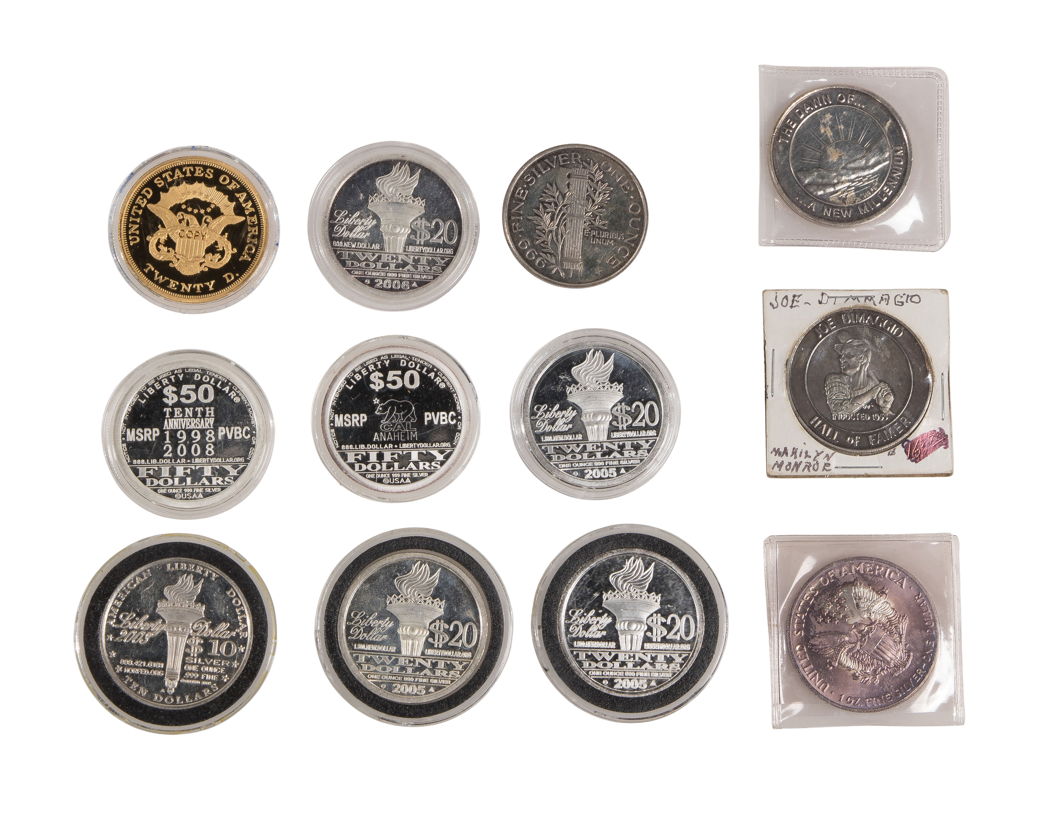 (12) total coins total including a 2000 American eagle, (7) 2005 NORFED Liberty dollars, a 2000 new millennium, a Mercury head, a Joe Dimaggio / Marylin Monroe; together with a gold-tone sterling silver copy of a $20 gold coin