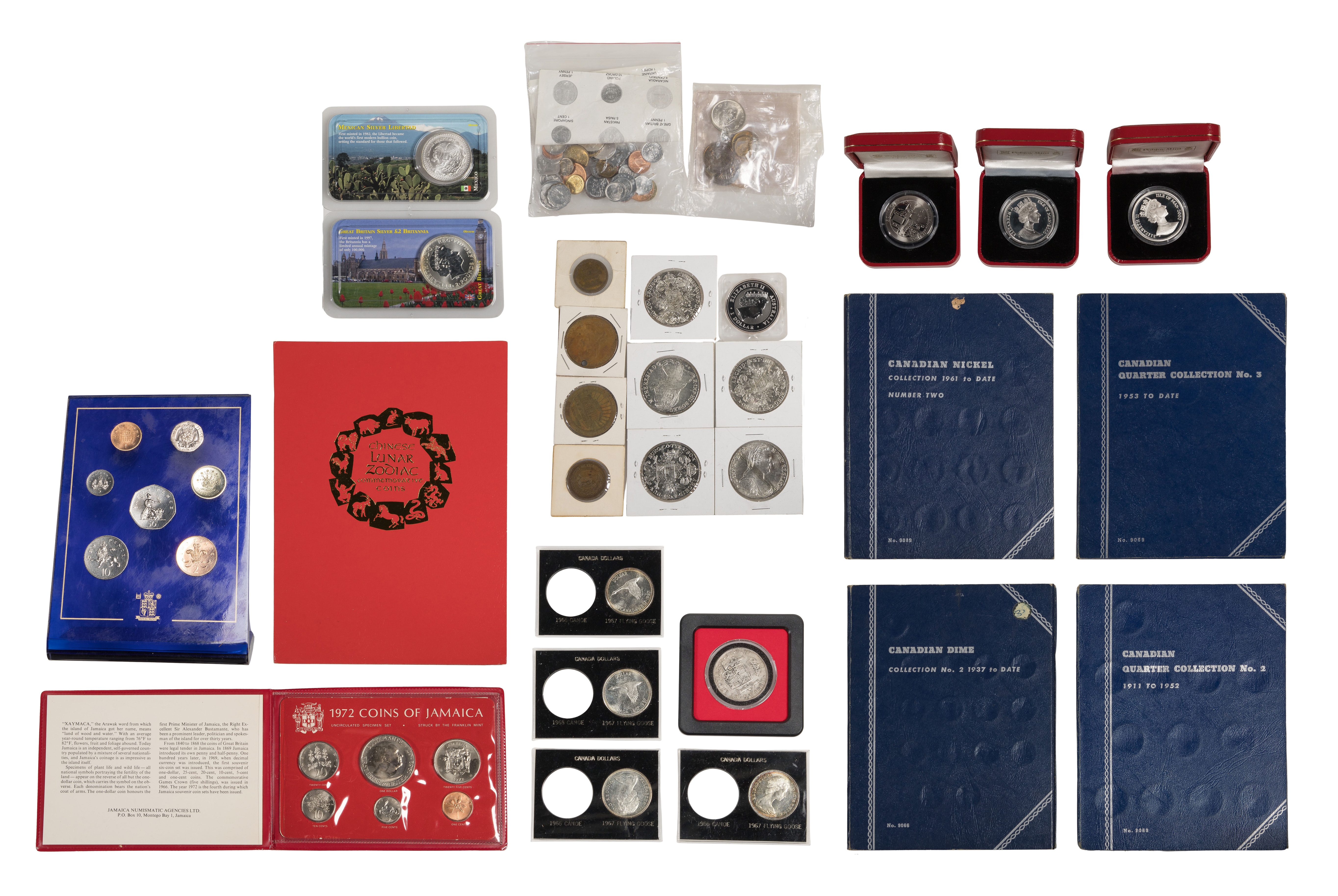 Including an 1806 Carolus IV milled dollar, (5) 1780 Maria Theresa Thaler sterling silver re-strikes, (5) 1967 1$ Canadian flying geese, a 1993 Mexican Libertad, a $2 Great Britain Britannia, a 1$ Australian Kookaburra, an English 1925 Six Pence, (3) partial Canadian Whitman coin folders (some silver noted) and a partial Canadian Whitman 5c folder, (3) Isle of Mann commemoratives, a 1972 Jamaican type set, a Chinese lunar zodiac coin folder and assorted foreign coins