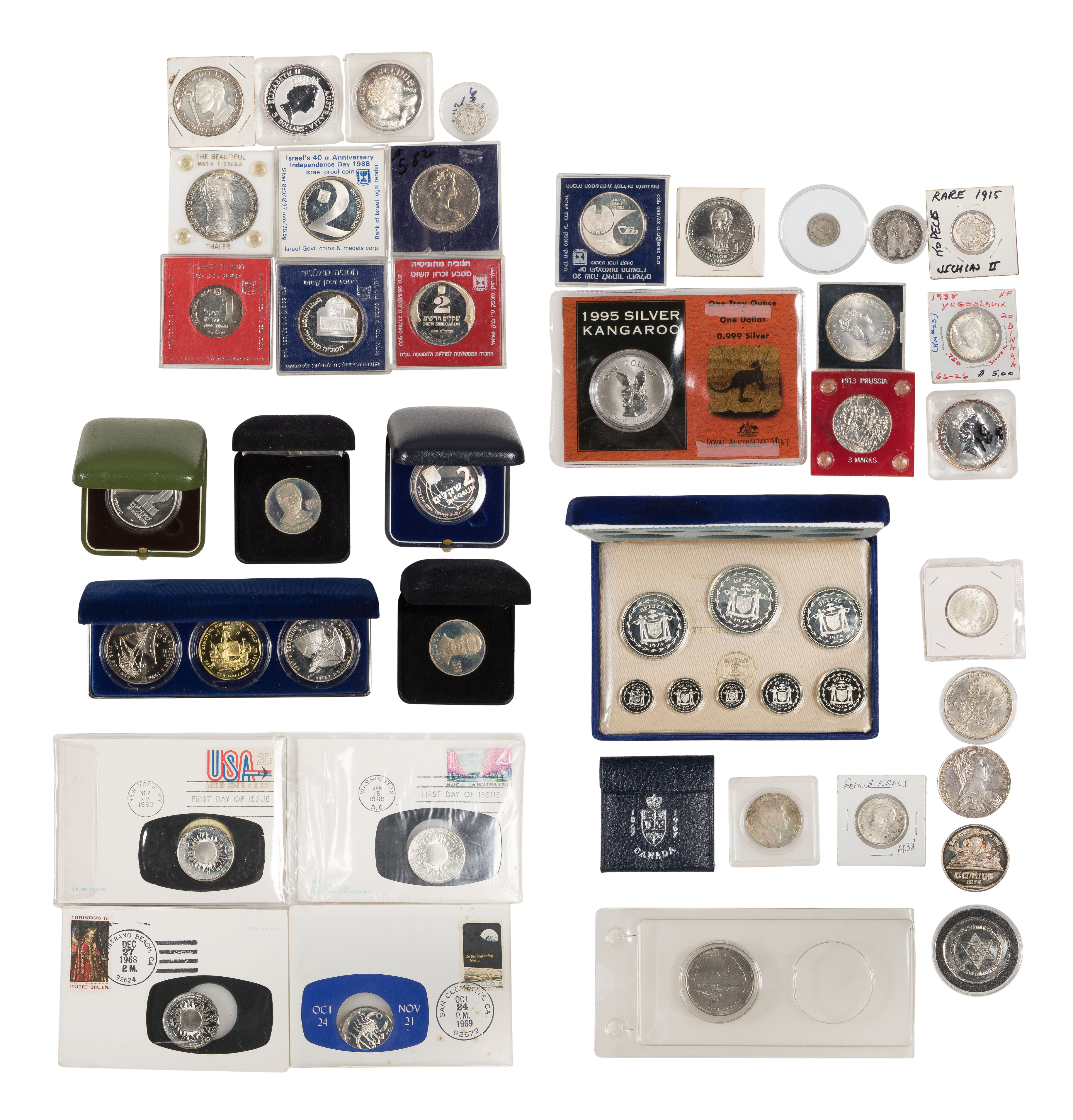 Approximately (35) coins of varying purity, from countries including Russia, Yugoslavia, England, New Zealand and Israel, most in cases, slabs or boxes
