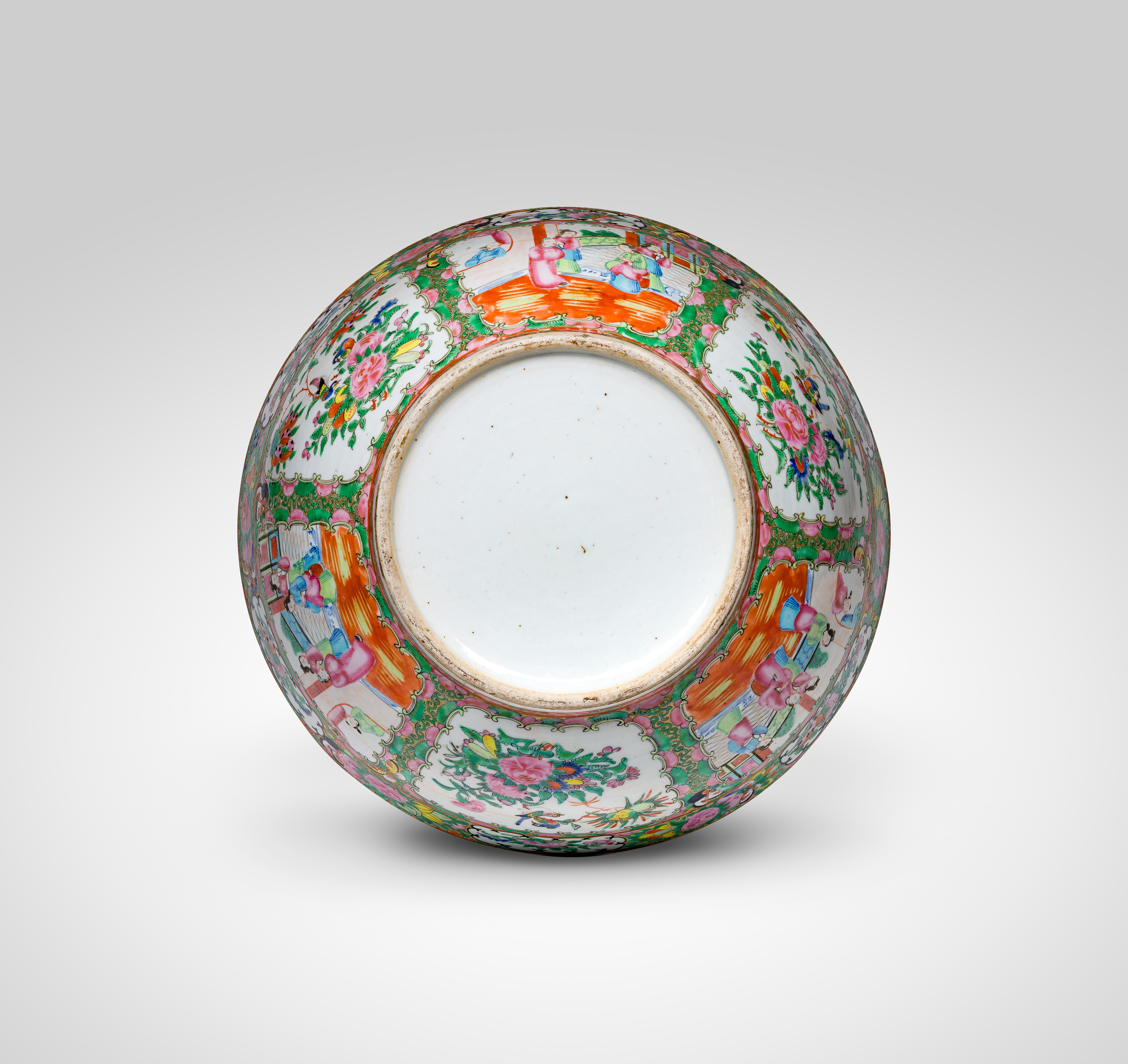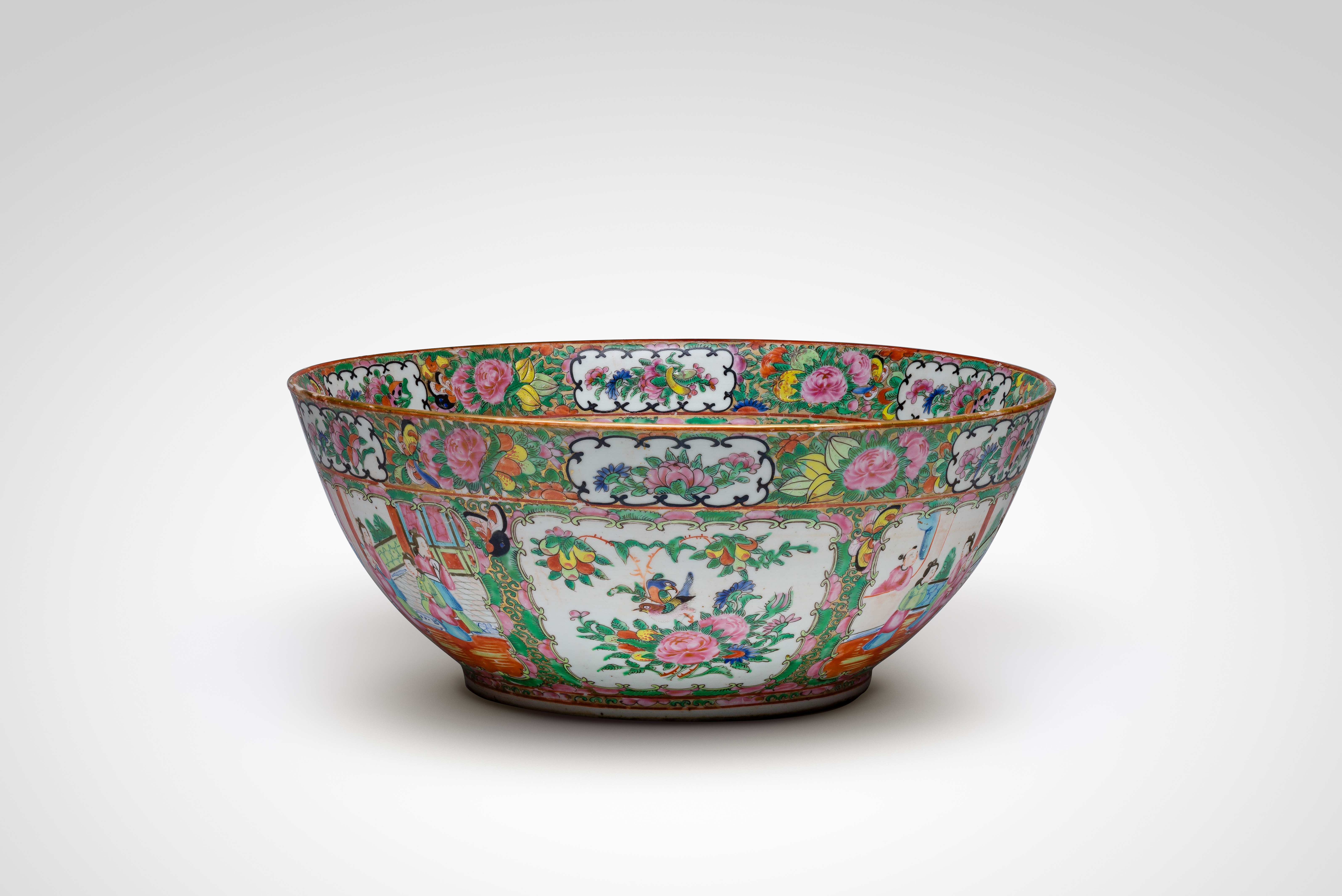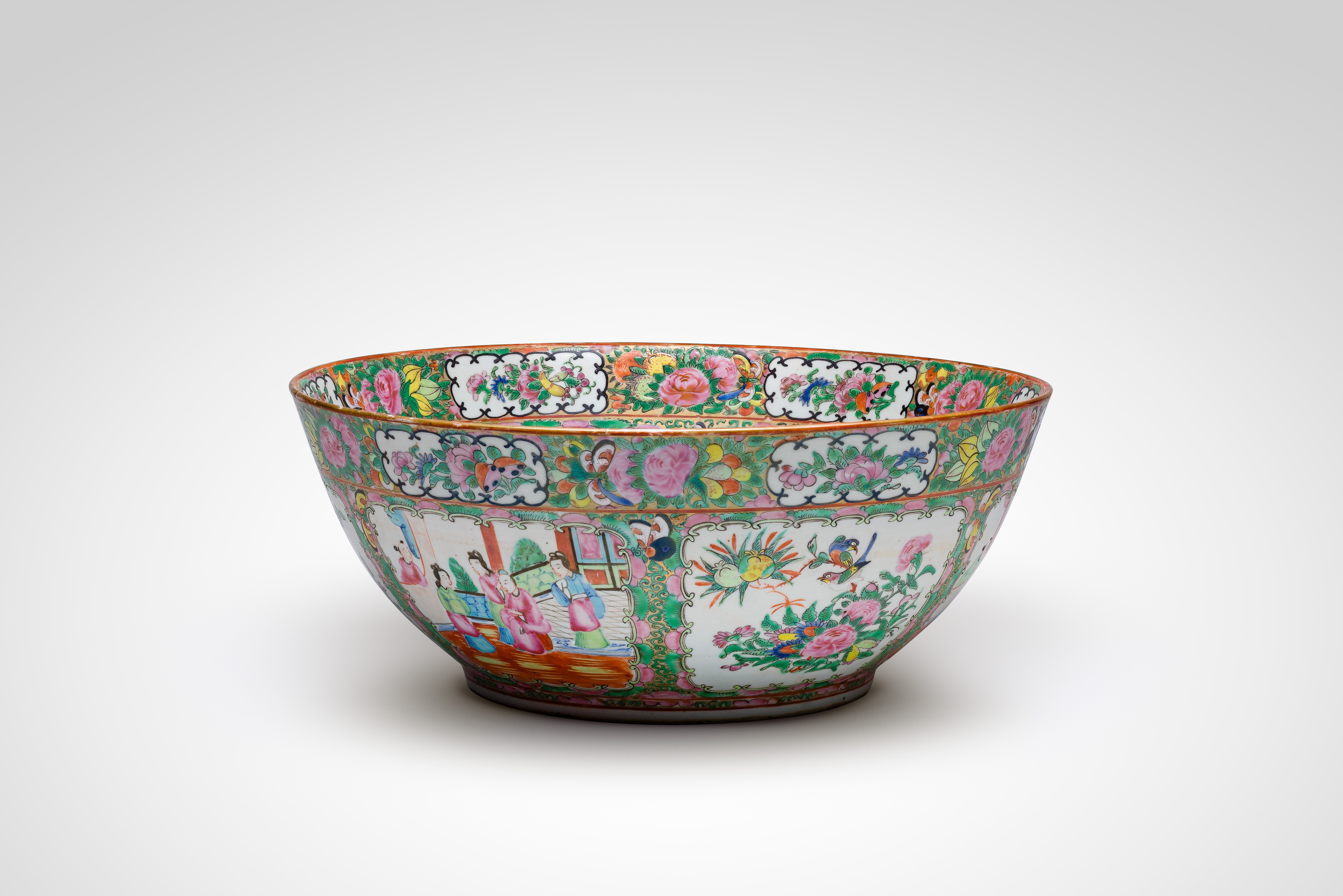 Having alternating panels of courtly figures, birds and peonies to interior and exterior, unmarked