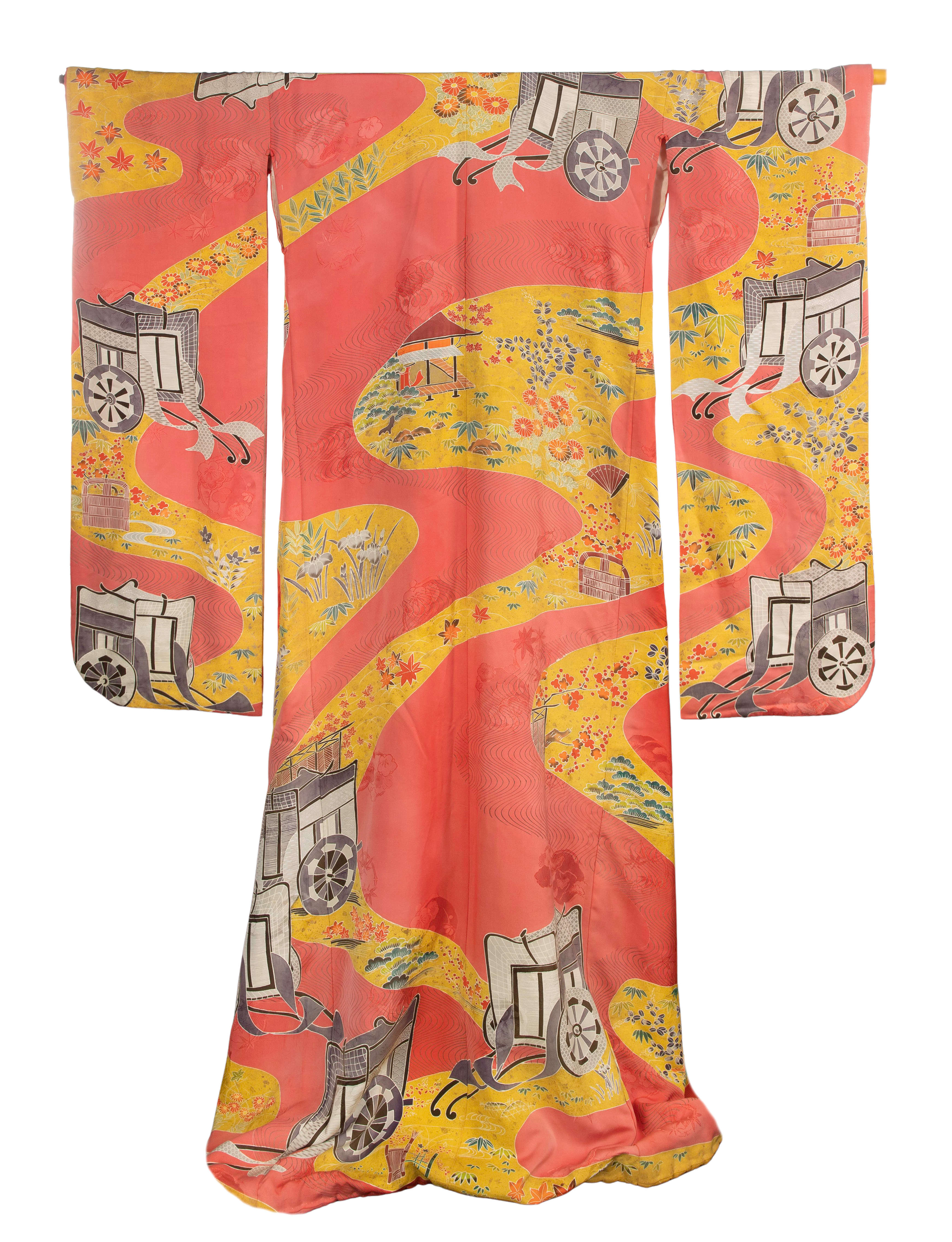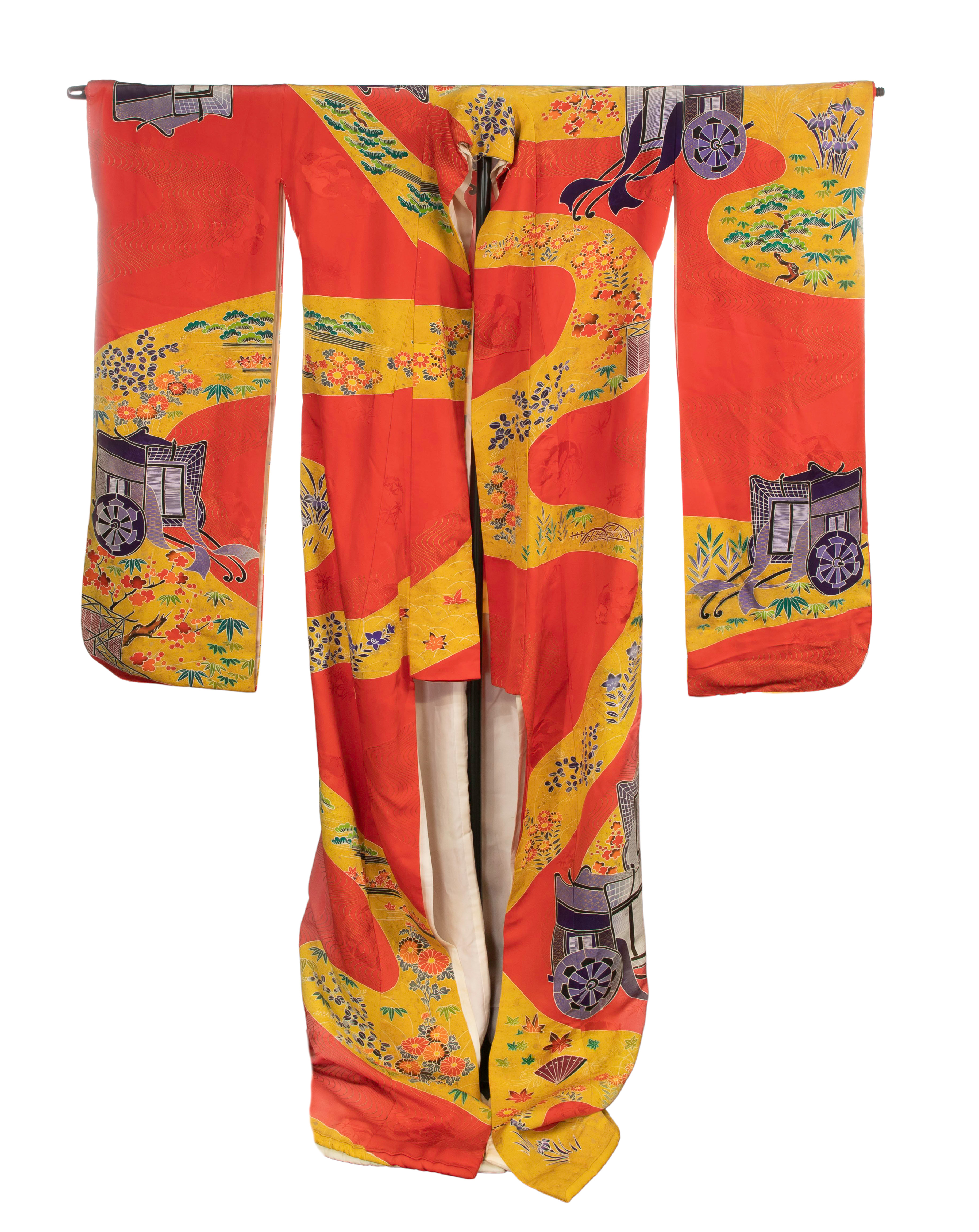 A formal outer kimono typically worn by a bride, having hand-stitched multi-color silk brocade