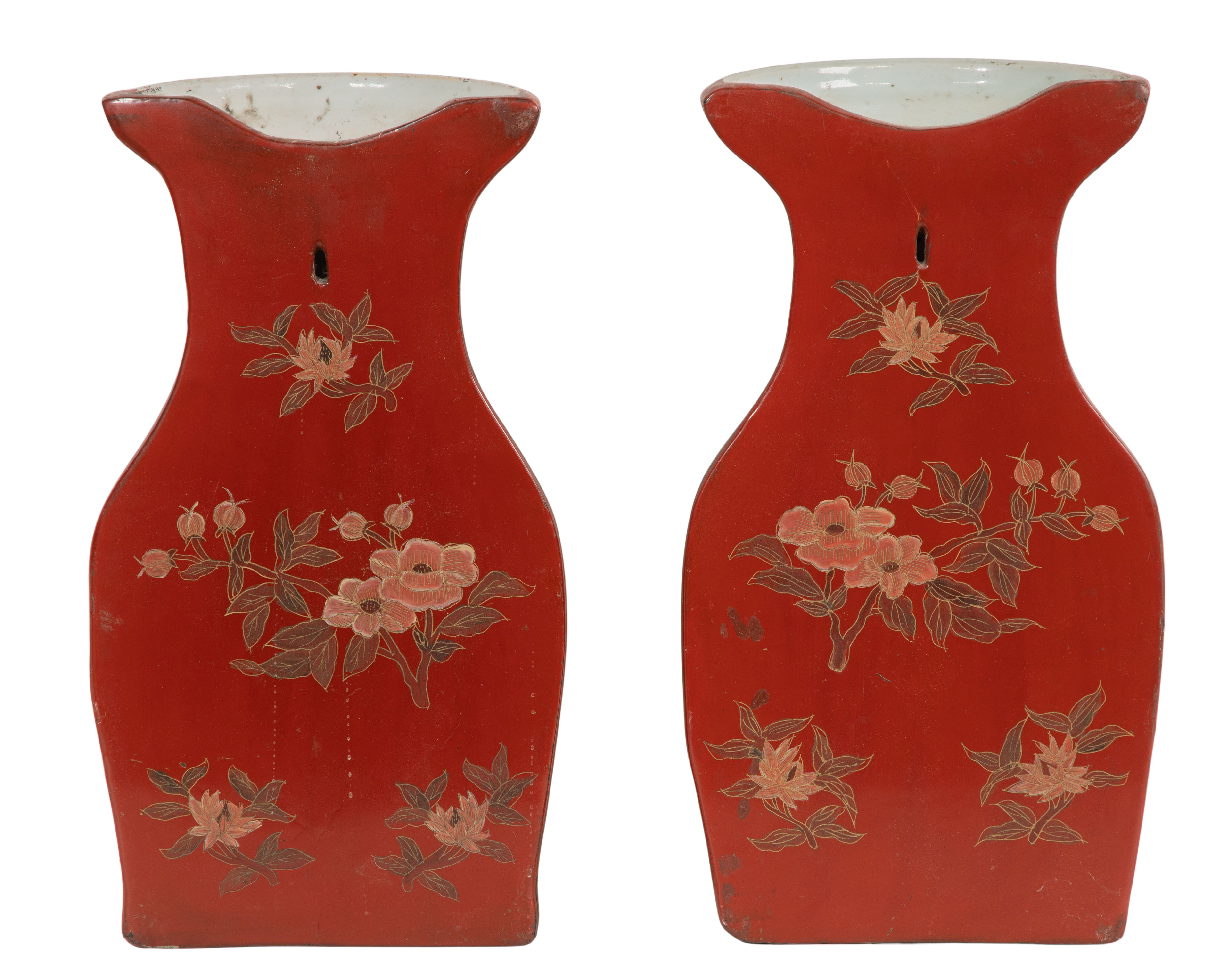 (2) items including a blue and white double happiness vase having a flared rim and neck, a bulbous body and a red painted base edge as well as a celadon color vase having red painted edge and blue scholar’s objects such as feather plumes, a table and other vessels, both having red painted floral flat backs