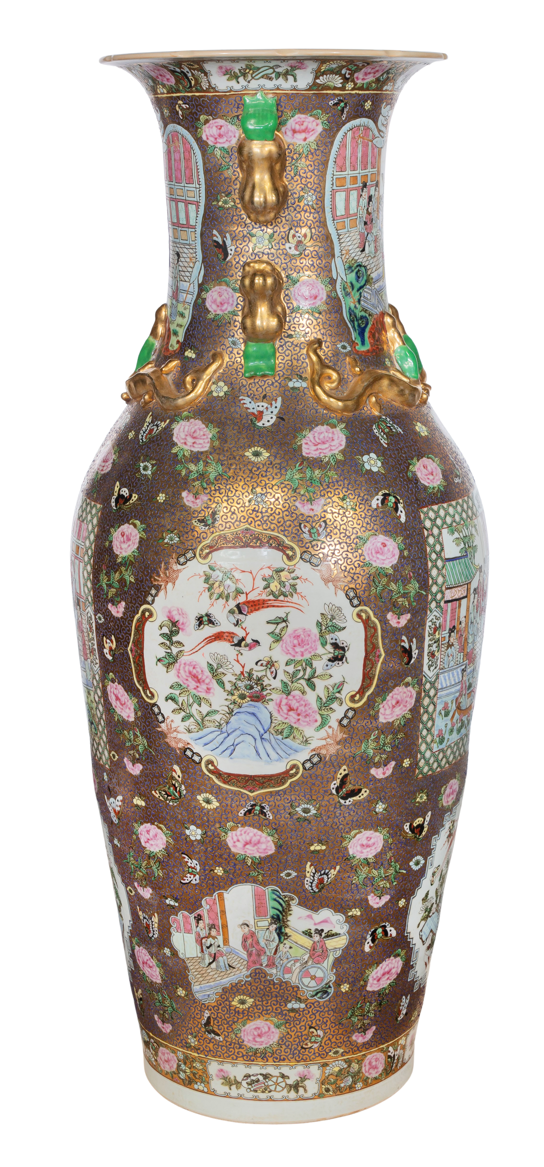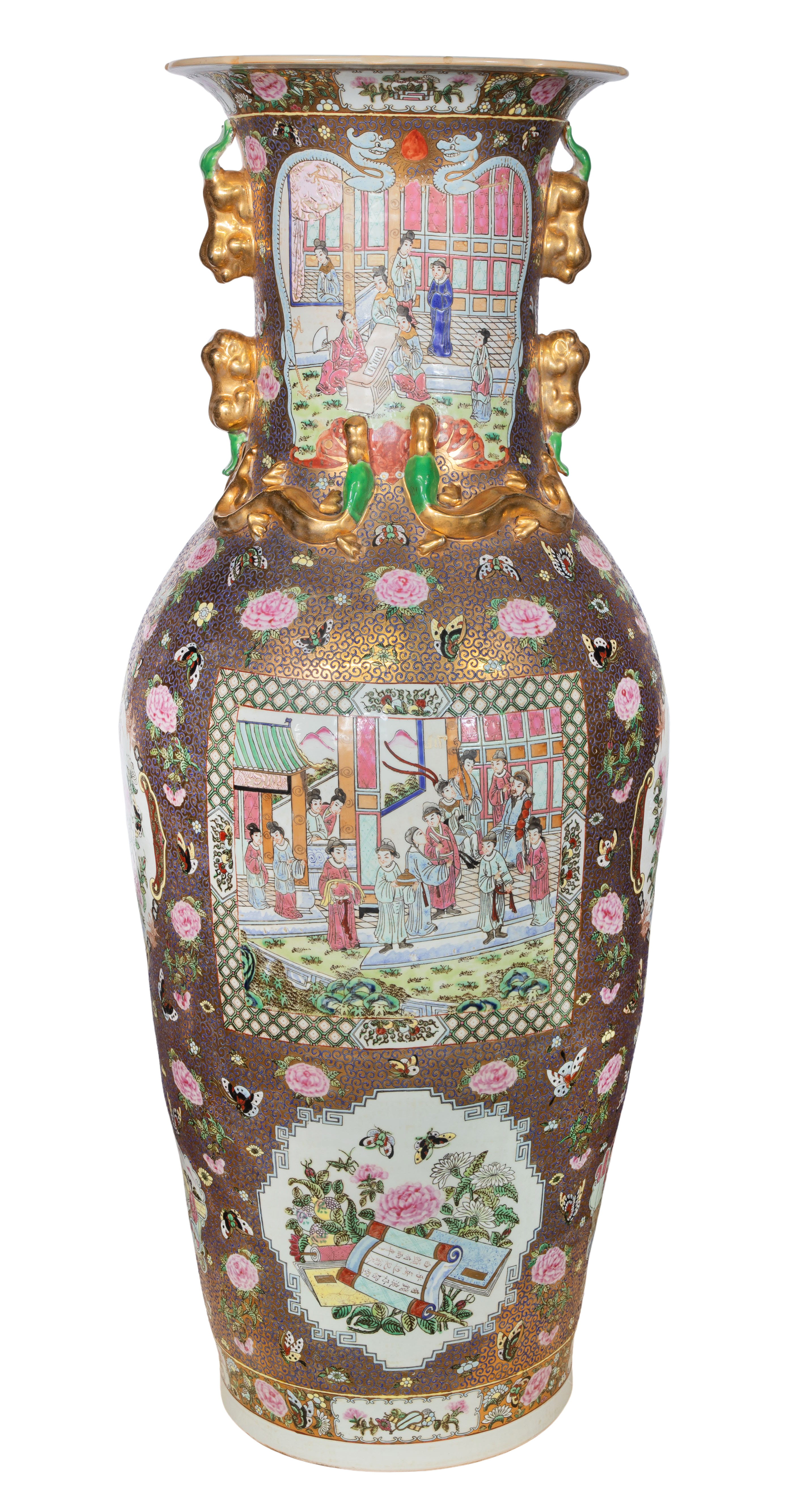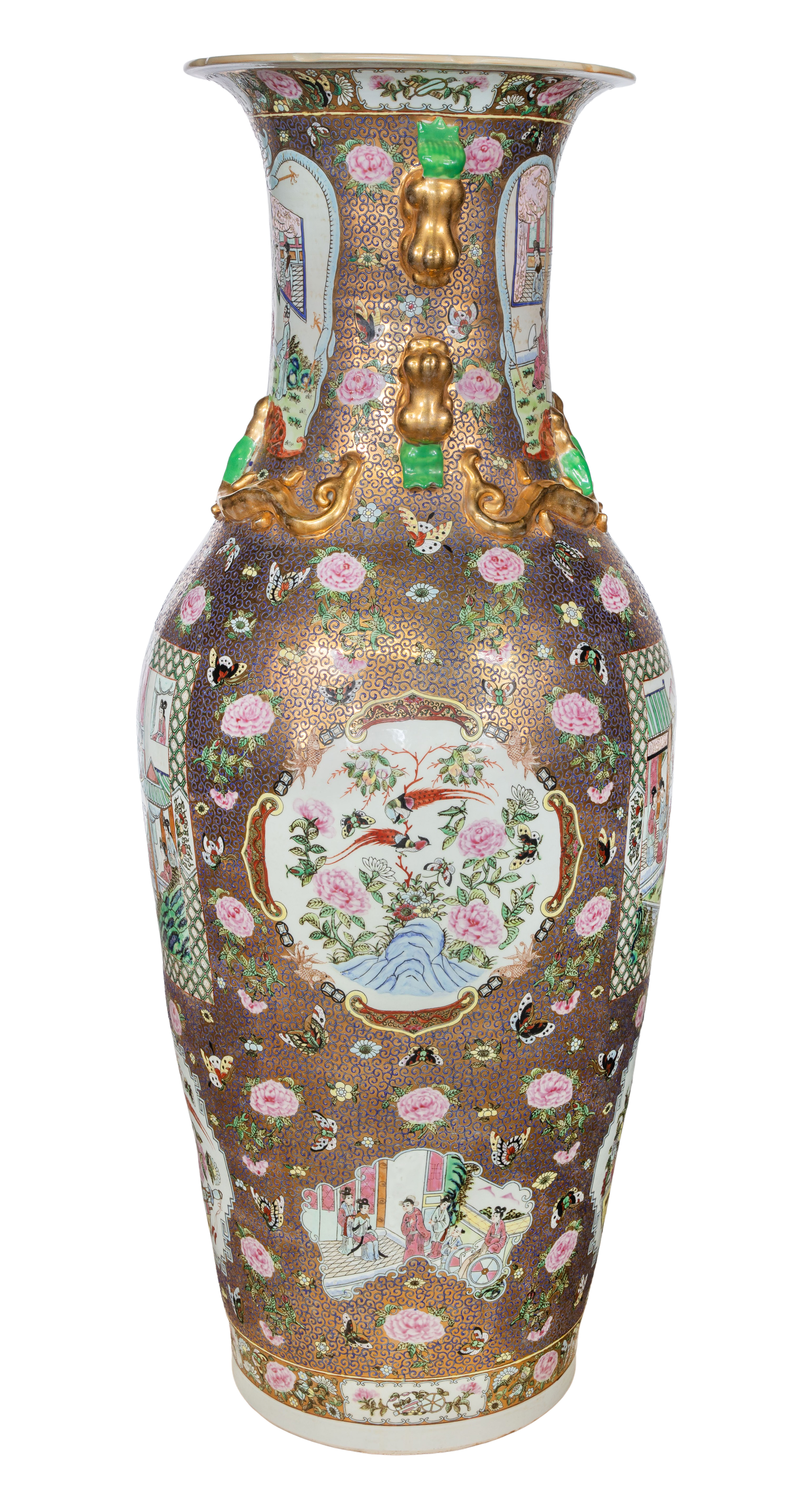 Having enameled decoration overall, including pictorial cartouches on white ground surrounded by a scroll-covered gilt ground having rose, butterfly and auspicious symbols throughout, gilt foo lion handles and relief dragons on shoulders