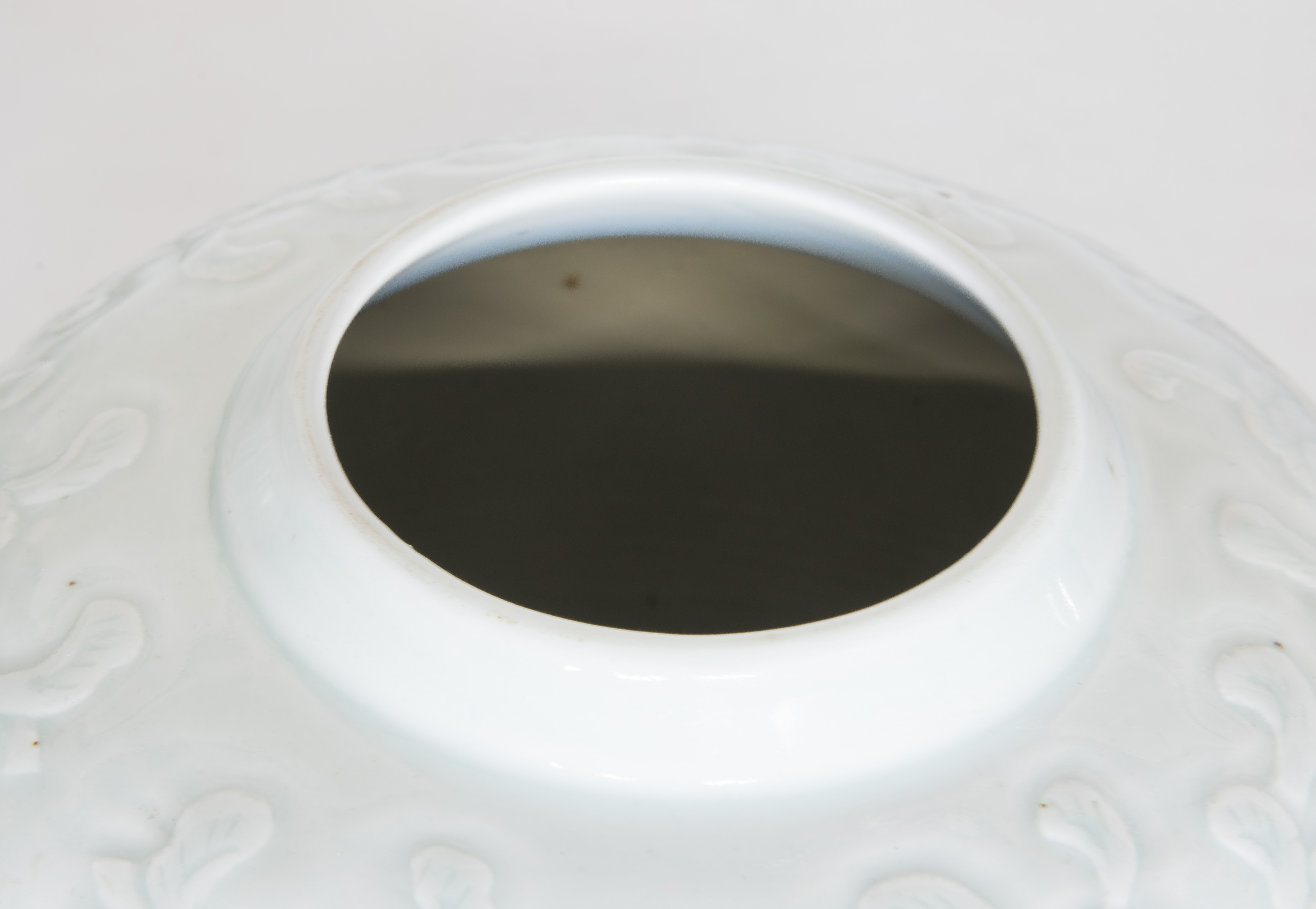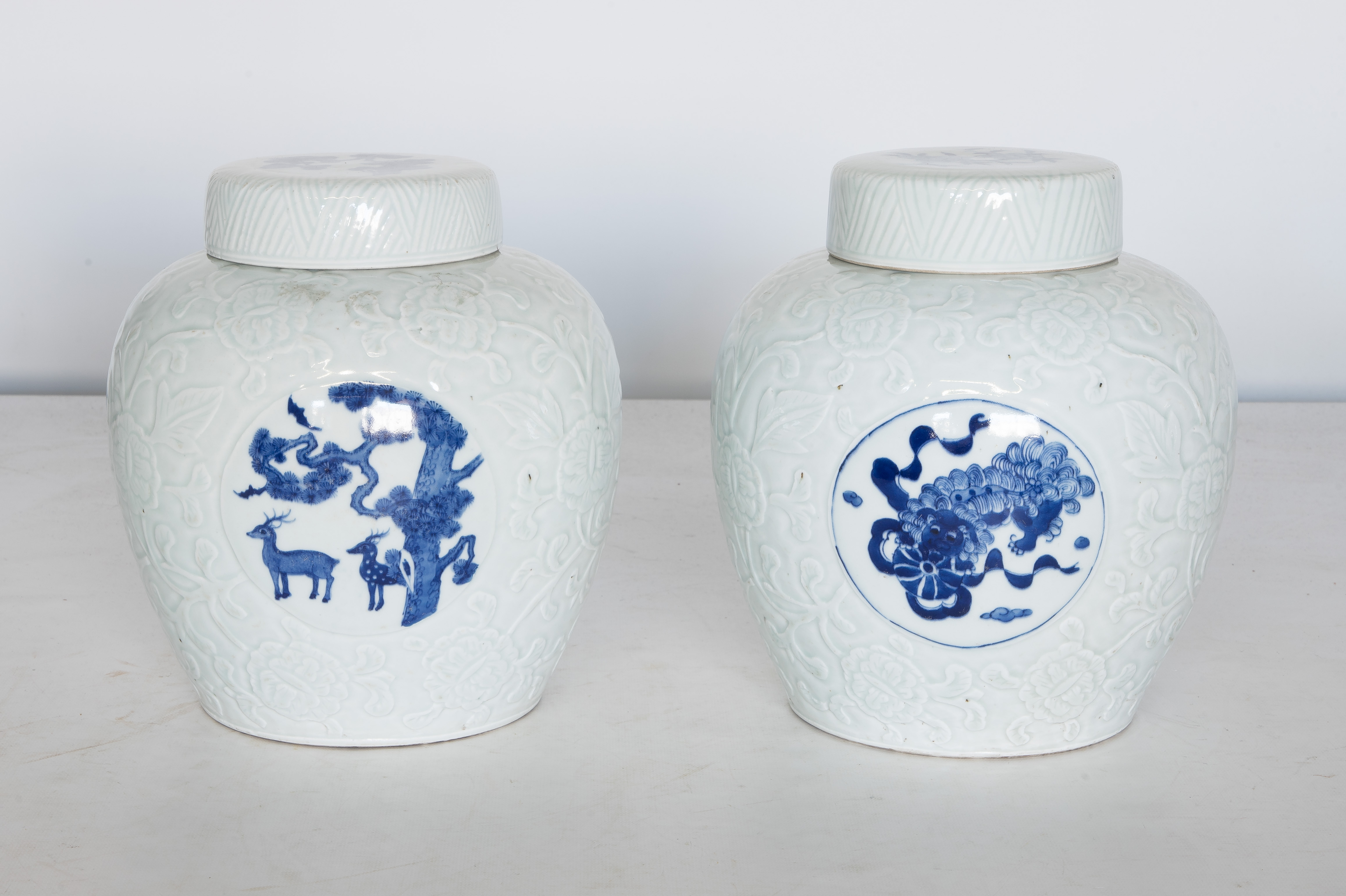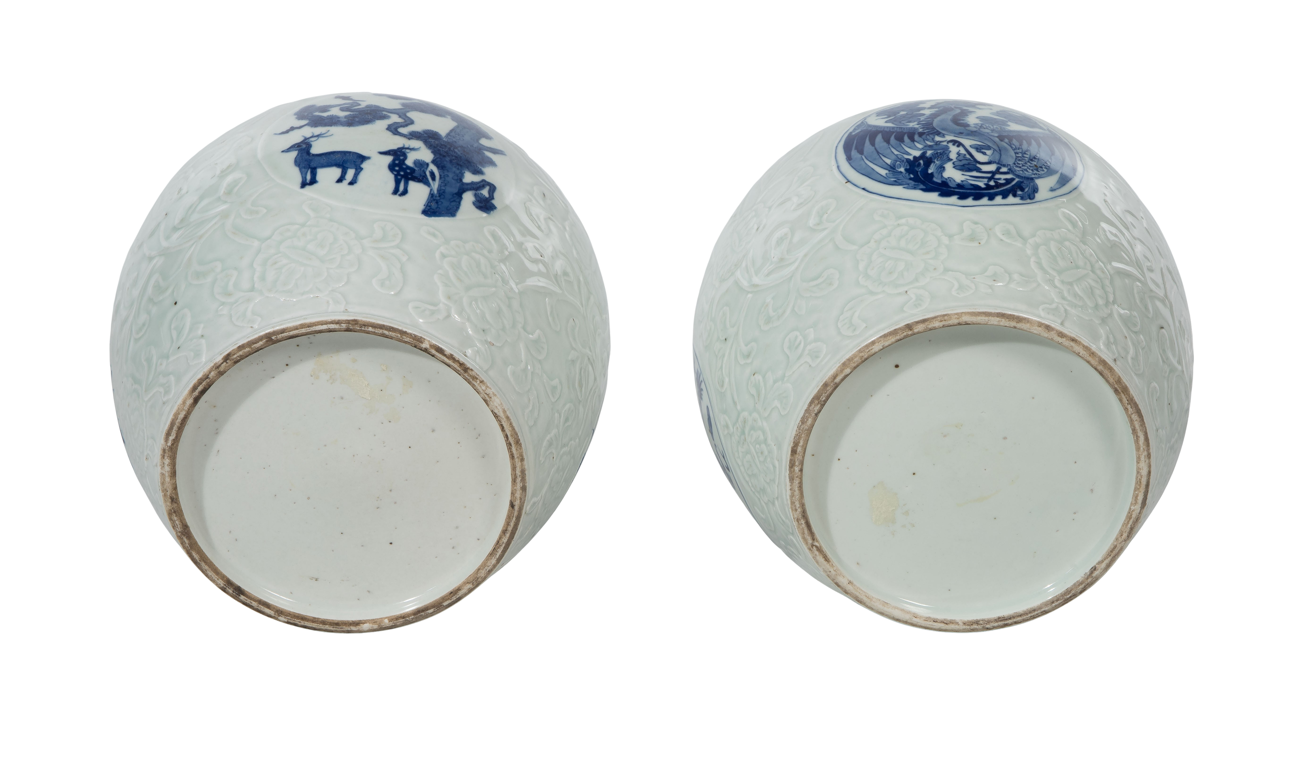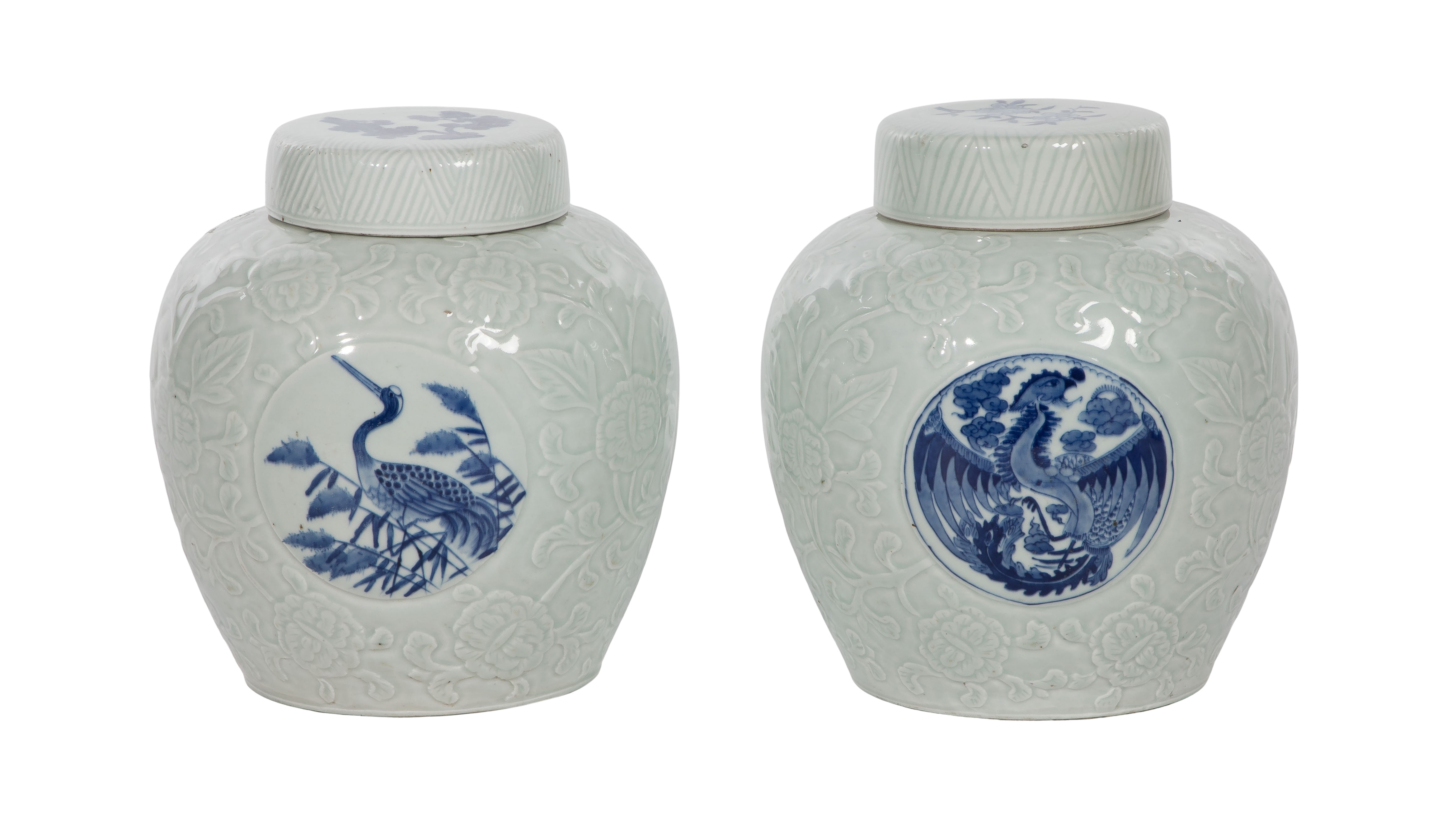 A similar pair of white lidded jars having an embossed foliate ground and cobalt underglaze depicting birds and flowers