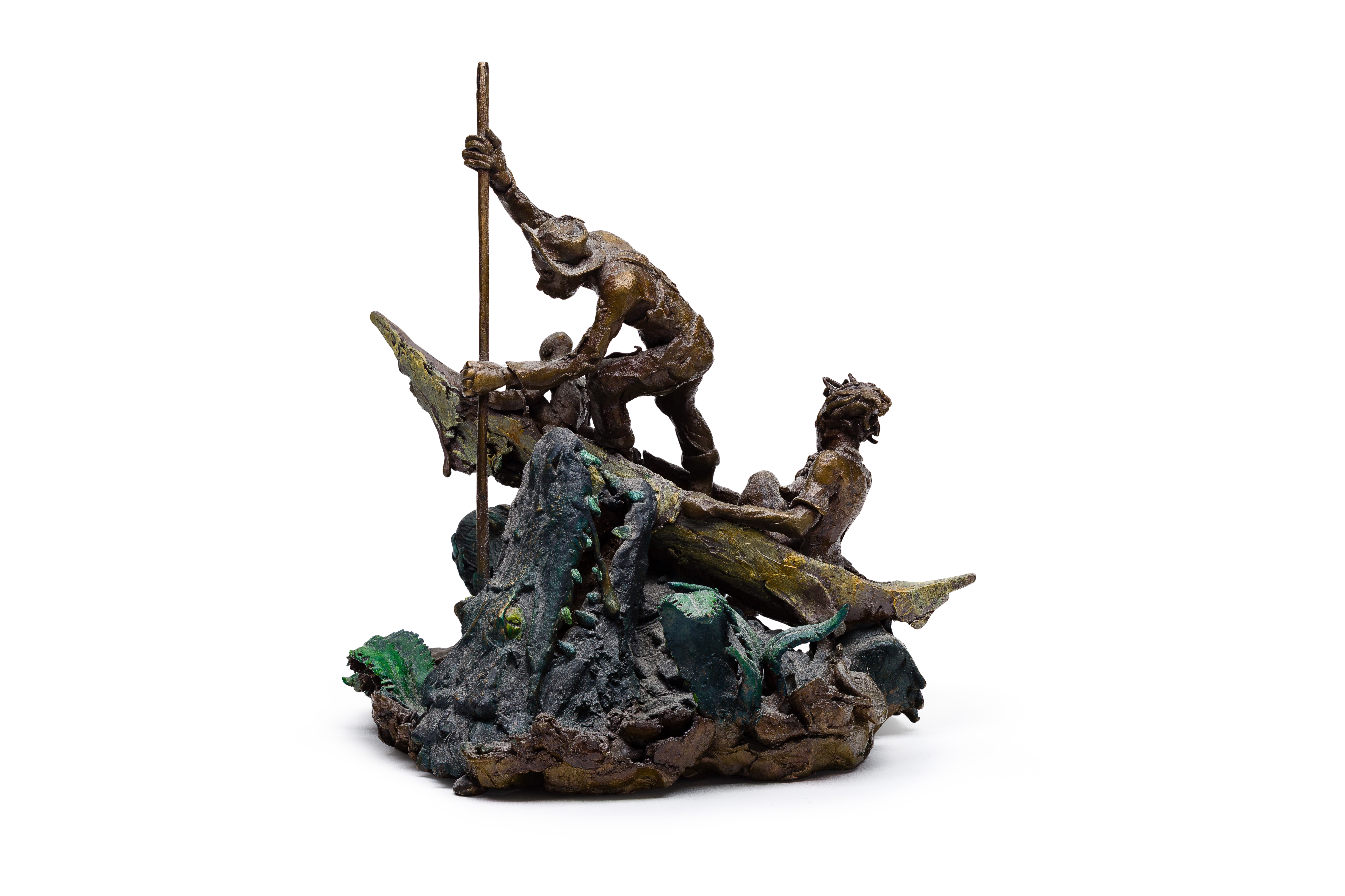 Undated, cast signature on circular element on back, depicting three men in a canoe fighting off two crocodiles