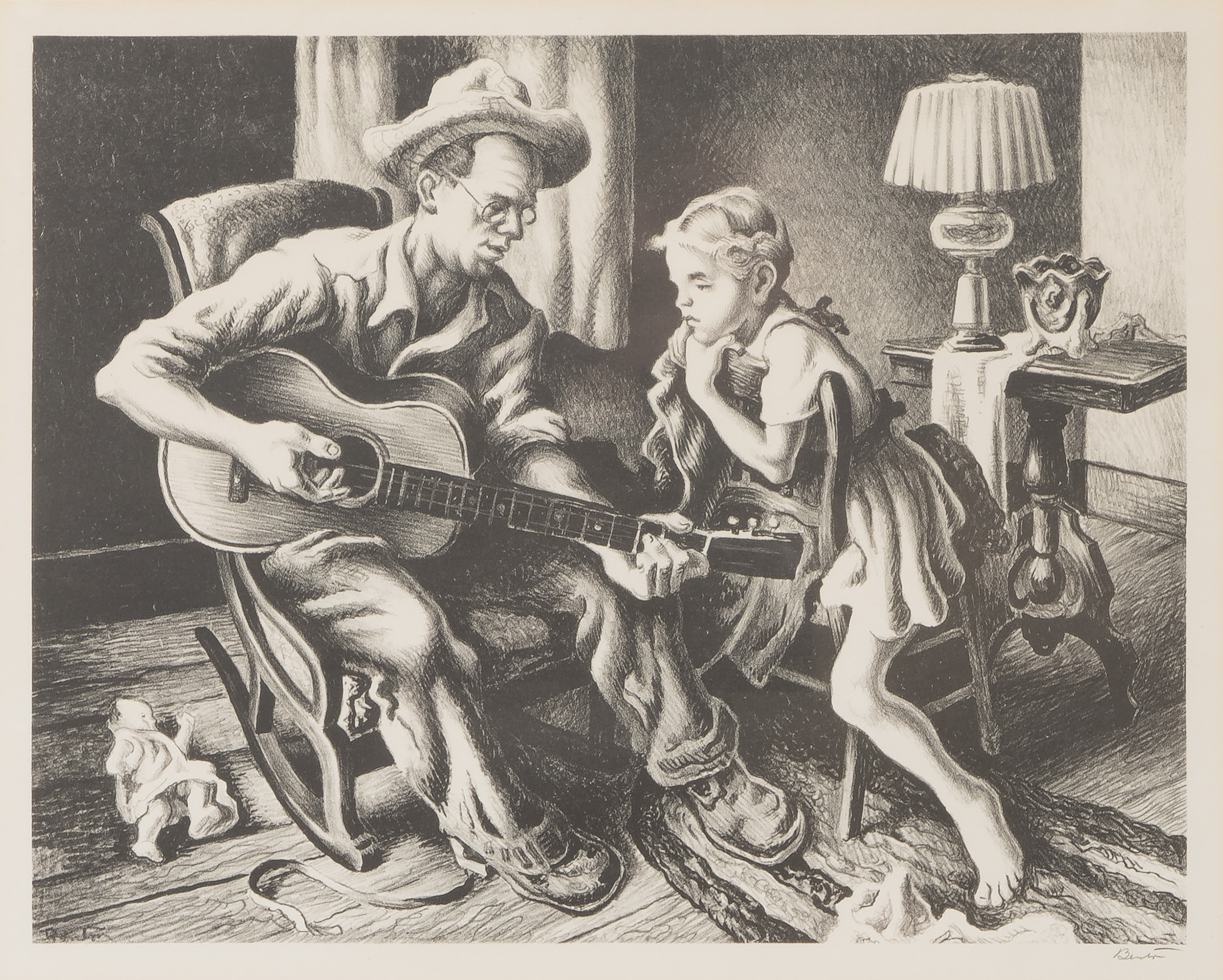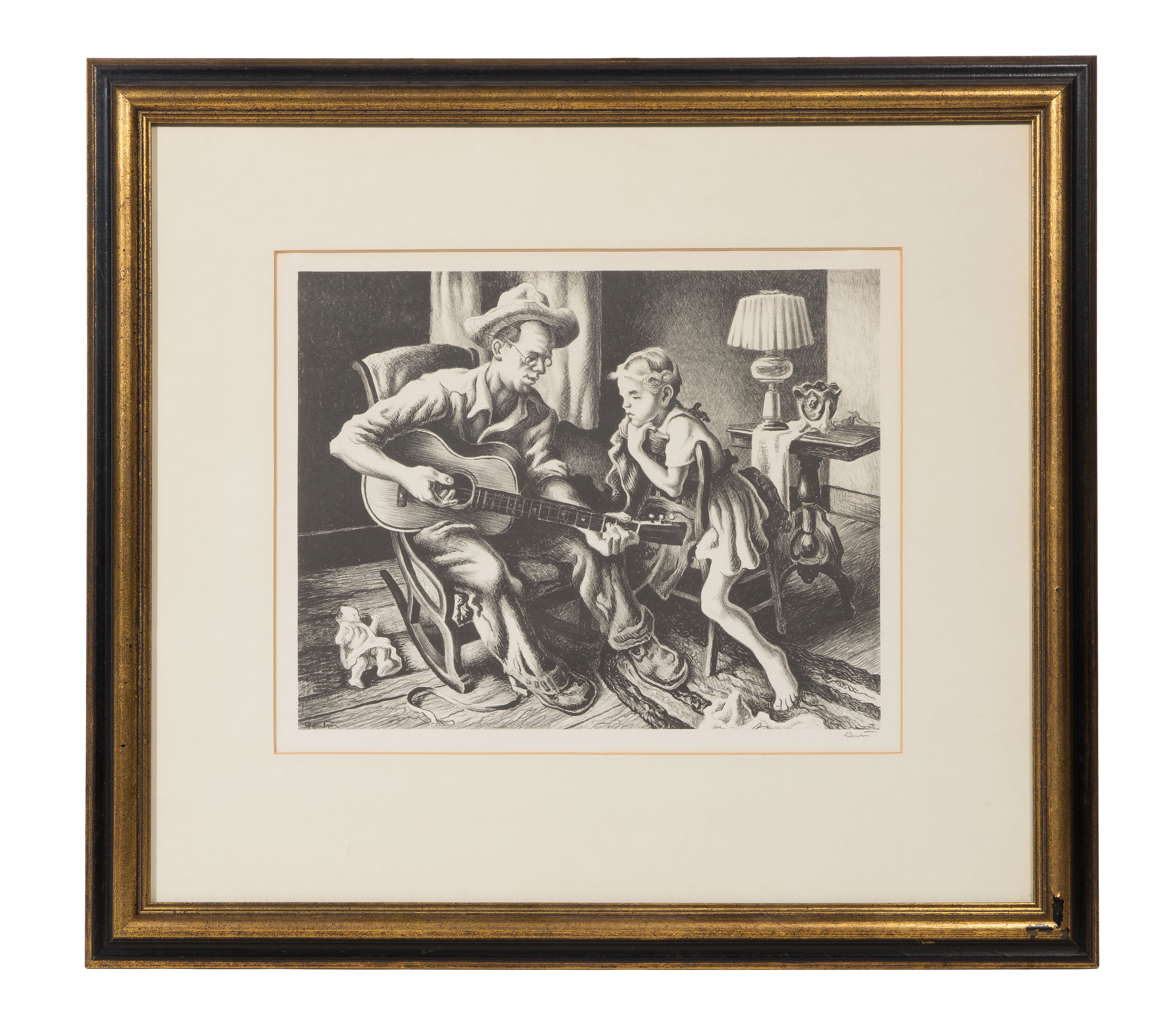1943, pencil signed, depicting celebrated folk singer E. Gale Huntington teaching his young daughter to play the guitar, matted under acrylic in a black and gold-tone frame; together with the hardcover book ‘The Lithographs of Thomas Hart Benton’