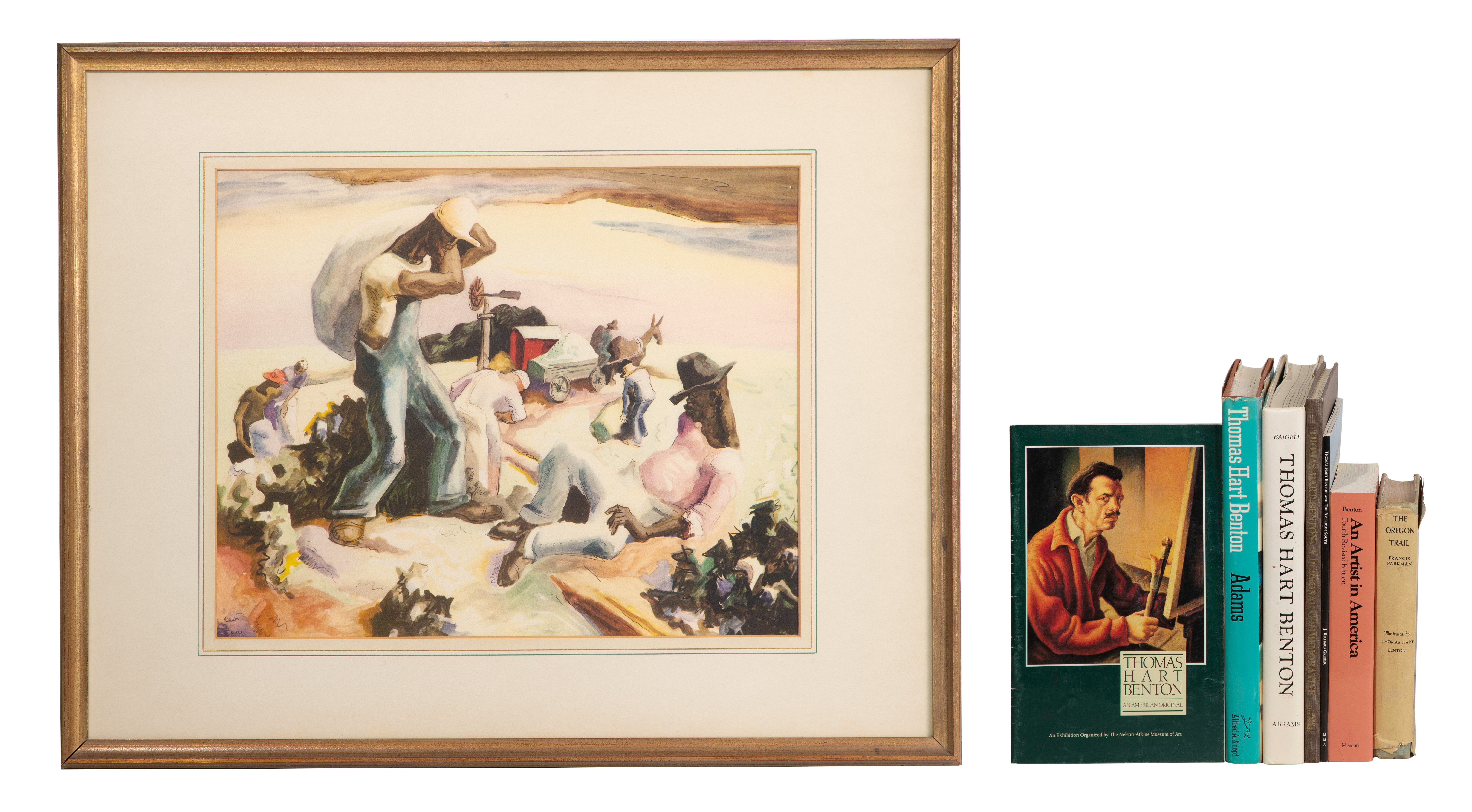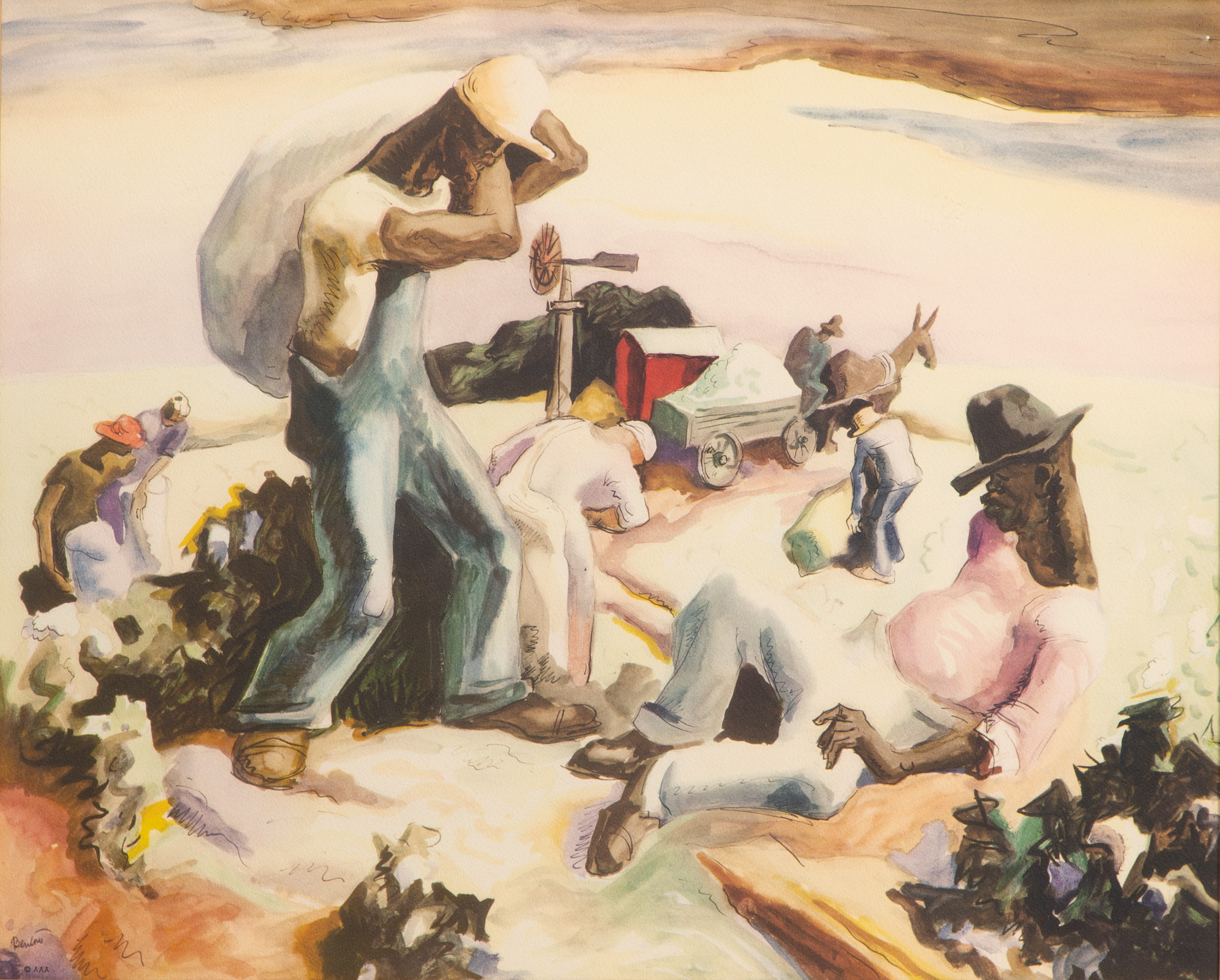 Undated, printed signature only, copyrighted AAA, depicting field hands picking and bagging cotton, matted under glass in a wood frame: together with (7) biographies on the artist in soft and hard cover