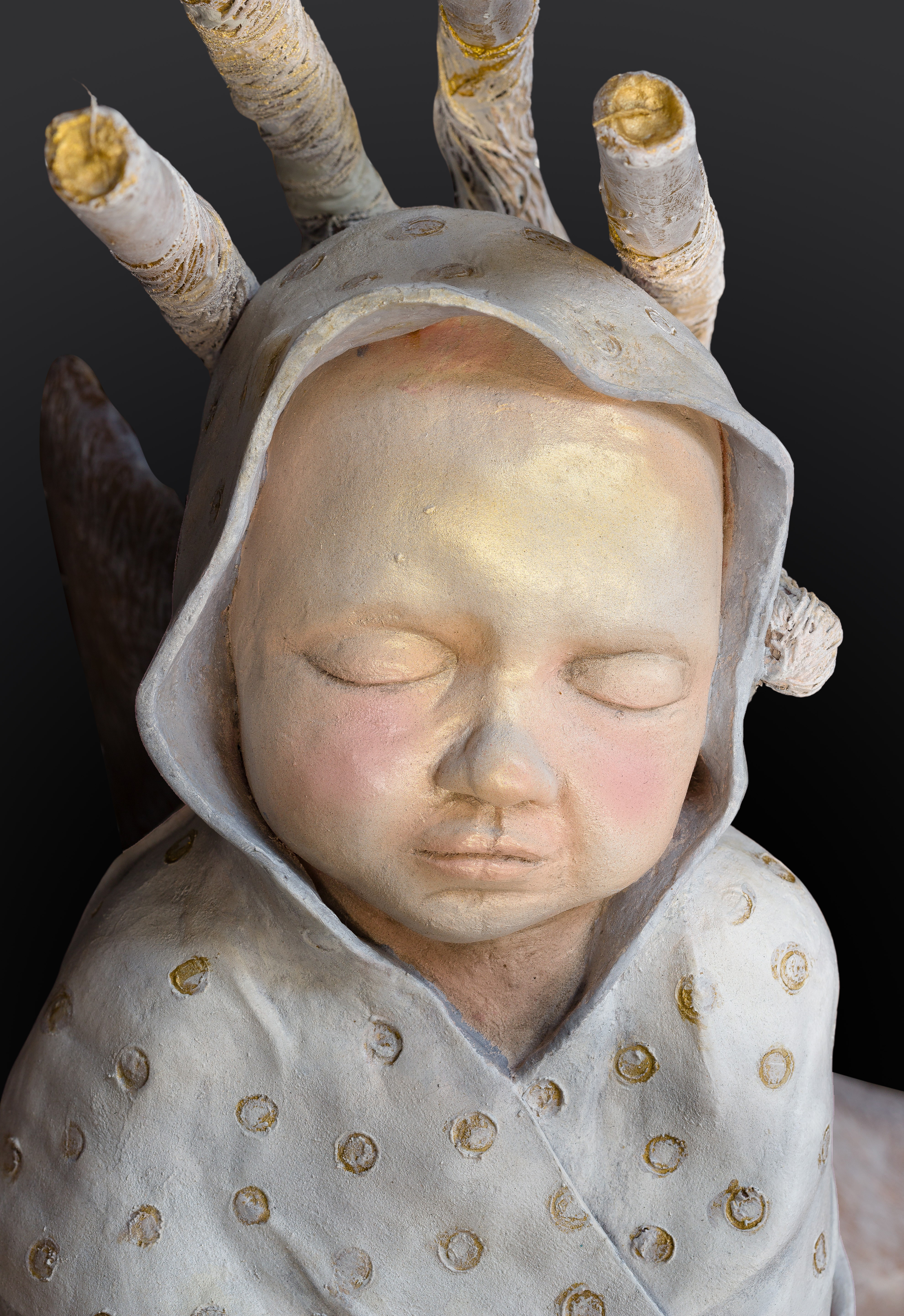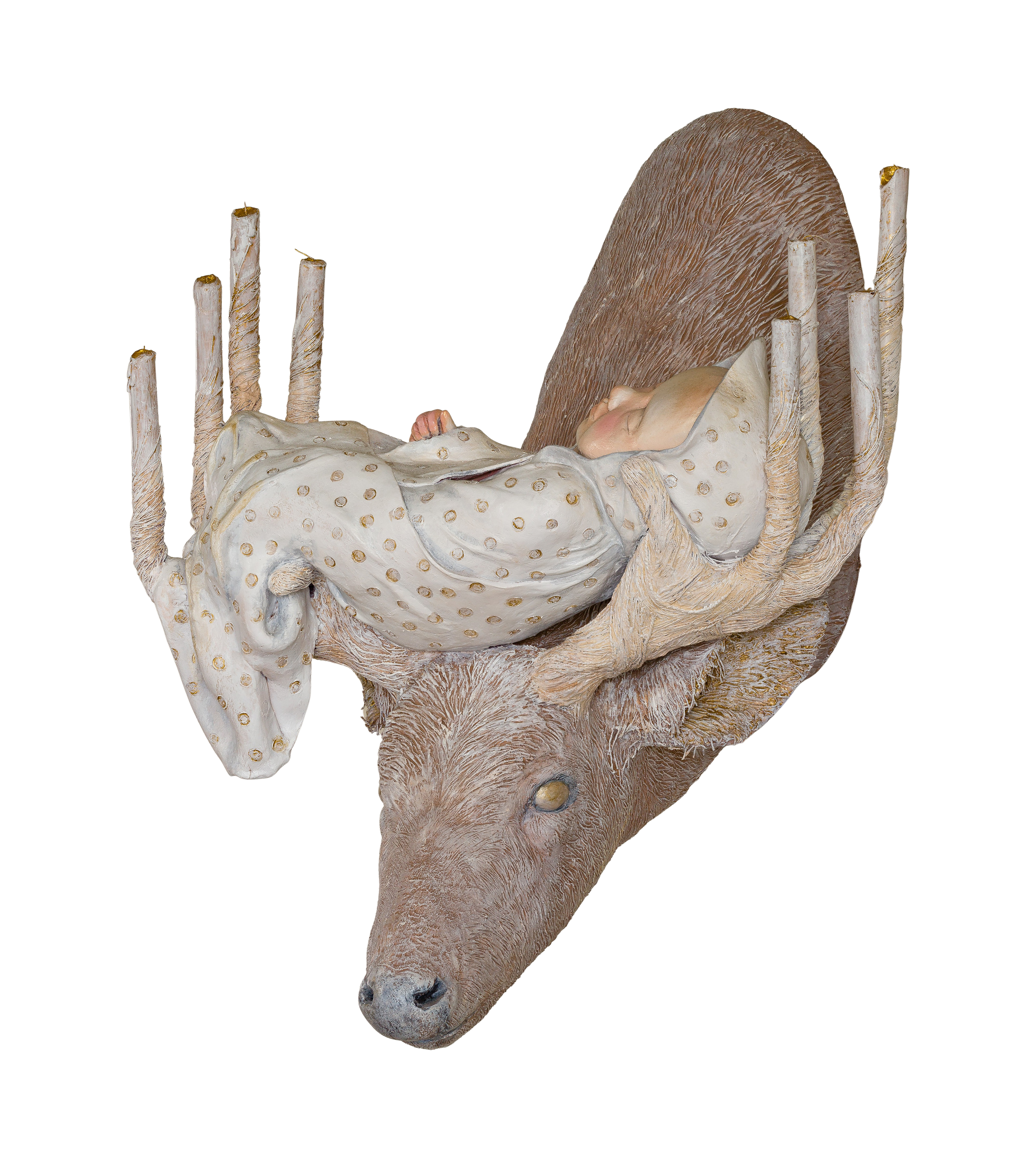 Depicting a deer having antlers culminating in faux candles, which support a sleeping infant