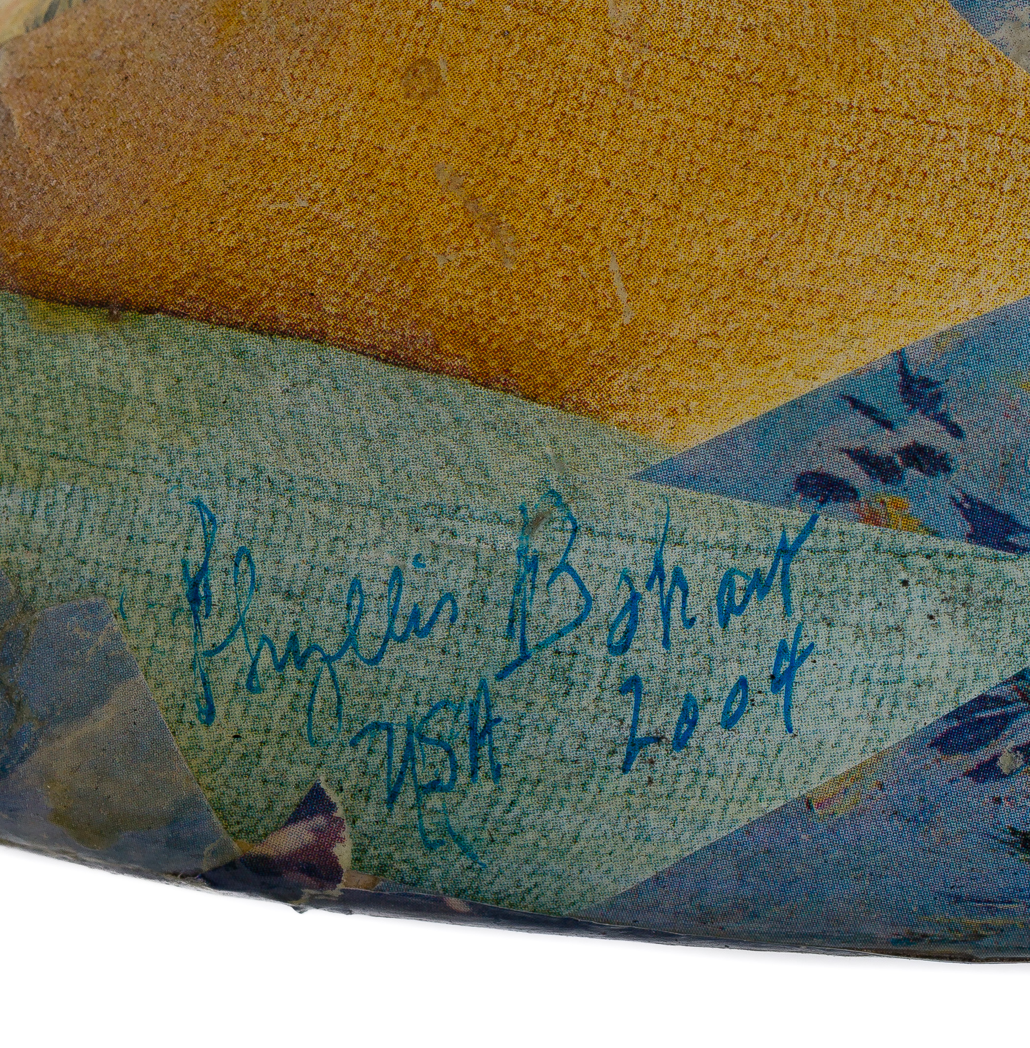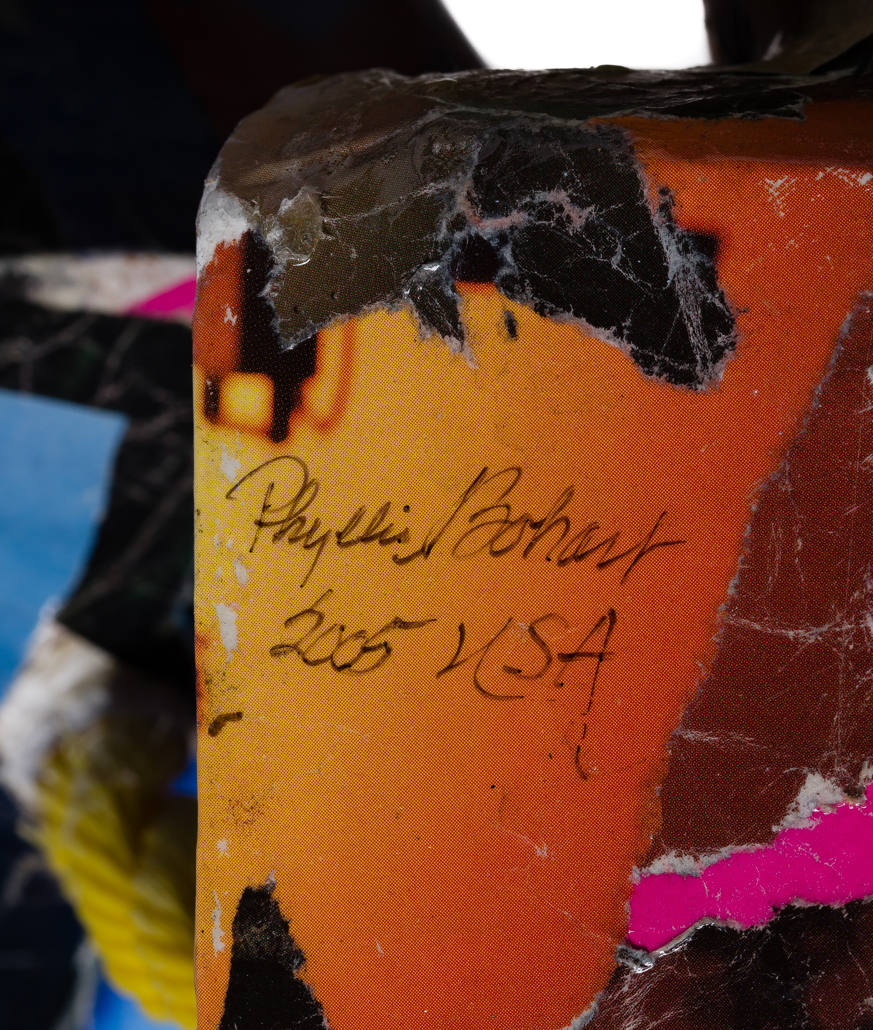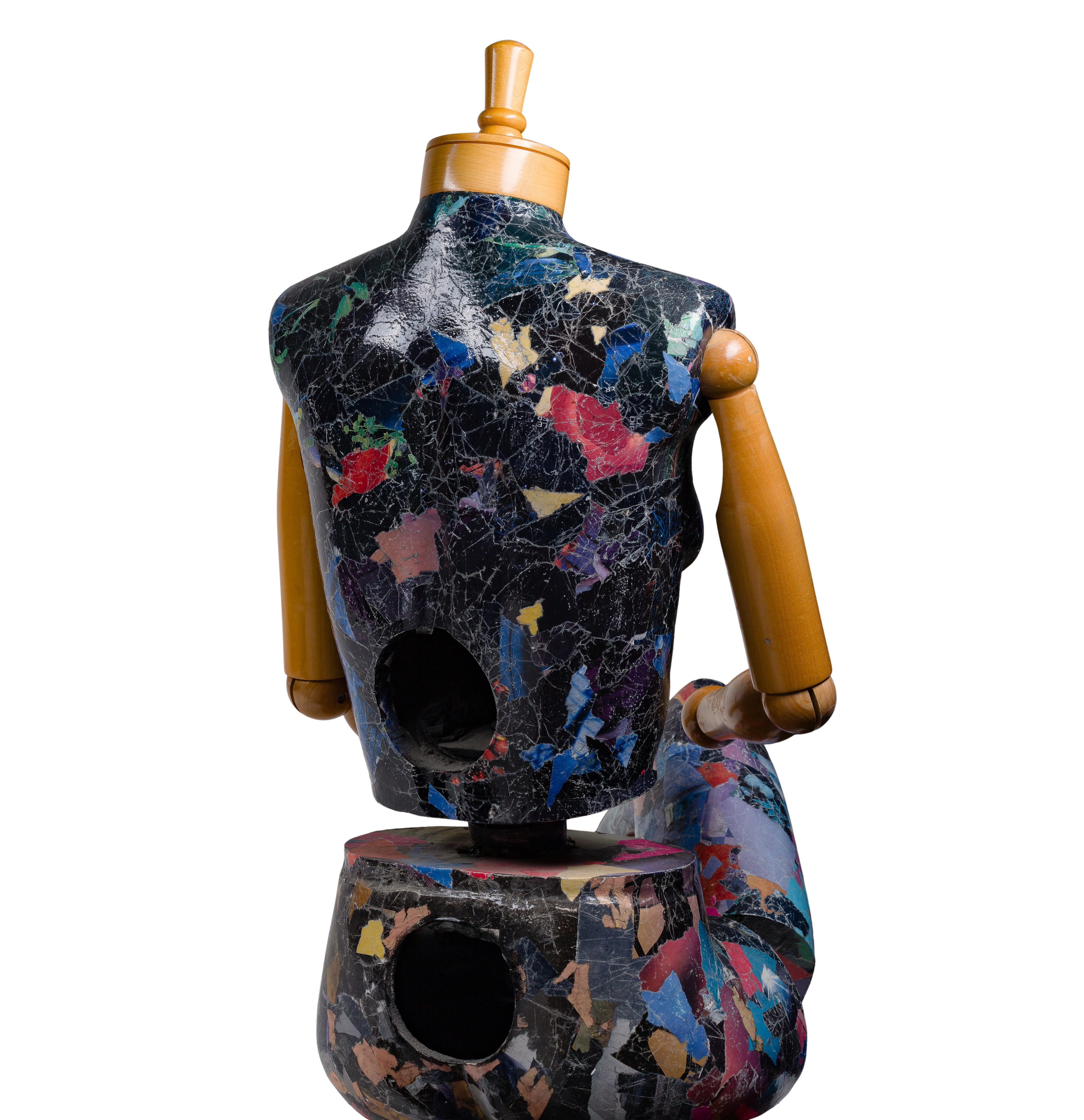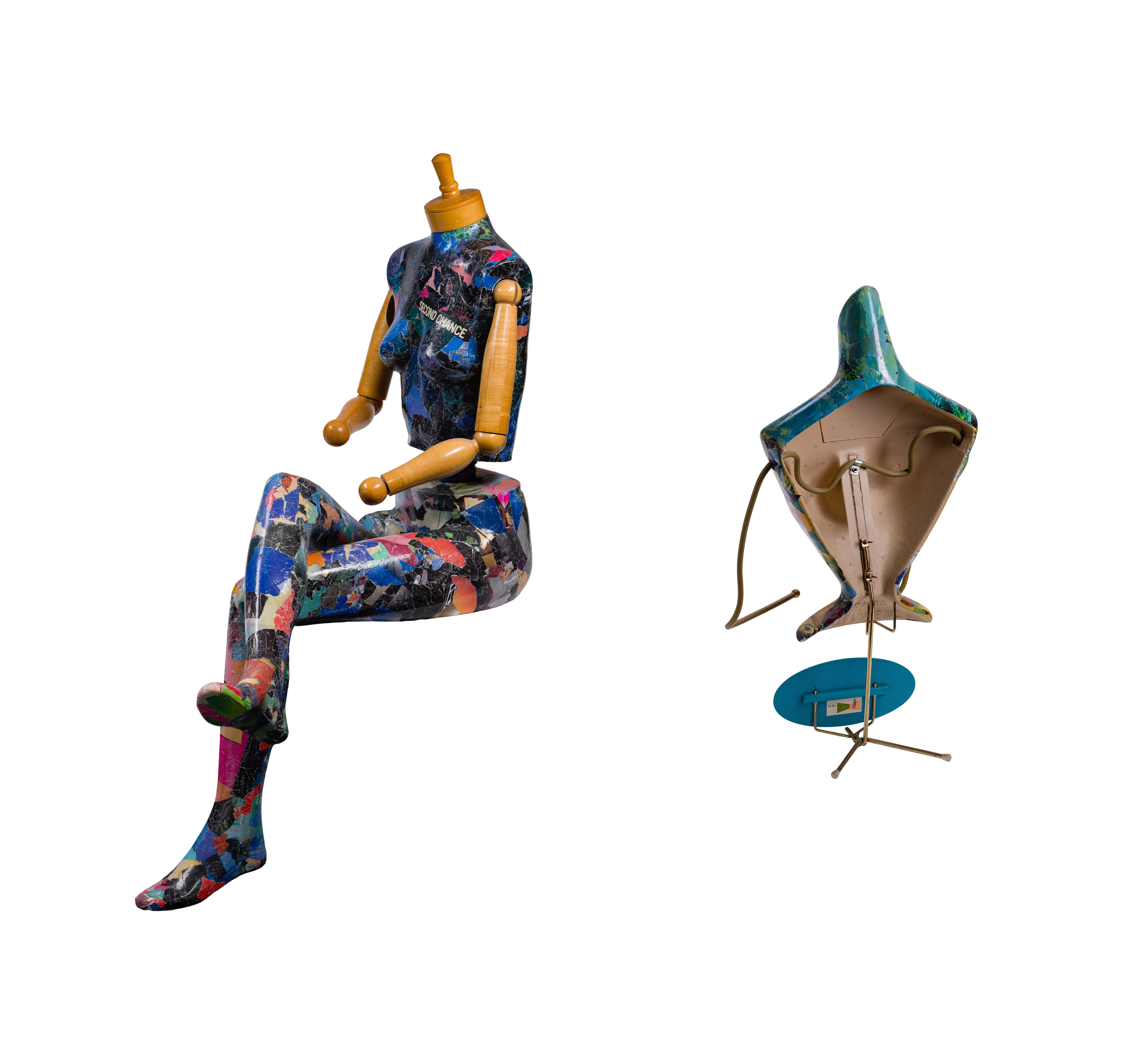 (2) items, the larger signed underside, both being repurposed manikins having multi-color decoupage paper, one having apparent title ‘Second Chance’ on front being a seated figure having ball-jointed turned wood arms and rope-tethered adjustable leg, the other being a stand-mounted torso retaining an advertising sign reading ‘Lead the Ship’n Shore Life’